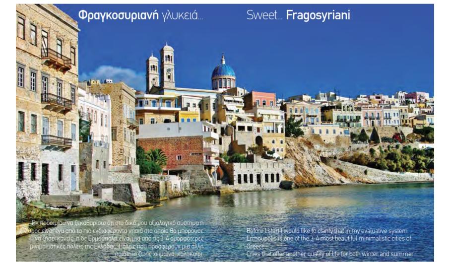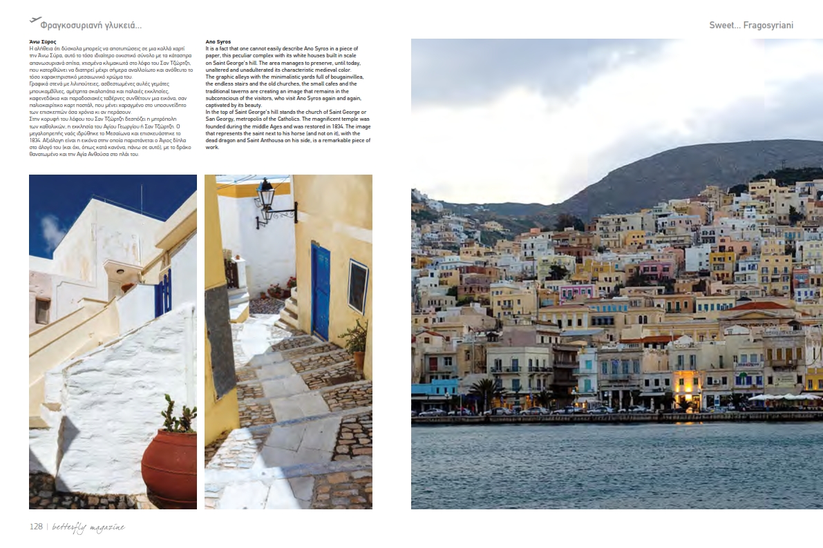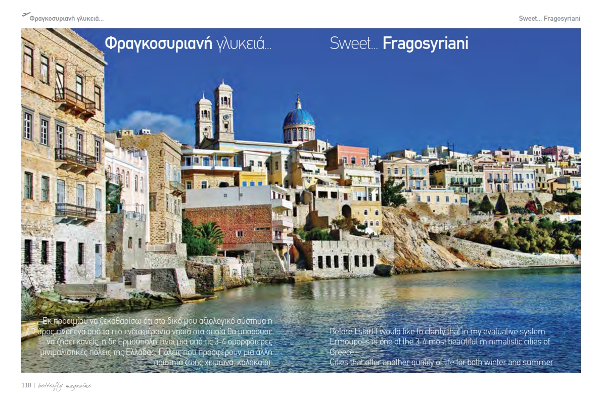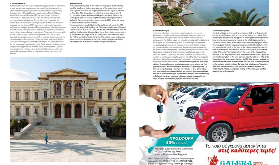 Το αφιέρωμα προβάλλει τη Σύρο ως κεντρικό τουριστικό προορισμό και περιλαμβάνει πλούσιο και υψηλής αισθητικής φωτογραφικό υλικό, πλαισιωμένο με αναφορές στα σημαντικά αξιοθέατα του νησιού και σε τοπικές επιχειρήσεις. Κατ’ αυτόν τον τρόπο, δίνεται η δυνατότητα σε εκατοντάδες χιλιάδες επιβάτες, Έλληνες και ξένους, σε όλους τους προορισμούς της Astra εντός και εκτός Ελλάδας, να γνωρίσουν το όμορφο νησί μας.