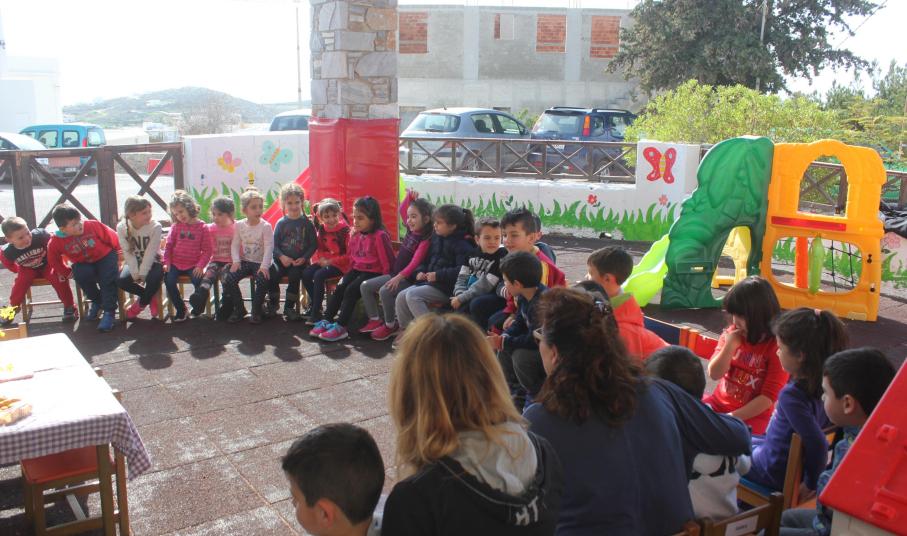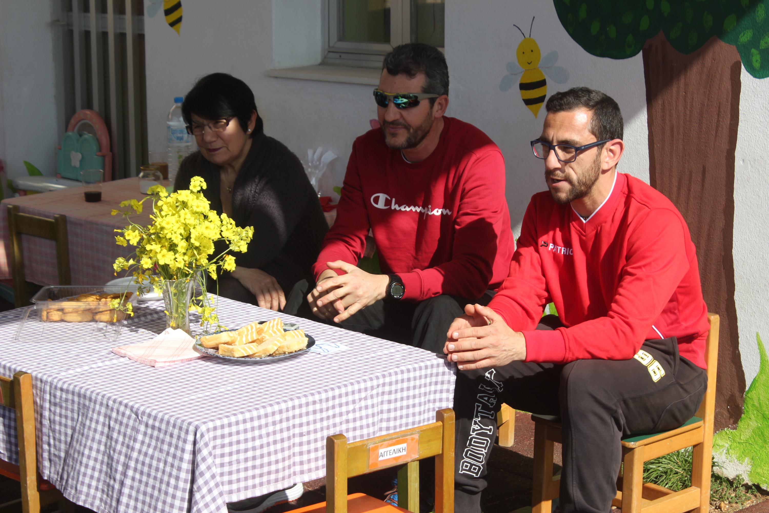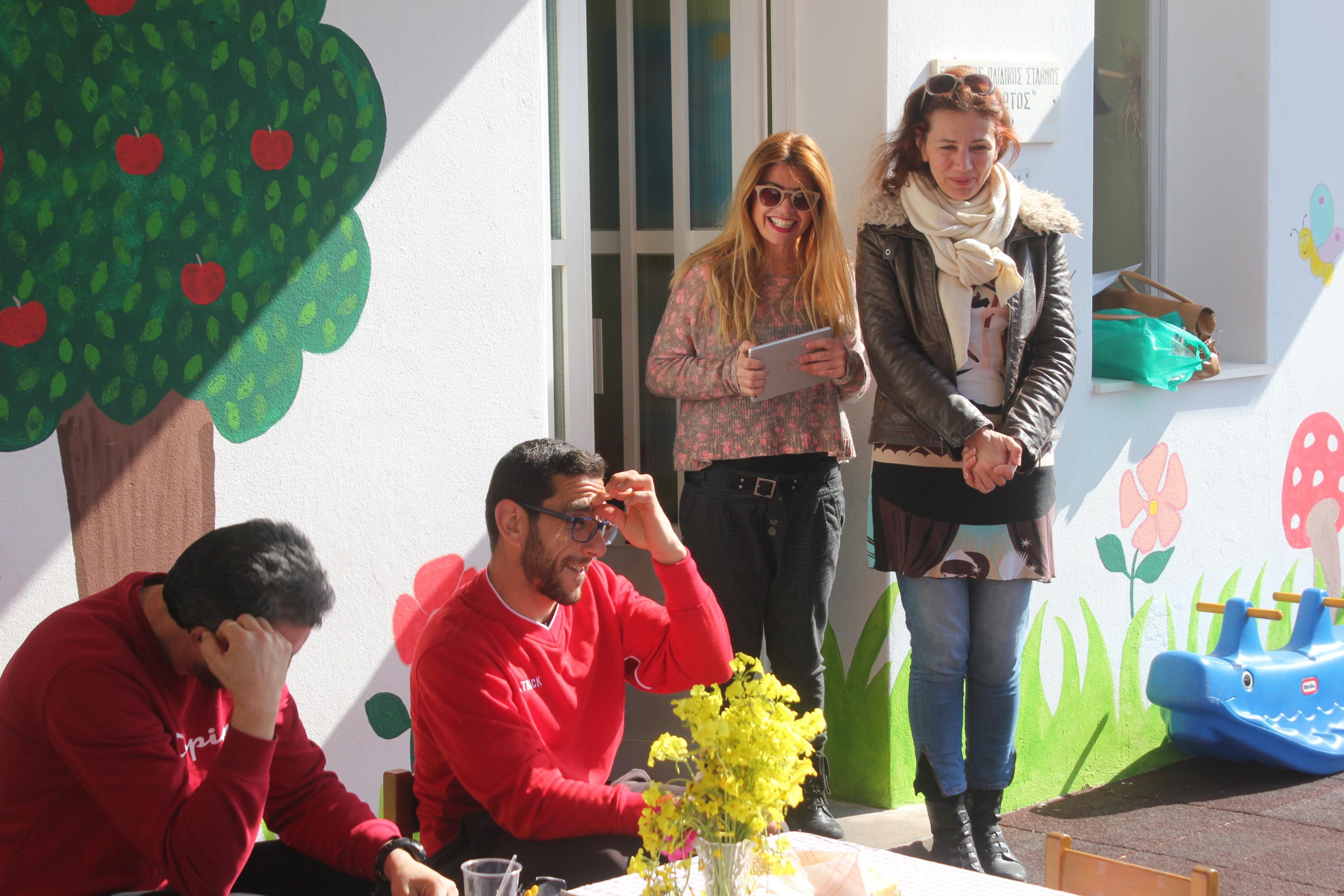 Ο πρόεδρος Τάκης Παπουτσάς, ο Ισίδωρος Παλαμάρης και η Λουΐζα Βαρθαλίτου απάντησαν με χαρά και ενθουσιασμό στις ερωτήσεις των μικρών «δημοσιογράφων», οι οποίοι τους υποδέχτηκαν στη φιλόξενη αυλή του σχολείου τους, μαζί με τους δασκάλες τους Ζωή Αποστόλου (προϊσταμένη), Μαγδαληνή Νίτη και Φωτεινή Παρταλά.