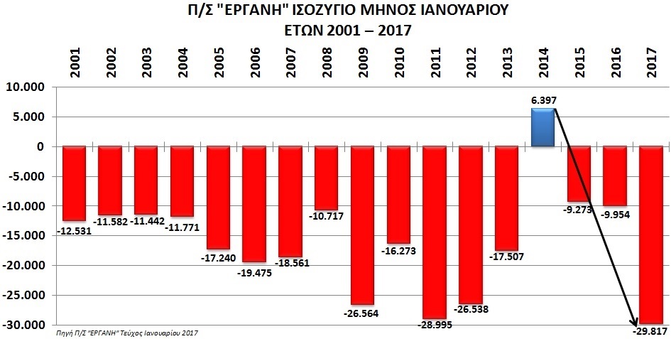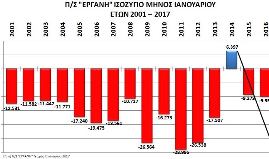 Υπενθυμίζεται ότι, τον Ιανουάριο του 2014, στοχευμένες πολιτικές μας έφεραν, για πρώτη φορά, μετά από πολλά χρόνια, θετικά αποτελέσματα. Συγκεκριμένα, τον Ιανουάριο του 2014 η “ΕΡΓΑΝΗ” έκλεισε με θετικό ισοζύγιο +6.397 νέες θέσεις απασχόλησης (Σχήμα 1).