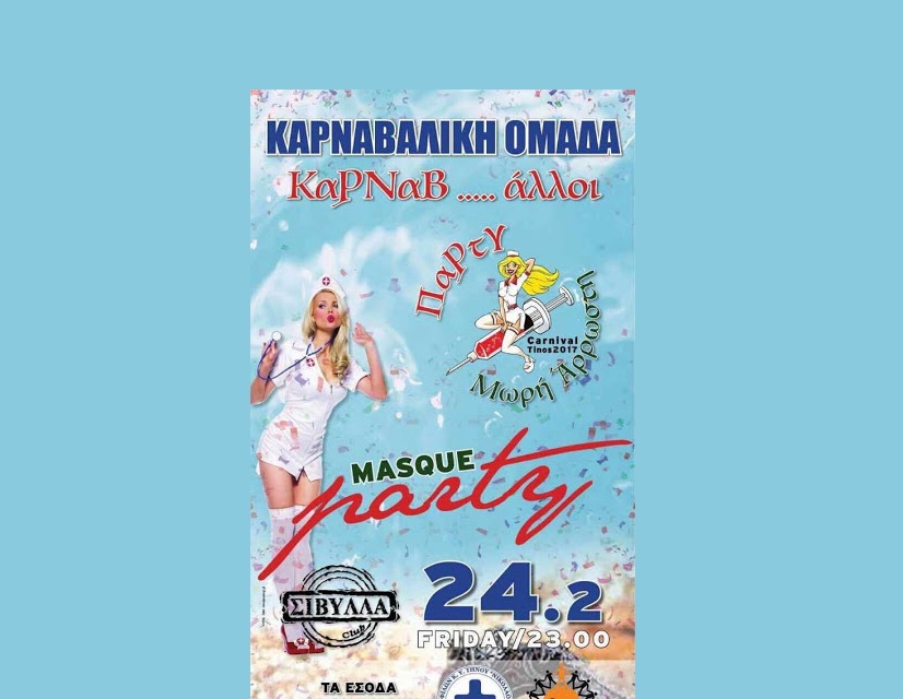 Για δεύτερη συνεχόμενη χρονιά η Καρναβαλική Ομάδα "Καρναβ... άλλοι" διοργανώνουν μασκέ πάρτι. Την Παρασκευή,24 Φεβρουαρίου και ώρα 23.00 μ.μ. στο Σίβυλλα Club. Τα έσοδα διατεθούν στους