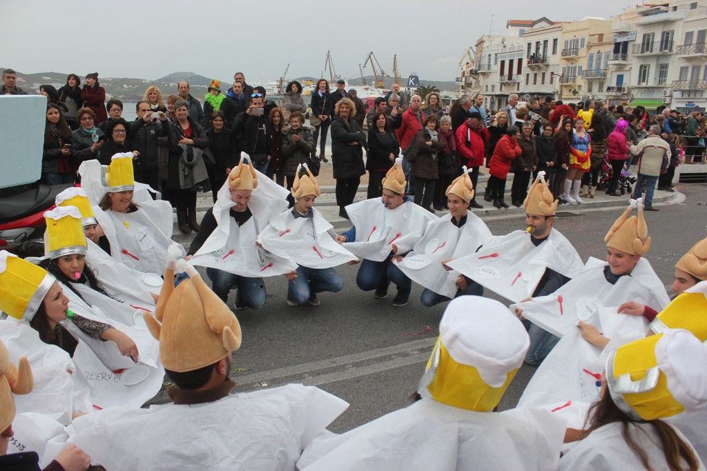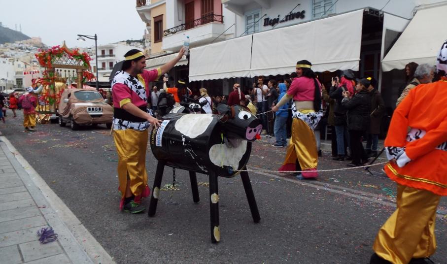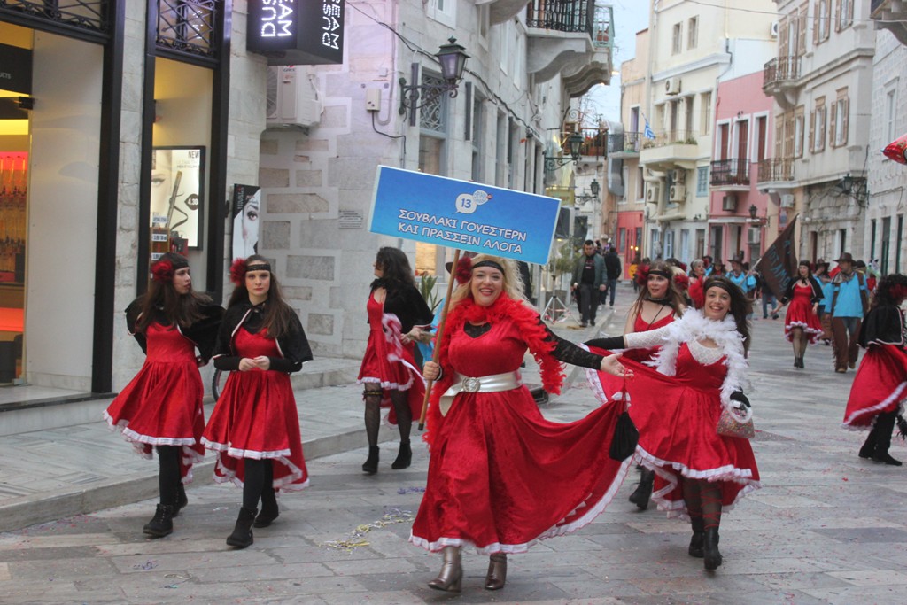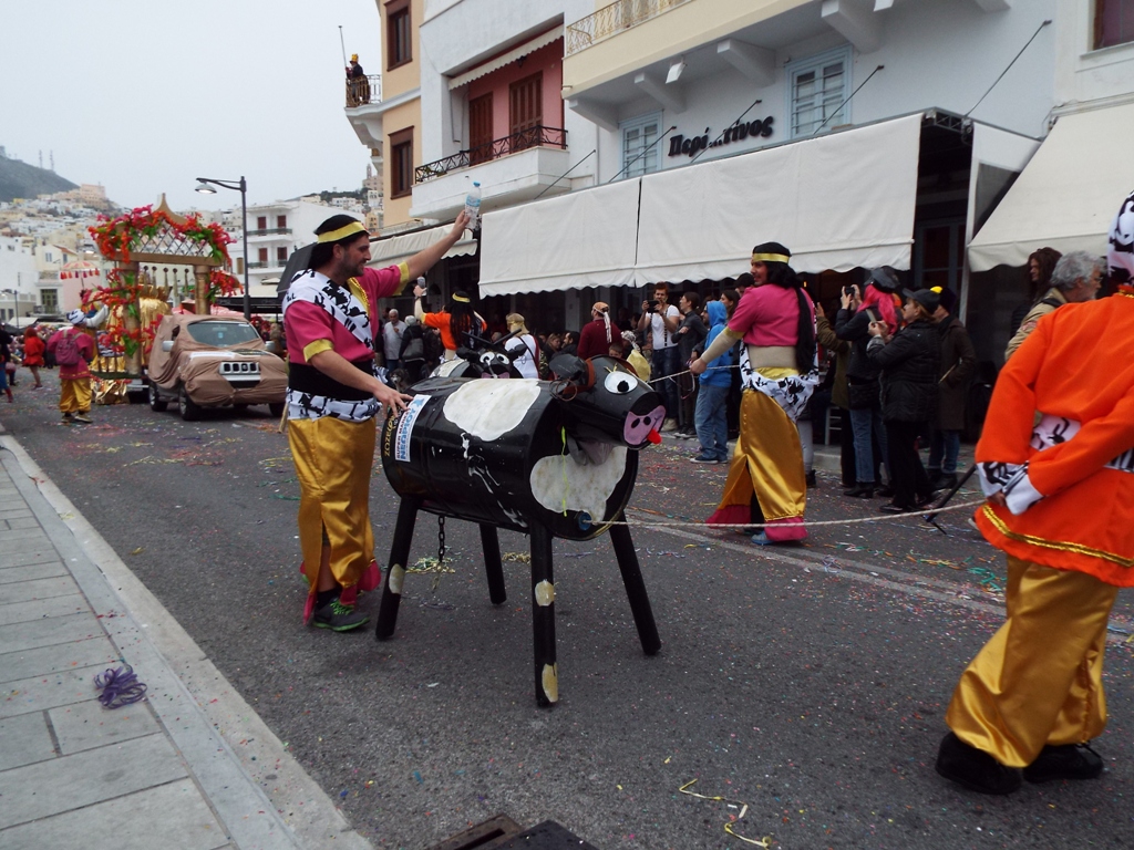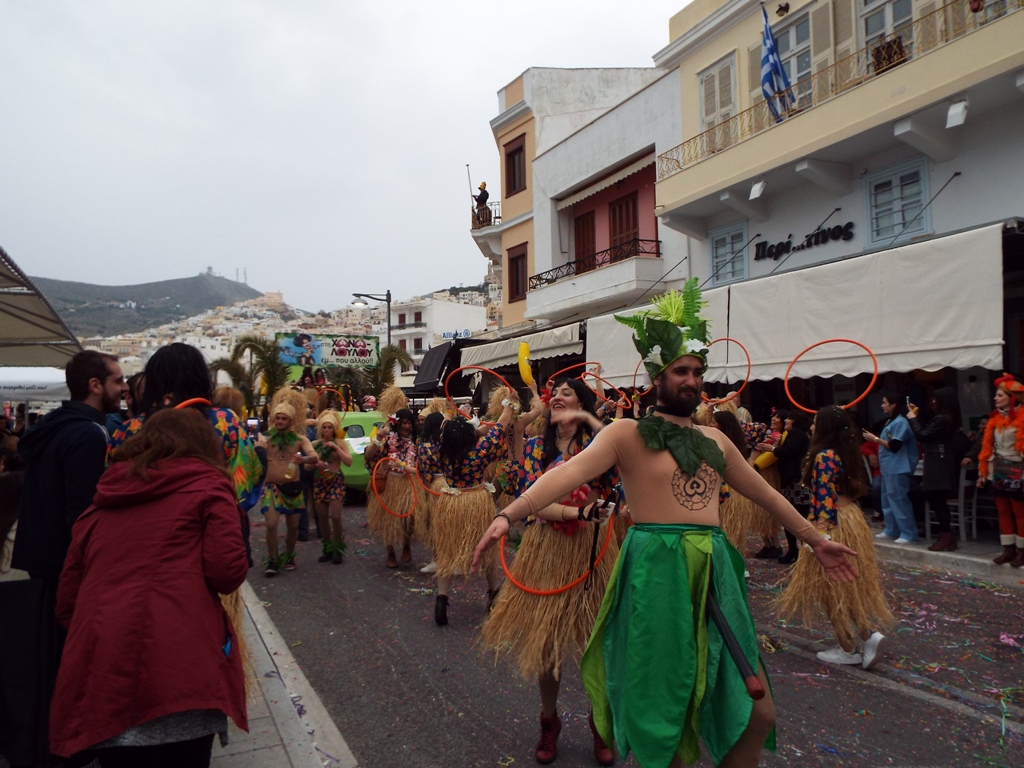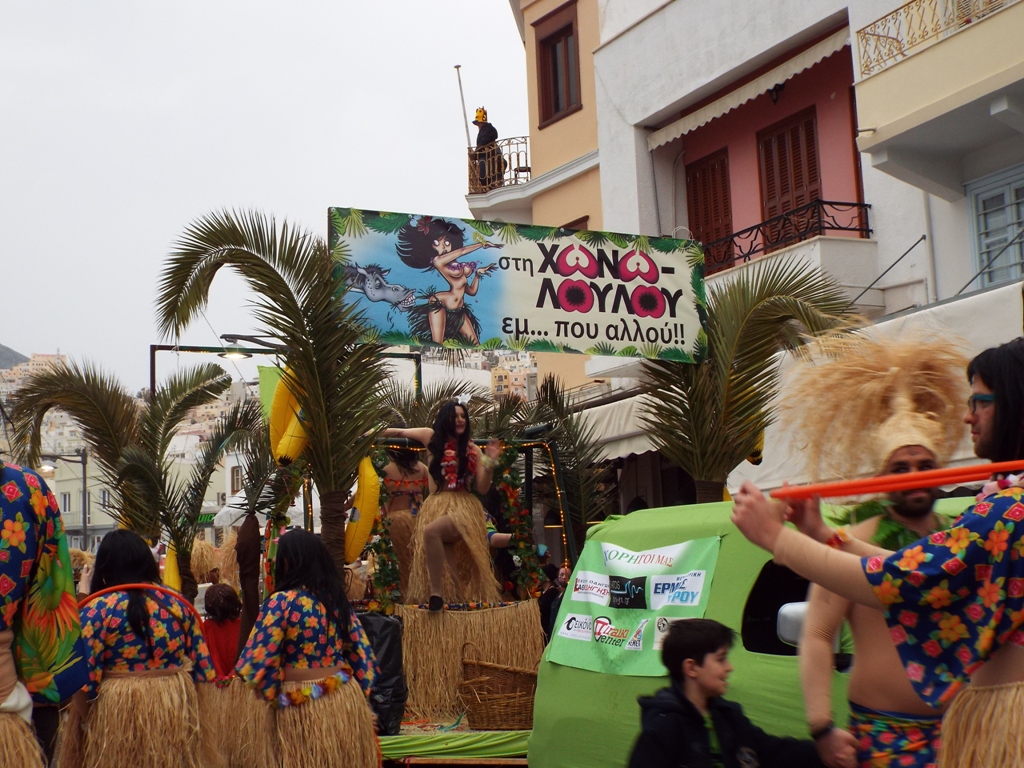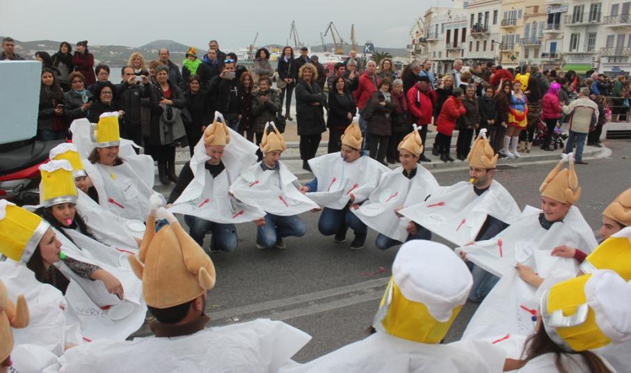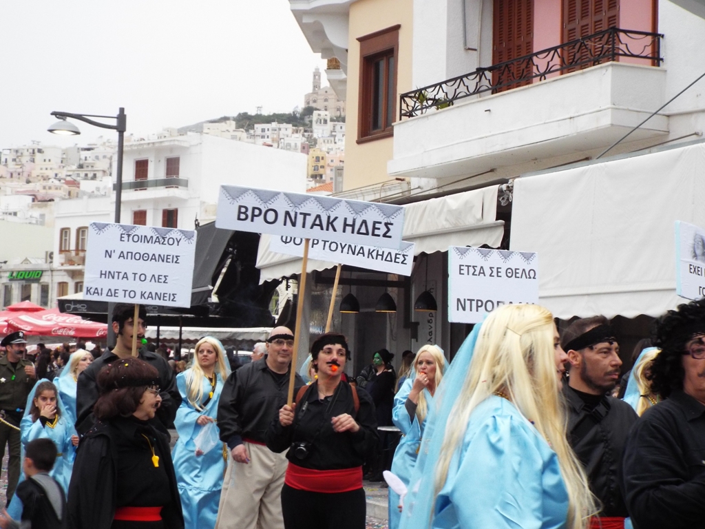Στη “Χωνολουλού” πήγαν φέτος οι Ωραίοι που έχουν χρέη, ενώ τα αγγελούδια της Απάνω Χώρας έριξαν τις ζεϊμπεκιές τους στην πλατεία Μιαούλη. Από το διάστημα κατέβηκαν φέτος οι Vourvourigans για έναν διαφορετικό πόλεμο των άστρων και από τα προϊστορικά Χάλαρα κατέφτασαν οι Φλίντστοουνς της Ομάδας Πεζοπόρων Σύρου. Οι “Άνω Ποταμών” παρουσίασαν το θέμα “Σουβλάκι Φουέστερν και Πράσσειν Άλογα” και η παρέλαση ολοκληρώθηκε με τις ¨”ψυχές” του Φοιτητικού Συλλόγου του Τμήματος Μηχανικών Σχεδίασης Προϊόντων και Συστημάτων του Πανεπιστημίου Αιγαίου.
