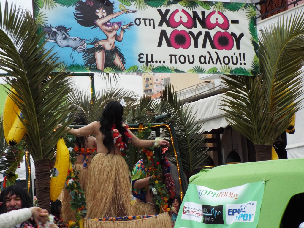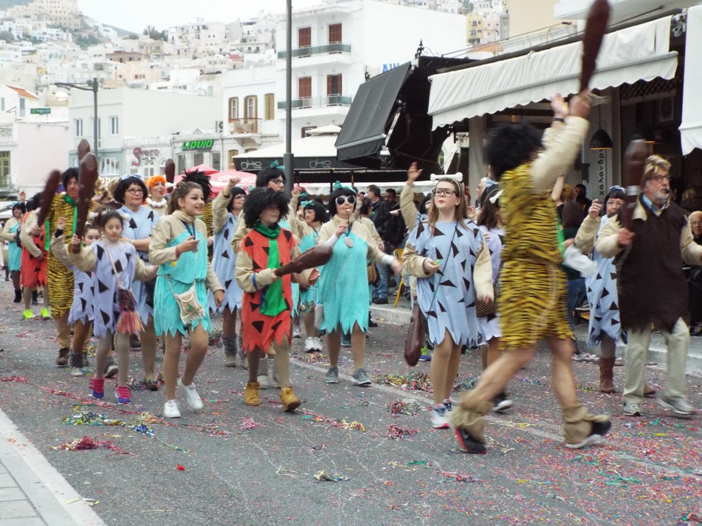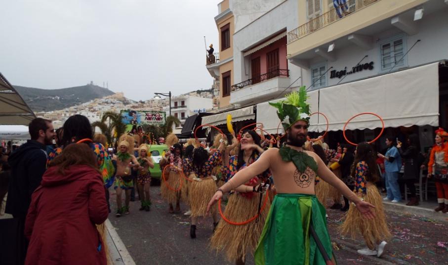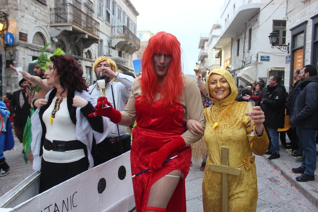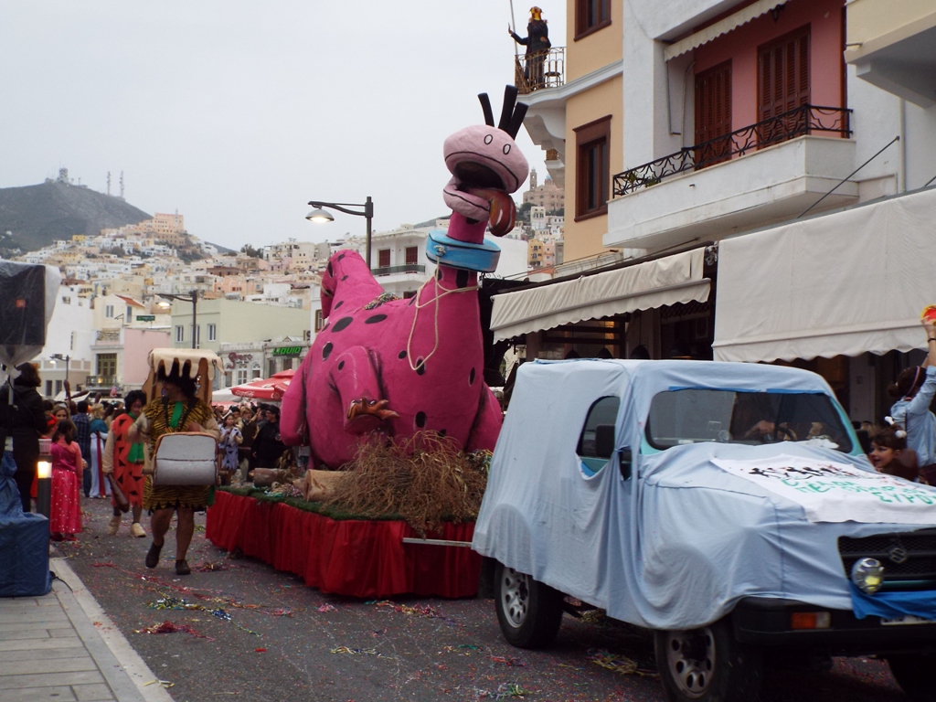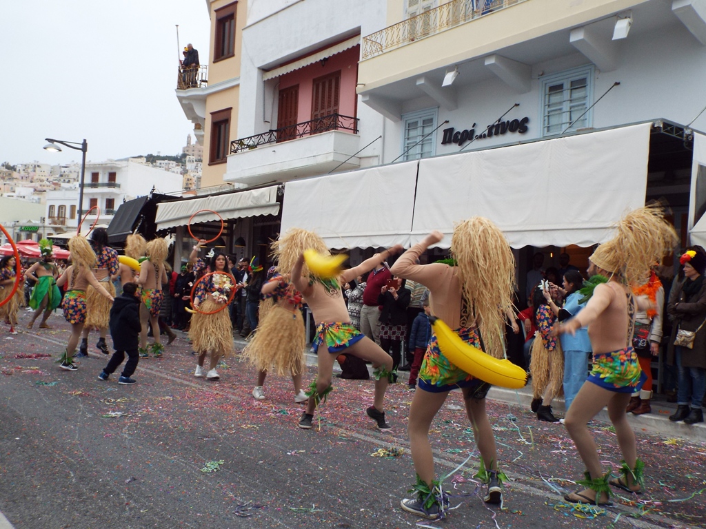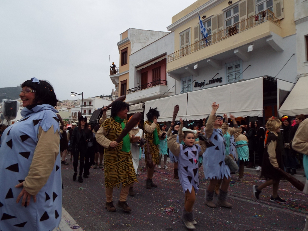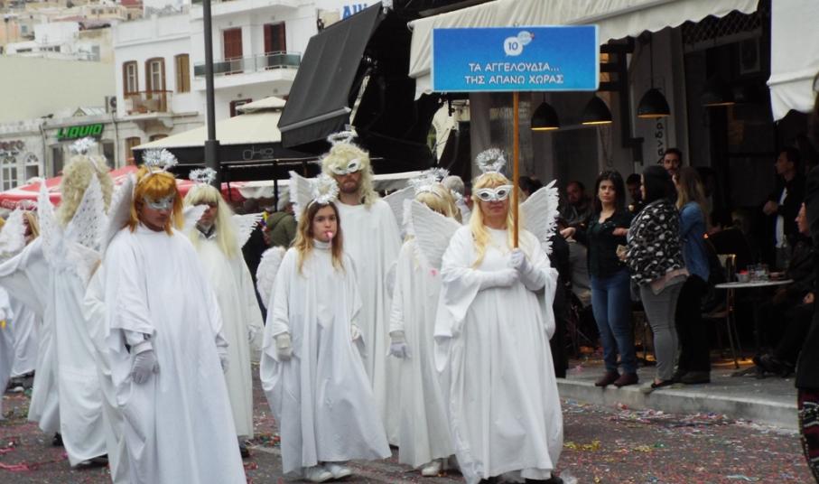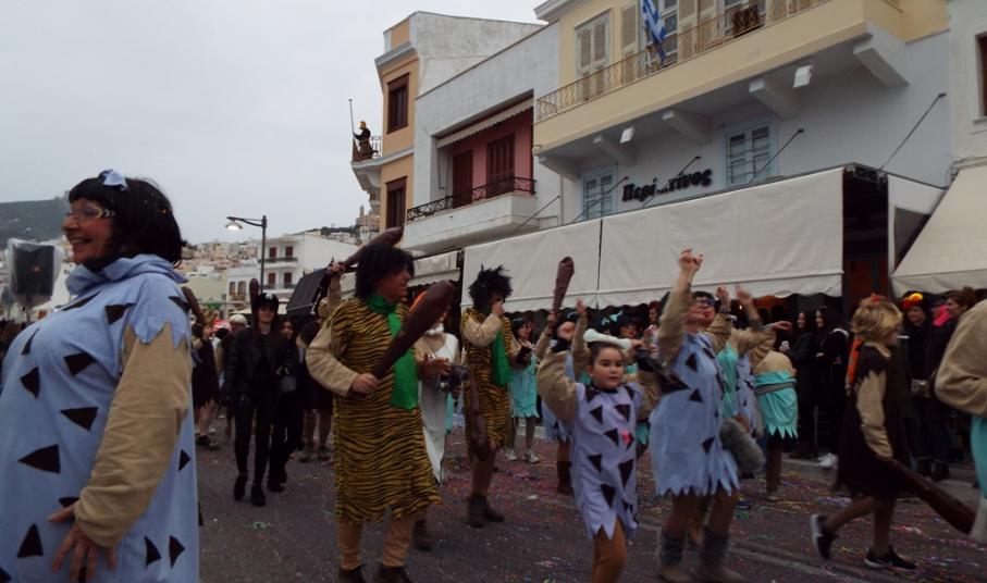 Στη “Χωνολουλού” πήγαν φέτος οι Ωραίοι που έχουν χρέη, ενώ τα αγγελούδια της Απάνω Χώρας έριξαν τις ζεϊμπεκιές τους στην πλατεία Μιαούλη. Από το διάστημα κατέβηκαν φέτος οι Vourvourigans για έναν διαφορετικό πόλεμο των άστρων και από τα προϊστορικά Χάλαρα κατέφτασαν οι Φλίντστοουνς της Ομάδας Πεζοπόρων Σύρου. Οι “Άνω Ποταμών” παρουσίασαν το θέμα “Σουβλάκι Φουέστερν και Πράσσειν Άλογα” και η παρέλαση ολοκληρώθηκε με τις ¨”ψυχές” του Φοιτητικού Συλλόγου του Τμήματος Μηχανικών Σχεδίασης Προϊόντων και Συστημάτων του Πανεπιστημίου Αιγαίου.