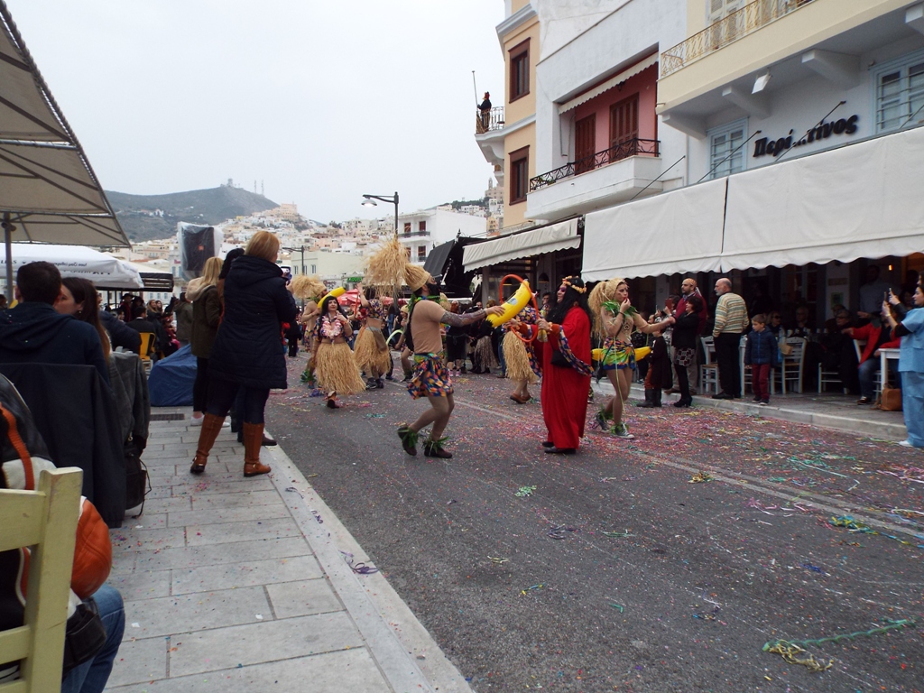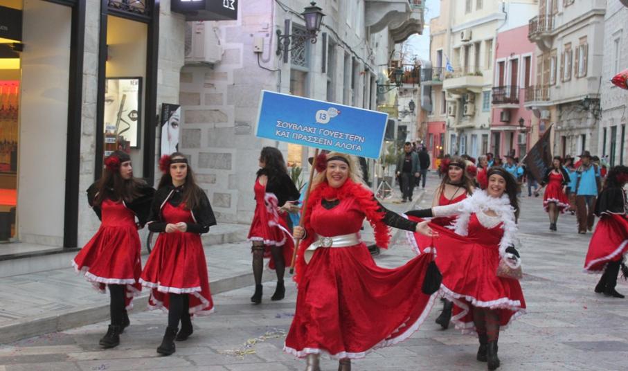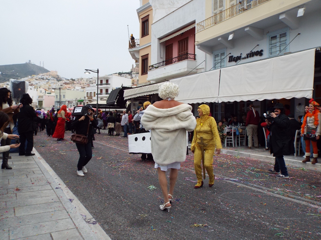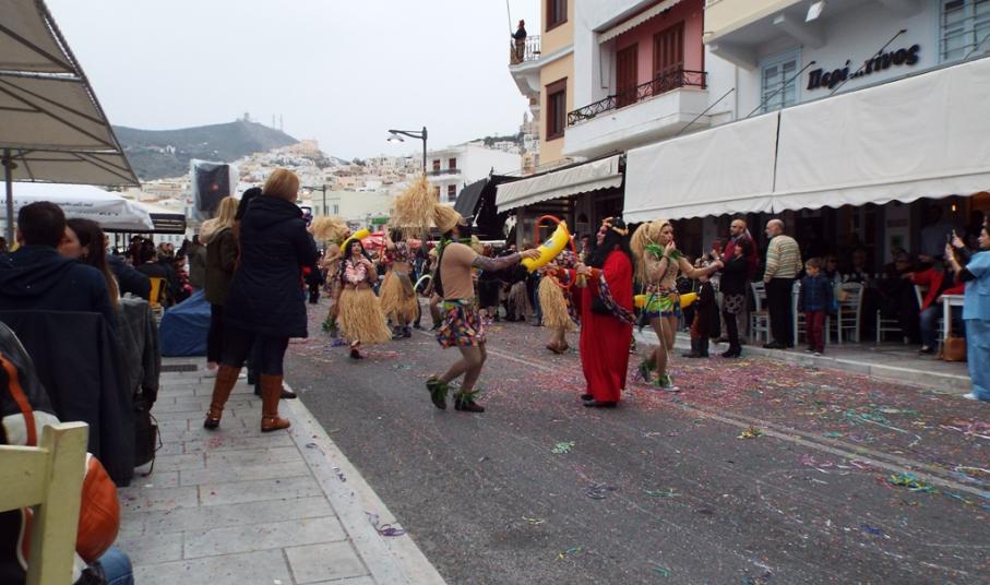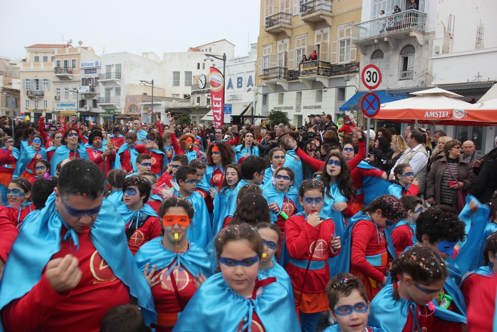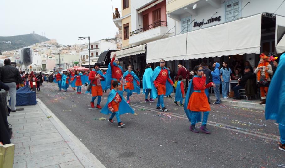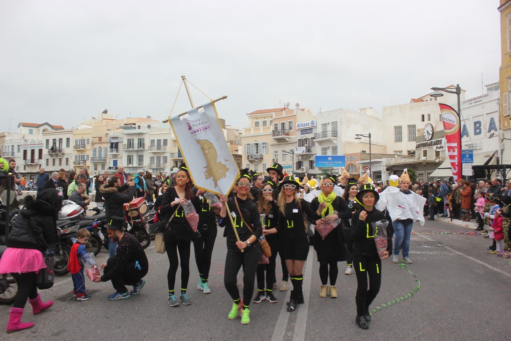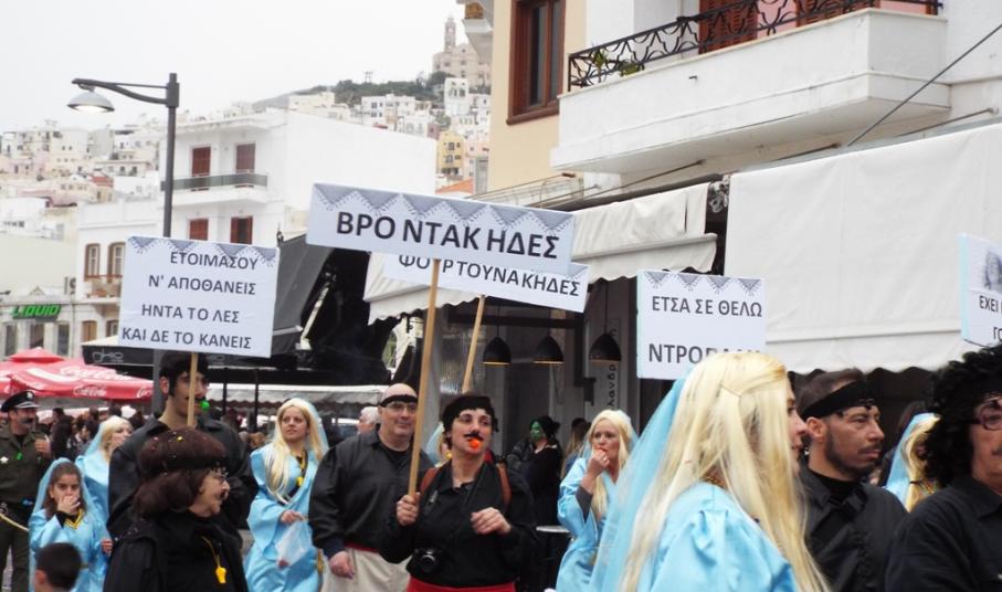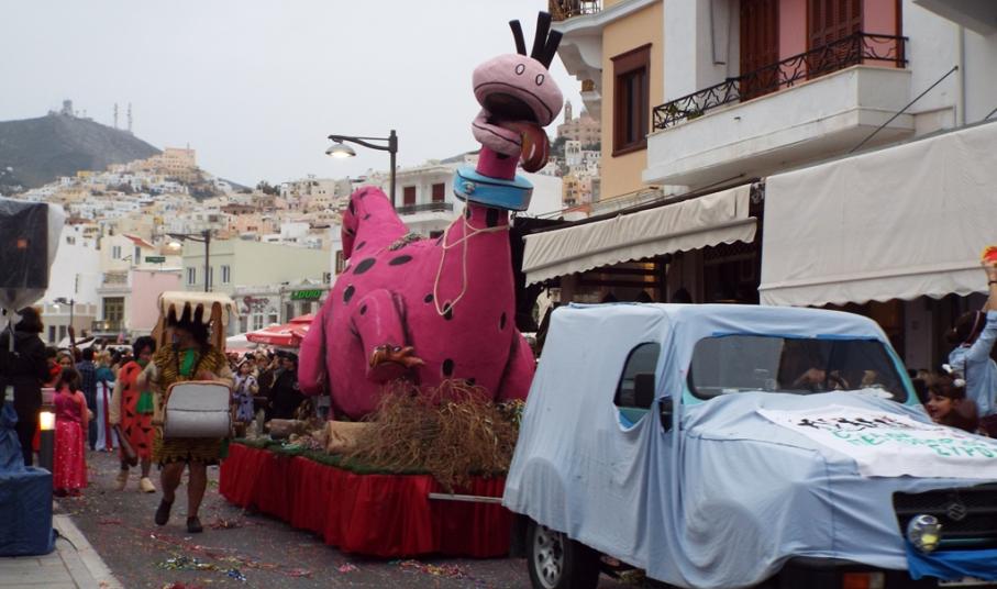 Στη “Χωνολουλού” πήγαν φέτος οι Ωραίοι που έχουν χρέη, ενώ τα αγγελούδια της Απάνω Χώρας έριξαν τις ζεϊμπεκιές τους στην πλατεία Μιαούλη. Από το διάστημα κατέβηκαν φέτος οι Vourvourigans για έναν διαφορετικό πόλεμο των άστρων και από τα προϊστορικά Χάλαρα κατέφτασαν οι Φλίντστοουνς της Ομάδας Πεζοπόρων Σύρου. Οι “Άνω Ποταμών” παρουσίασαν το θέμα “Σουβλάκι Φουέστερν και Πράσσειν Άλογα” και η παρέλαση ολοκληρώθηκε με τις ¨”ψυχές” του Φοιτητικού Συλλόγου του Τμήματος Μηχανικών Σχεδίασης Προϊόντων και Συστημάτων του Πανεπιστημίου Αιγαίου.