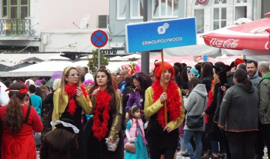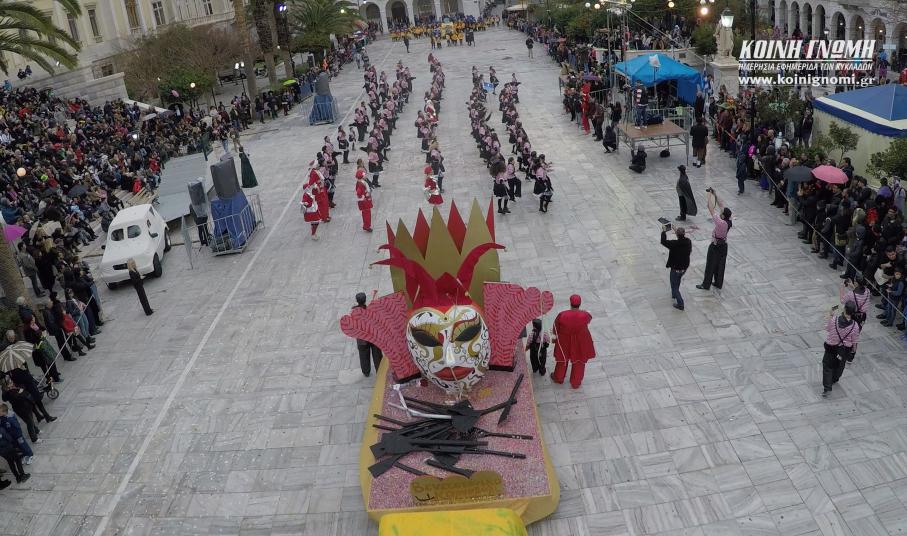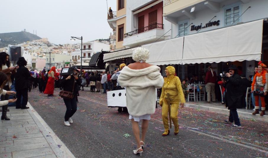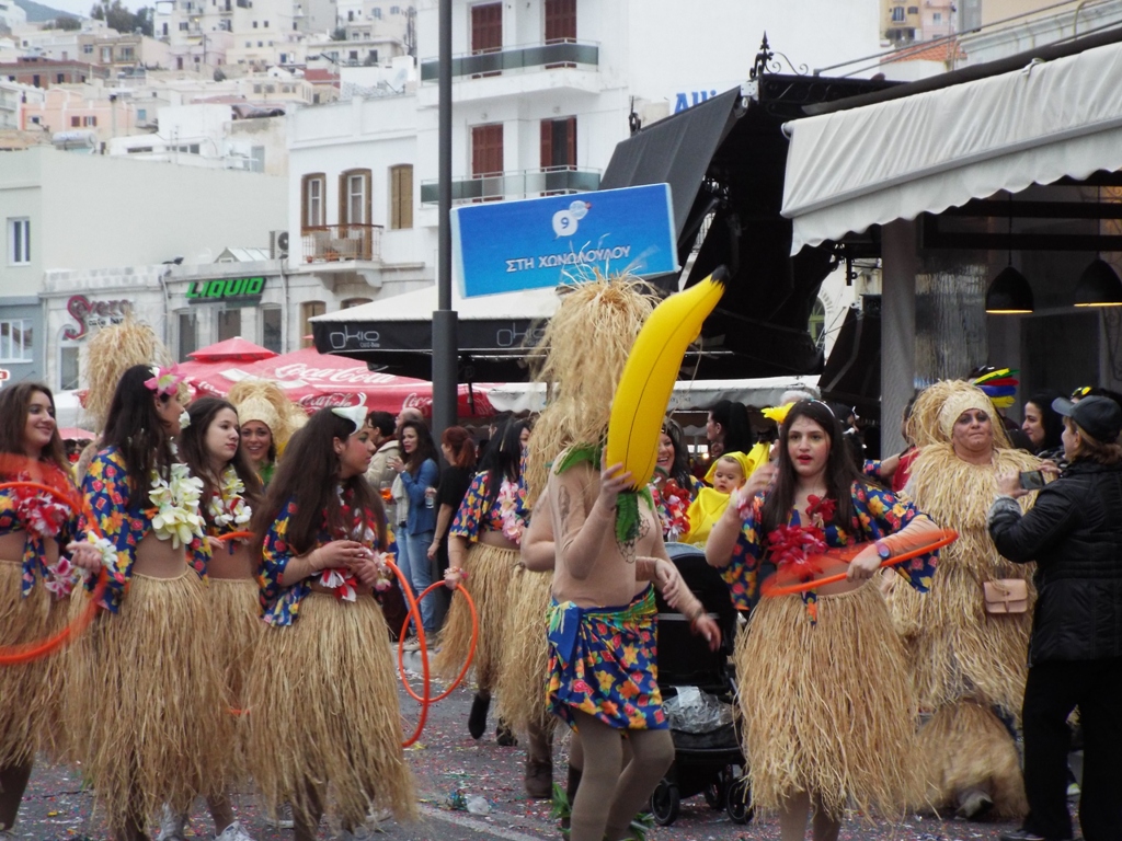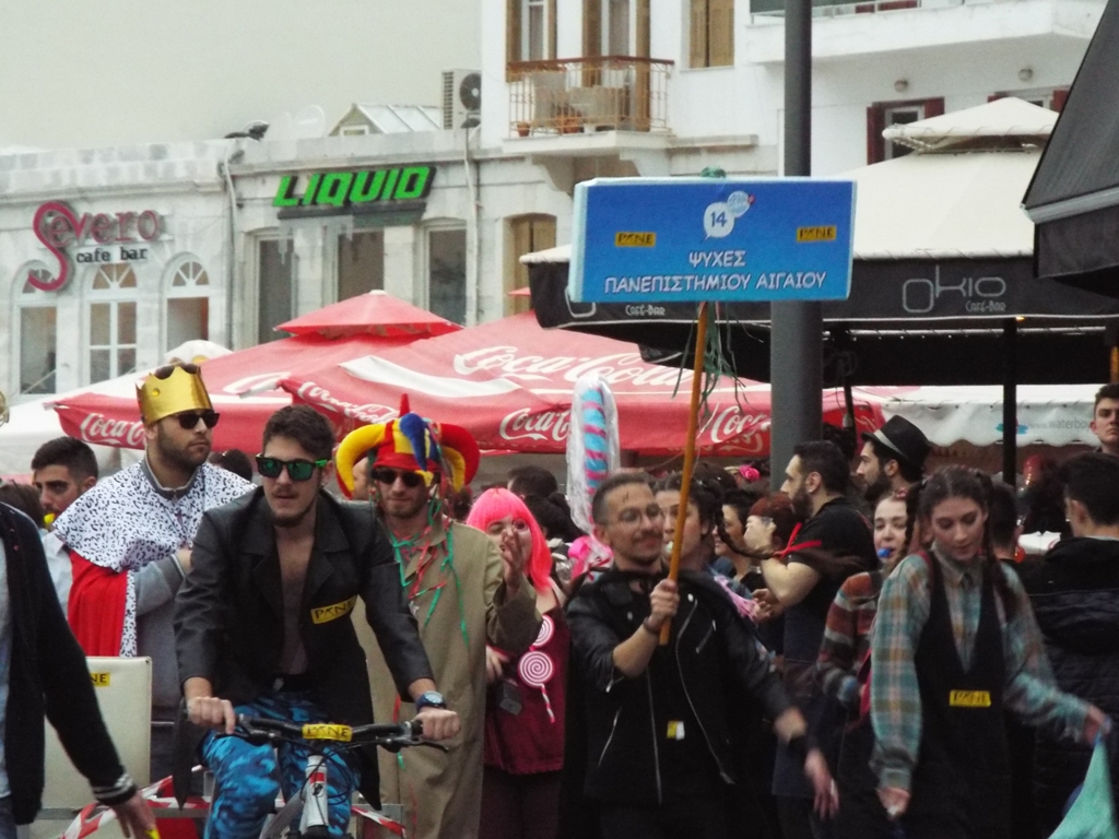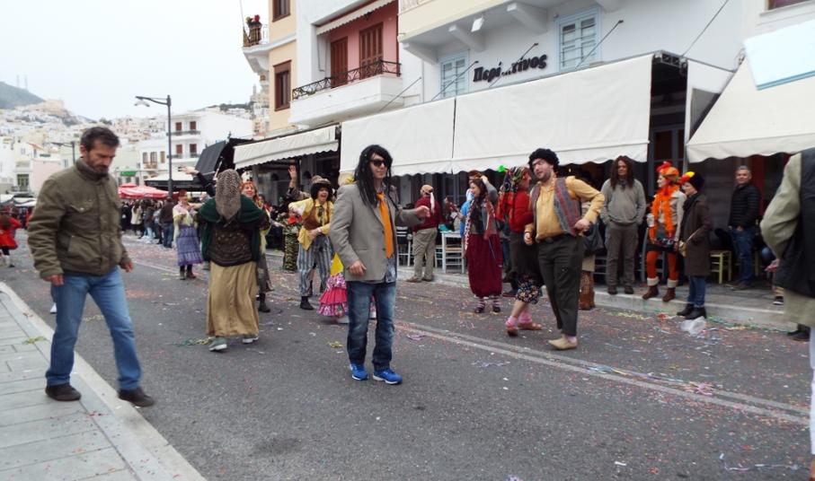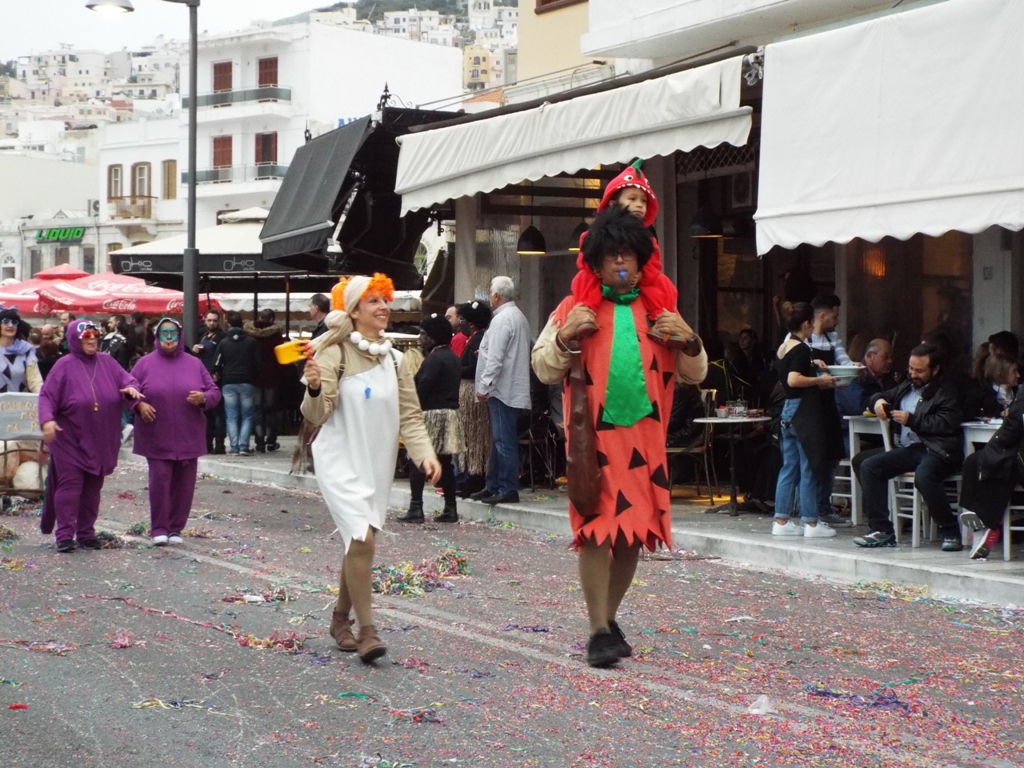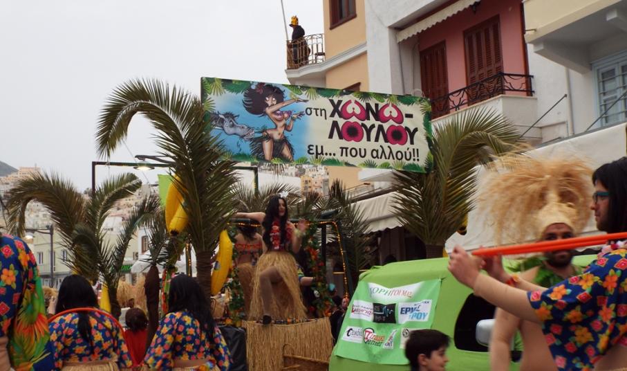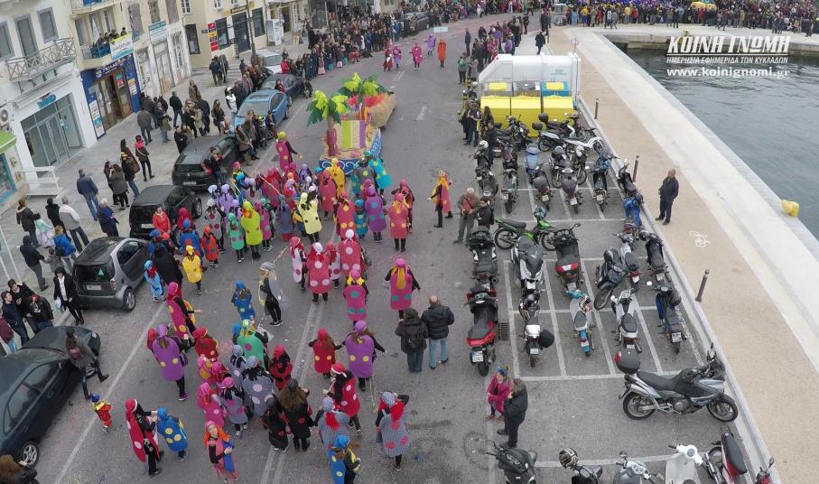 Στη “Χωνολουλού” πήγαν φέτος οι Ωραίοι που έχουν χρέη, ενώ τα αγγελούδια της Απάνω Χώρας έριξαν τις ζεϊμπεκιές τους στην πλατεία Μιαούλη. Από το διάστημα κατέβηκαν φέτος οι Vourvourigans για έναν διαφορετικό πόλεμο των άστρων και από τα προϊστορικά Χάλαρα κατέφτασαν οι Φλίντστοουνς της Ομάδας Πεζοπόρων Σύρου. Οι “Άνω Ποταμών” παρουσίασαν το θέμα “Σουβλάκι Φουέστερν και Πράσσειν Άλογα” και η παρέλαση ολοκληρώθηκε με τις ¨”ψυχές” του Φοιτητικού Συλλόγου του Τμήματος Μηχανικών Σχεδίασης Προϊόντων και Συστημάτων του Πανεπιστημίου Αιγαίου.