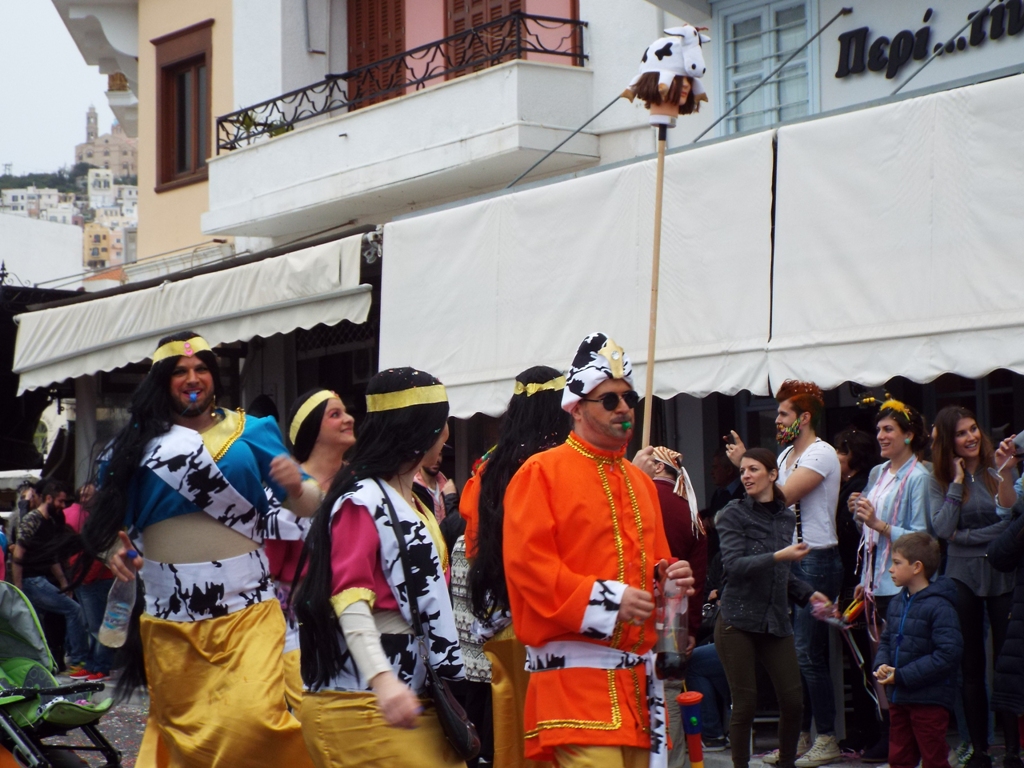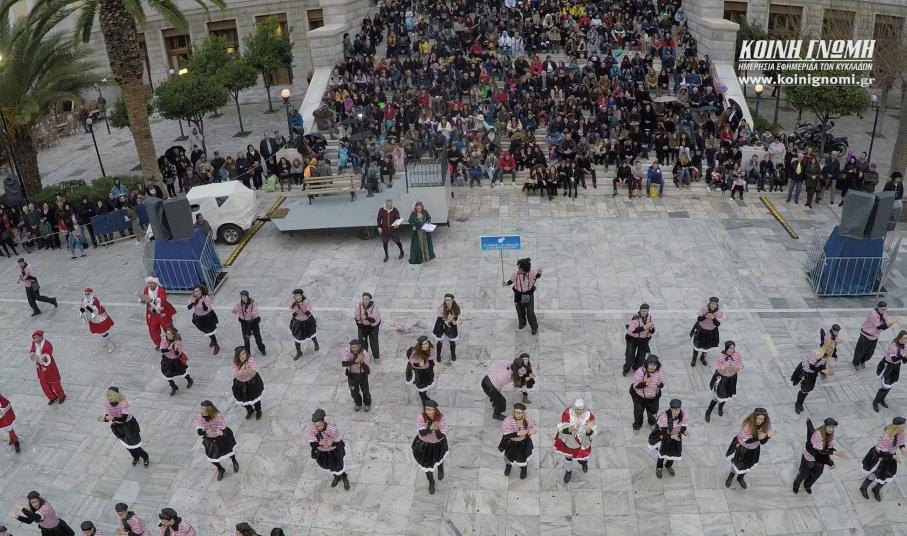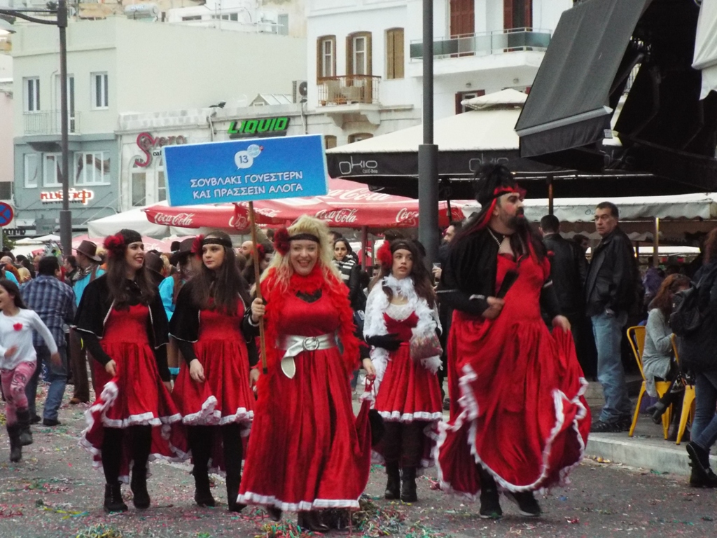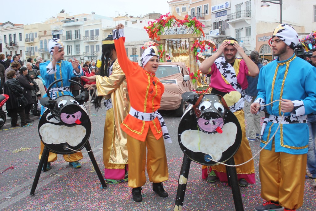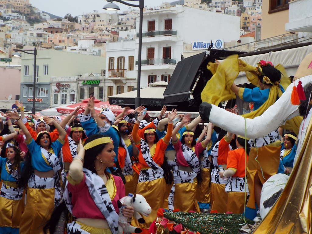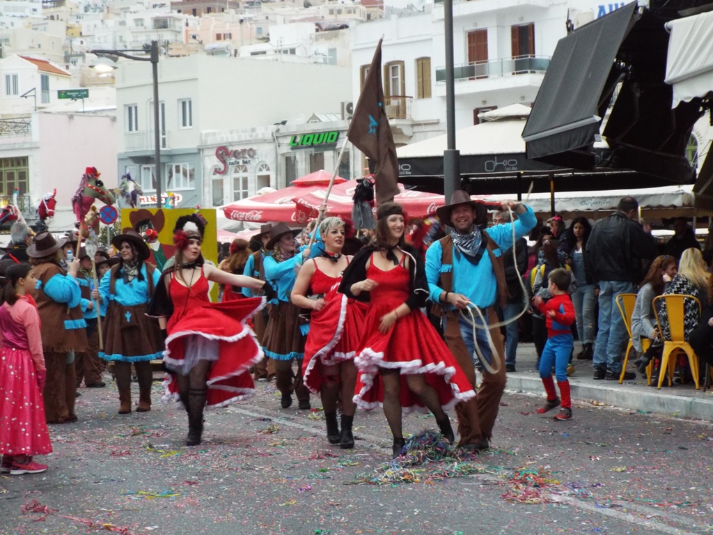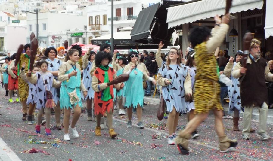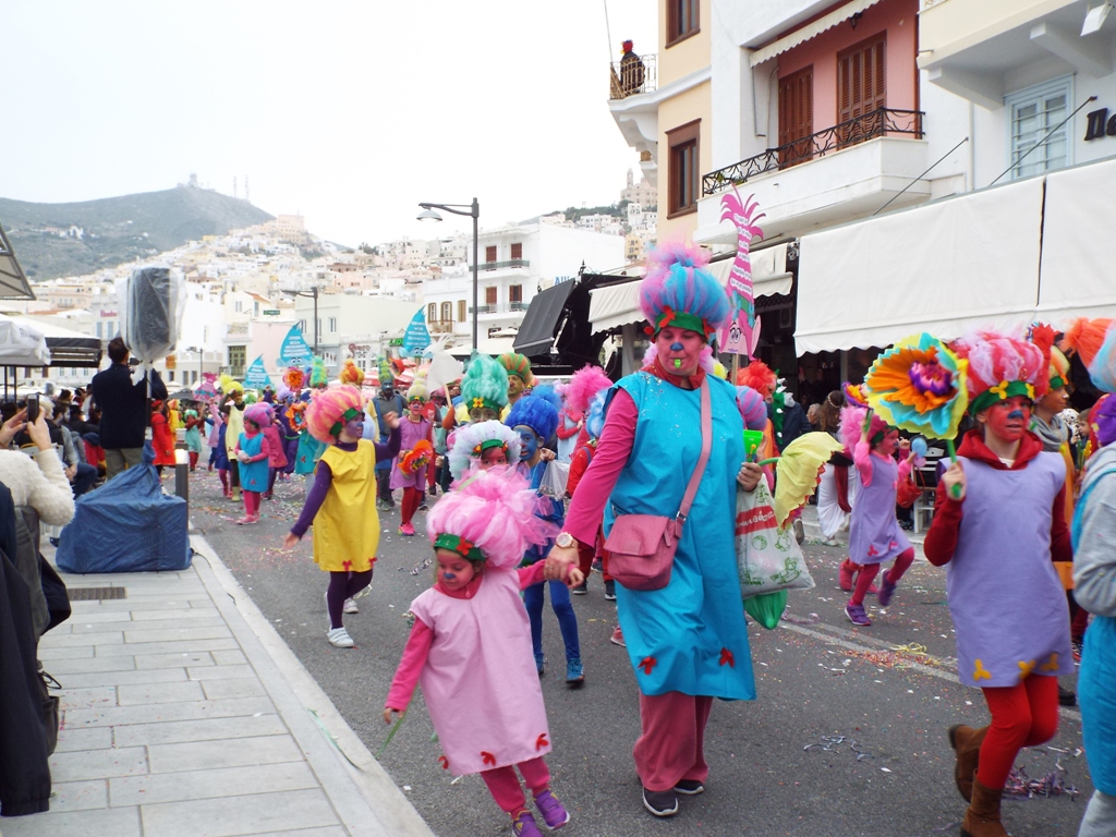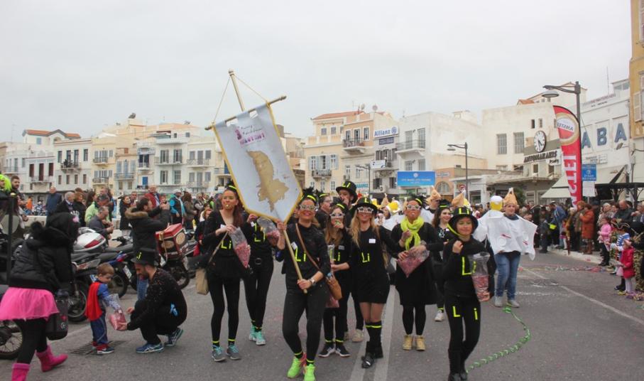 Στη “Χωνολουλού” πήγαν φέτος οι Ωραίοι που έχουν χρέη, ενώ τα αγγελούδια της Απάνω Χώρας έριξαν τις ζεϊμπεκιές τους στην πλατεία Μιαούλη. Από το διάστημα κατέβηκαν φέτος οι Vourvourigans για έναν διαφορετικό πόλεμο των άστρων και από τα προϊστορικά Χάλαρα κατέφτασαν οι Φλίντστοουνς της Ομάδας Πεζοπόρων Σύρου. Οι “Άνω Ποταμών” παρουσίασαν το θέμα “Σουβλάκι Φουέστερν και Πράσσειν Άλογα” και η παρέλαση ολοκληρώθηκε με τις ¨”ψυχές” του Φοιτητικού Συλλόγου του Τμήματος Μηχανικών Σχεδίασης Προϊόντων και Συστημάτων του Πανεπιστημίου Αιγαίου.