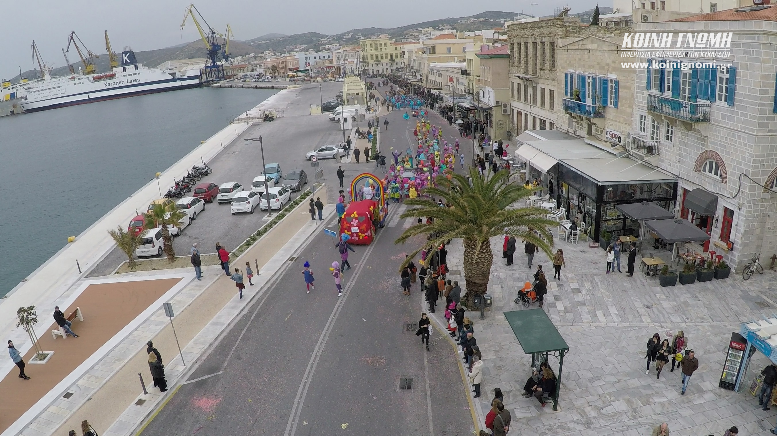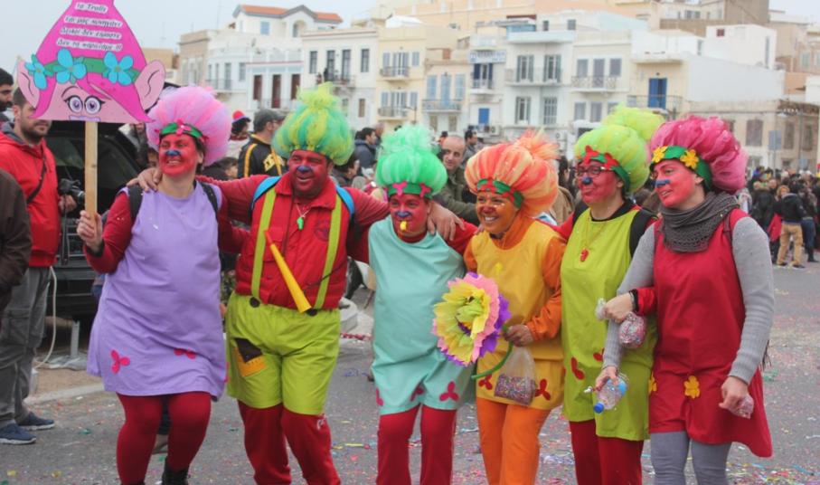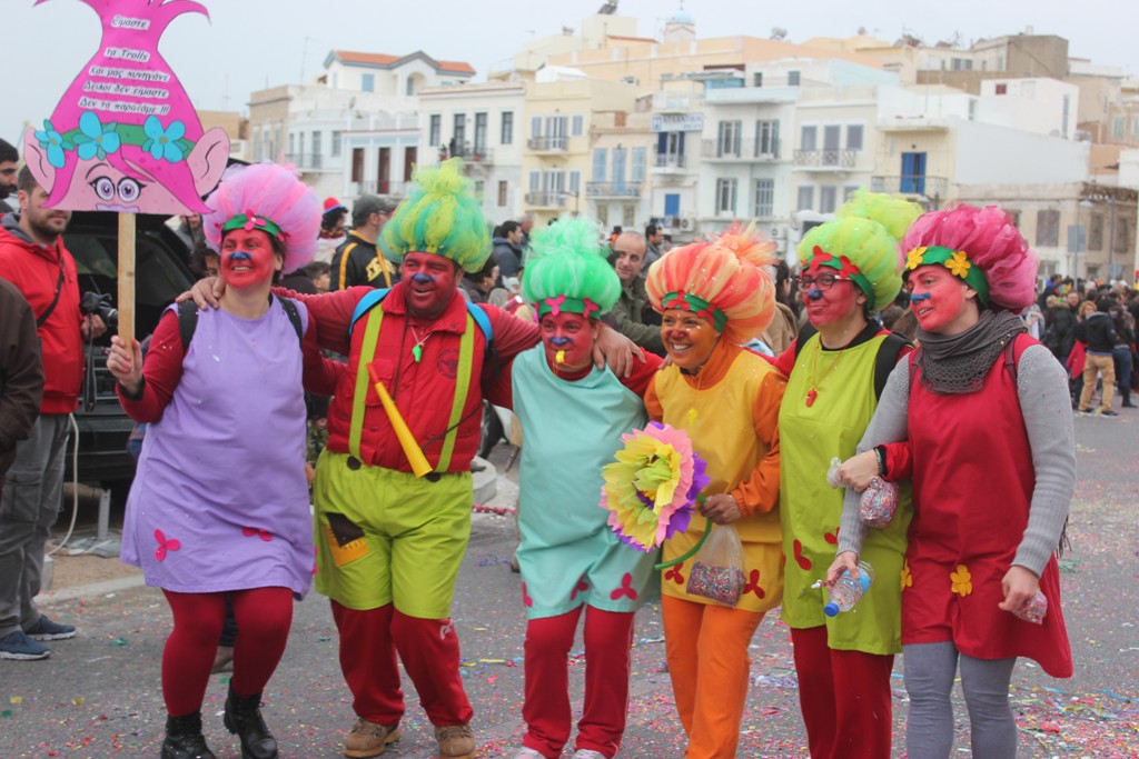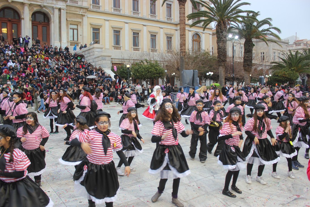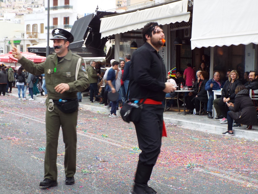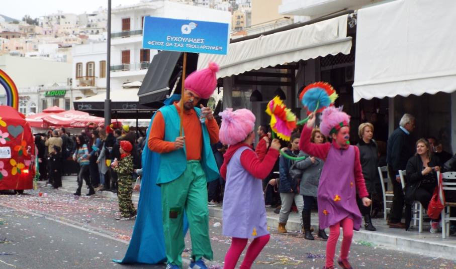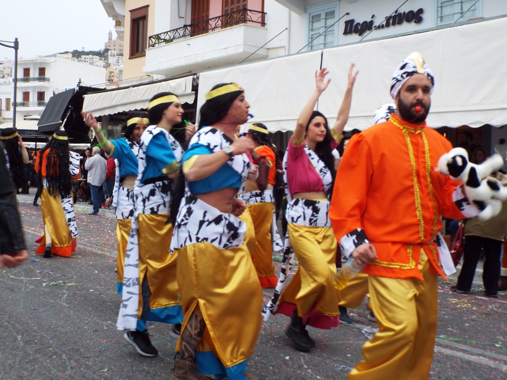 Στη “Χωνολουλού” πήγαν φέτος οι Ωραίοι που έχουν χρέη, ενώ τα αγγελούδια της Απάνω Χώρας έριξαν τις ζεϊμπεκιές τους στην πλατεία Μιαούλη. Από το διάστημα κατέβηκαν φέτος οι Vourvourigans για έναν διαφορετικό πόλεμο των άστρων και από τα προϊστορικά Χάλαρα κατέφτασαν οι Φλίντστοουνς της Ομάδας Πεζοπόρων Σύρου. Οι “Άνω Ποταμών” παρουσίασαν το θέμα “Σουβλάκι Φουέστερν και Πράσσειν Άλογα” και η παρέλαση ολοκληρώθηκε με τις ¨”ψυχές” του Φοιτητικού Συλλόγου του Τμήματος Μηχανικών Σχεδίασης Προϊόντων και Συστημάτων του Πανεπιστημίου Αιγαίου.