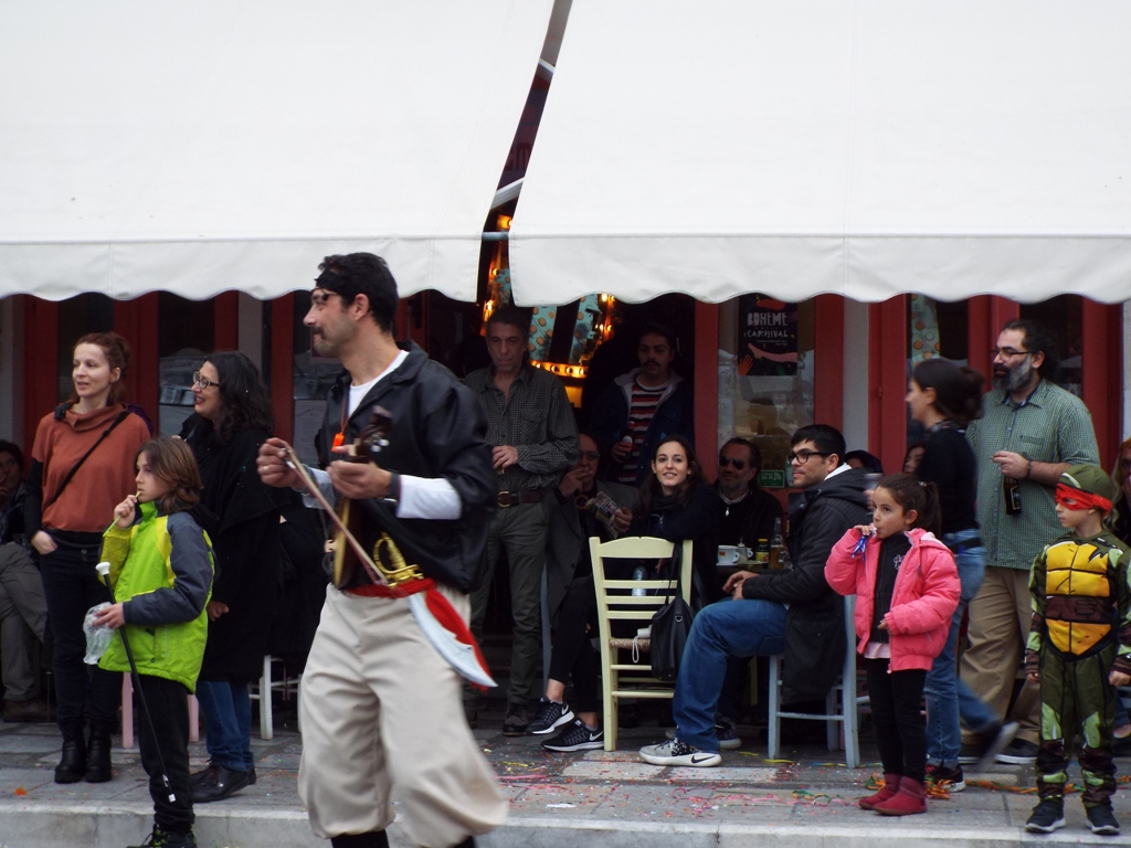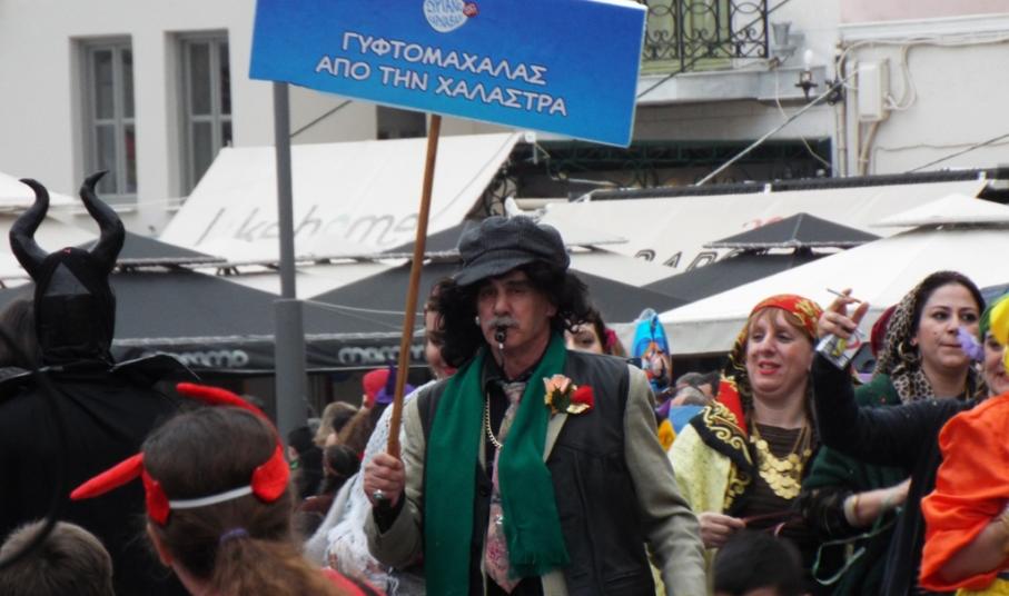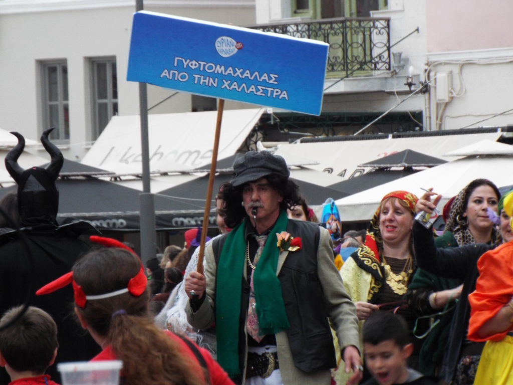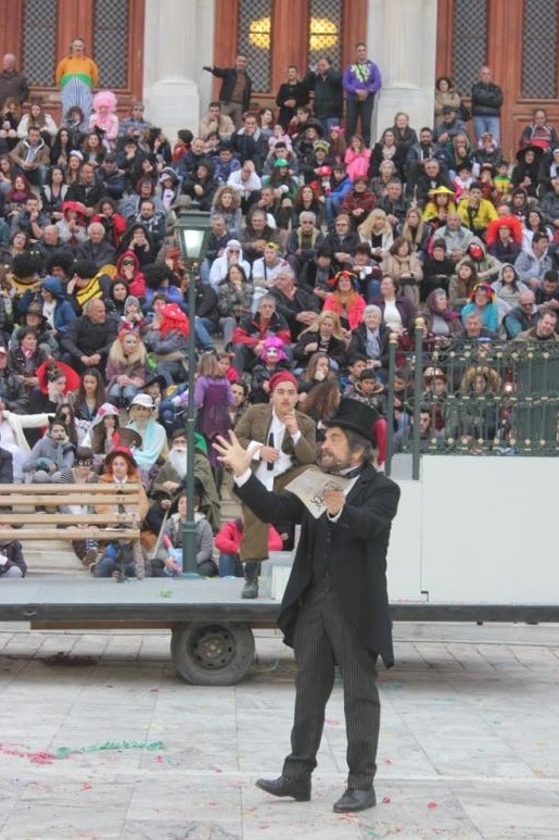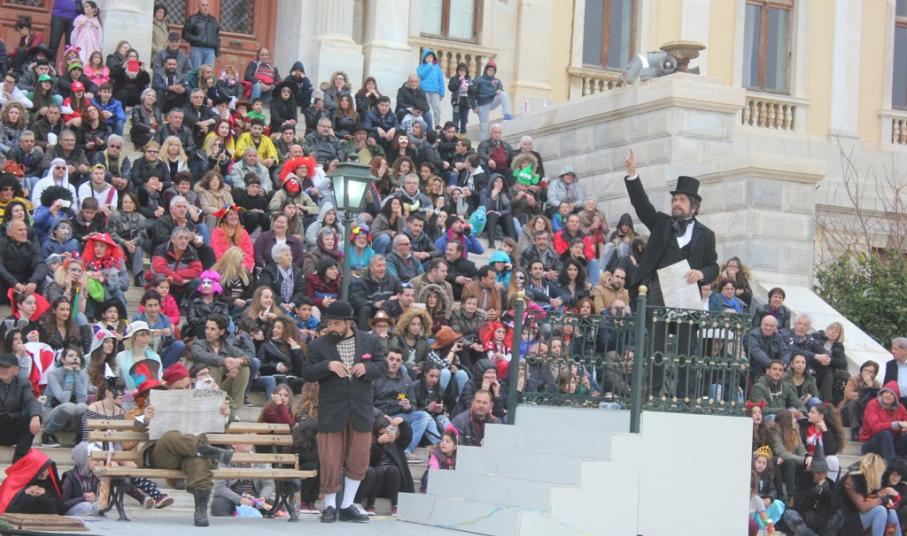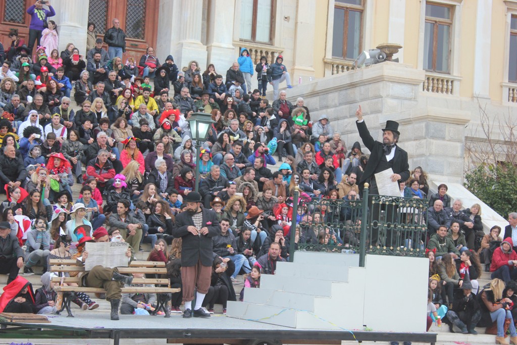 Πρωταγωνιστής της μεγάλης παρέλασης ήταν ο σπουδαίος σατιρικός ποιητής της νεότερης Ελλάδας, Γεώργιος Σουρής (Γεώργιος Μιχαλάκης), συνοδευόμενος στο προσωπικό άρμα του, που επιμελήθηκε η Πηνελόπη Ασλάνογλου, από τους δύο ήρωές του, Φασουλή και Περικλέτο (Δημήτρη και Λάκη Καπέλλα). Οι τρεις τους παρουσίασαν ένα μοναδικό θεατρικό δρώμενο στην Πλατεία Μιαούλη.