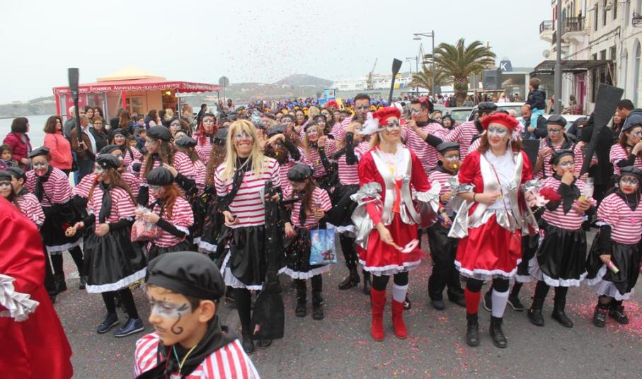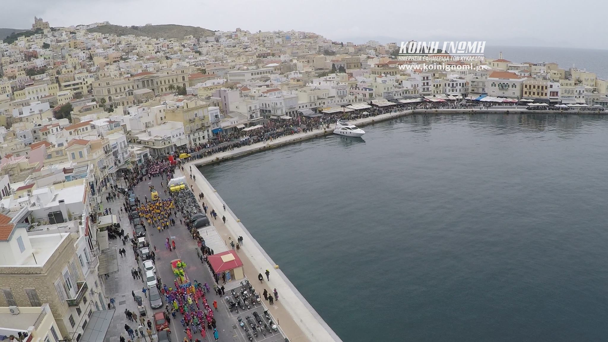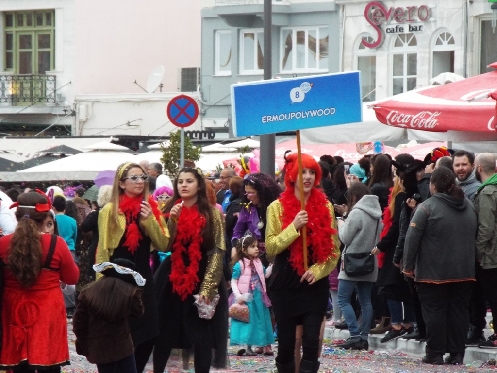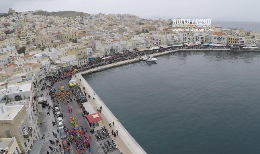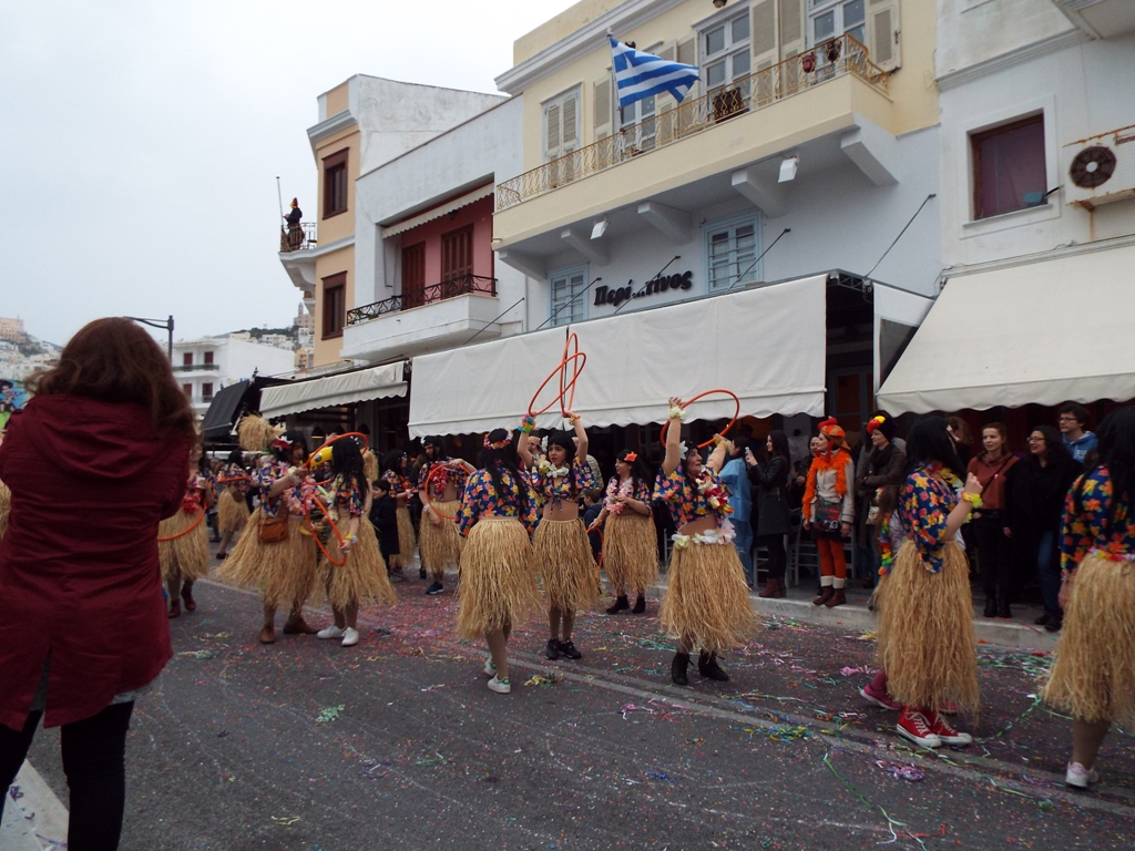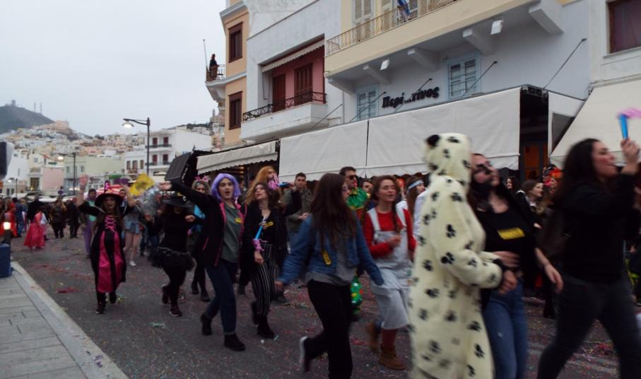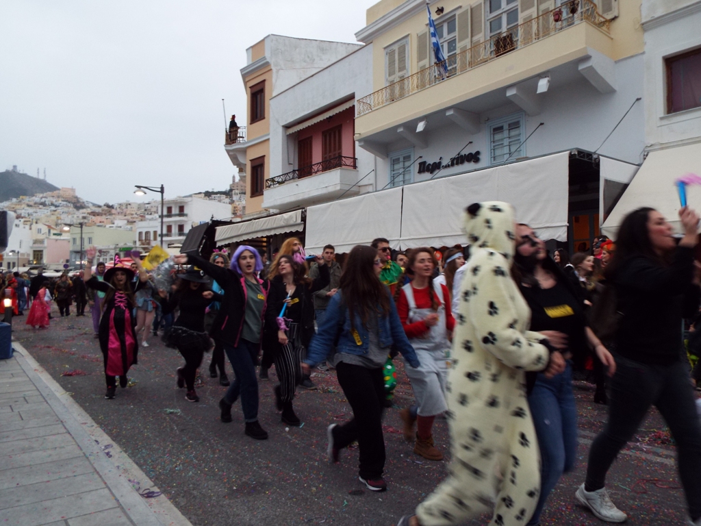 Η μεγάλη παρέλαση των καρναβαλικών ομάδων στους δρόμους της Ερμούπολης πραγματοποιήθηκε το απόγευμα της Κυριακής, παρουσία πλήθους κατοίκων και επισκεπτών του νησιού που ενθάρρυναν και αποθέωναν τους συμμετέχοντες με επευφημίες και το ζεστό "χειροκρότημά" τους.