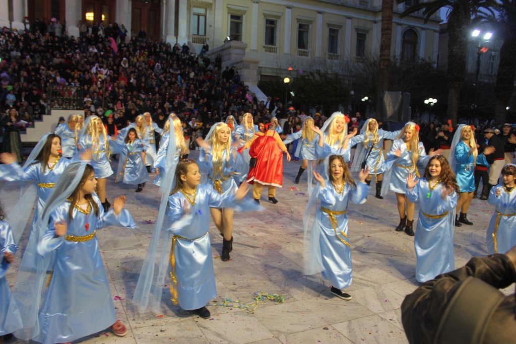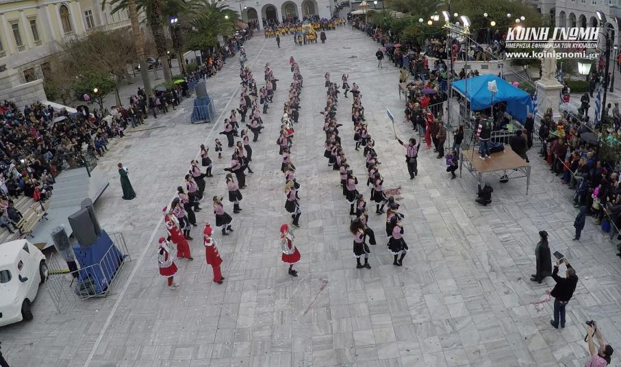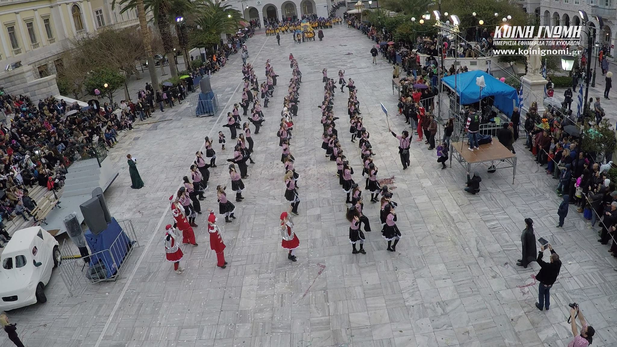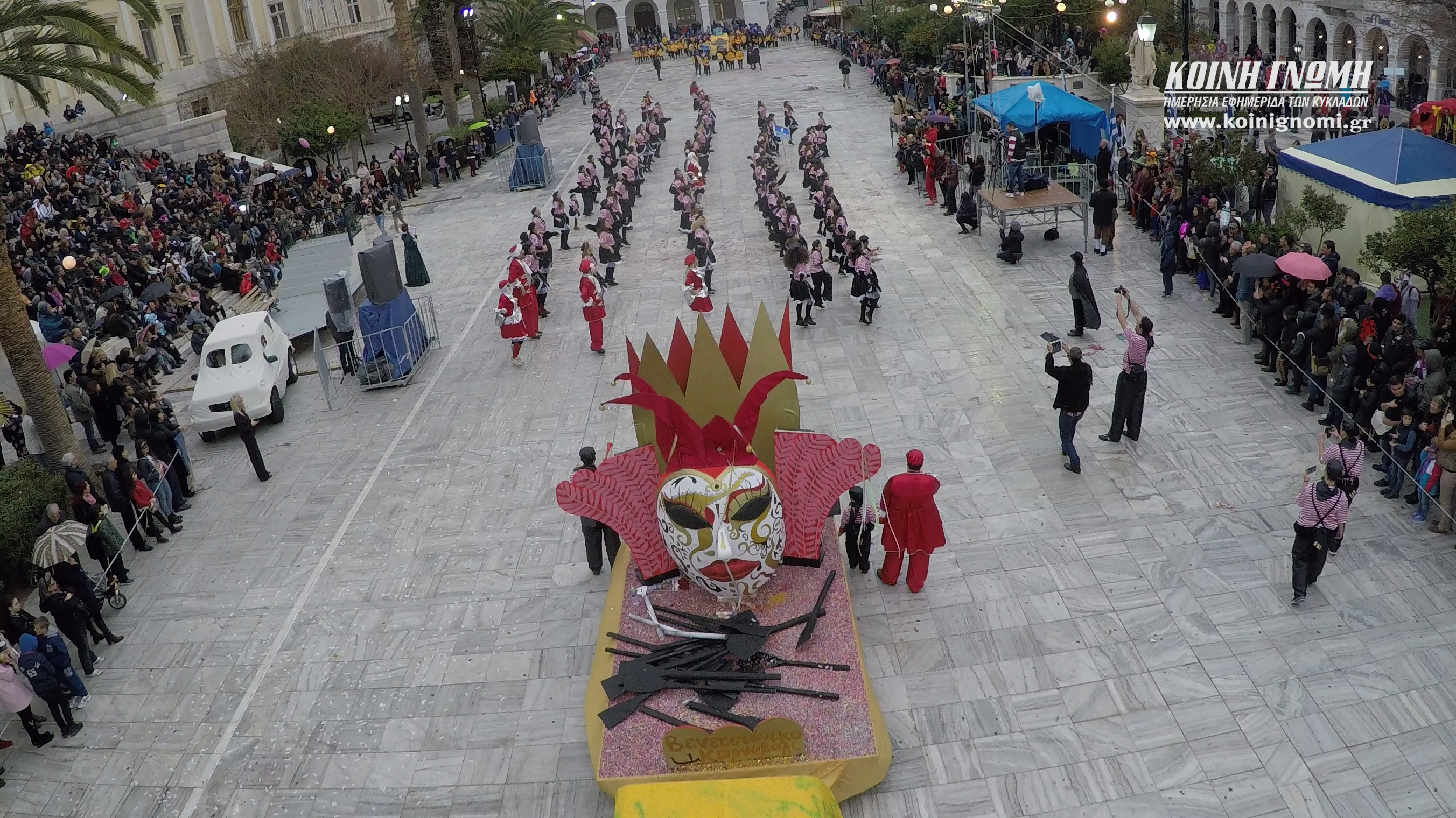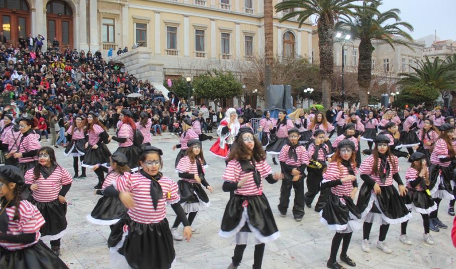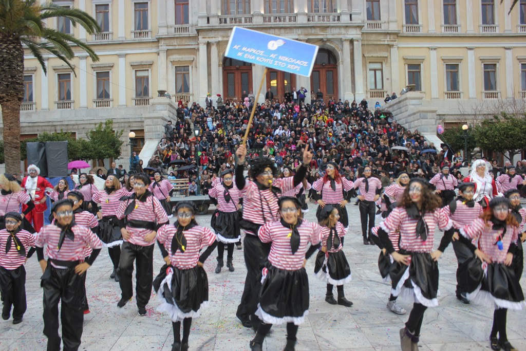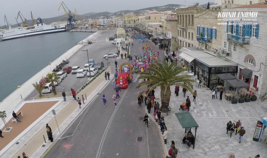Η μεγάλη παρέλαση των καρναβαλικών ομάδων στους δρόμους της Ερμούπολης πραγματοποιήθηκε το απόγευμα της Κυριακής, παρουσία πλήθους κατοίκων και επισκεπτών του νησιού που ενθάρρυναν και αποθέωναν τους συμμετέχοντες με επευφημίες και το ζεστό "χειροκρότημά" τους.