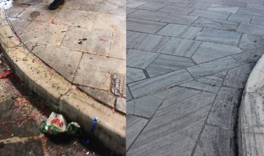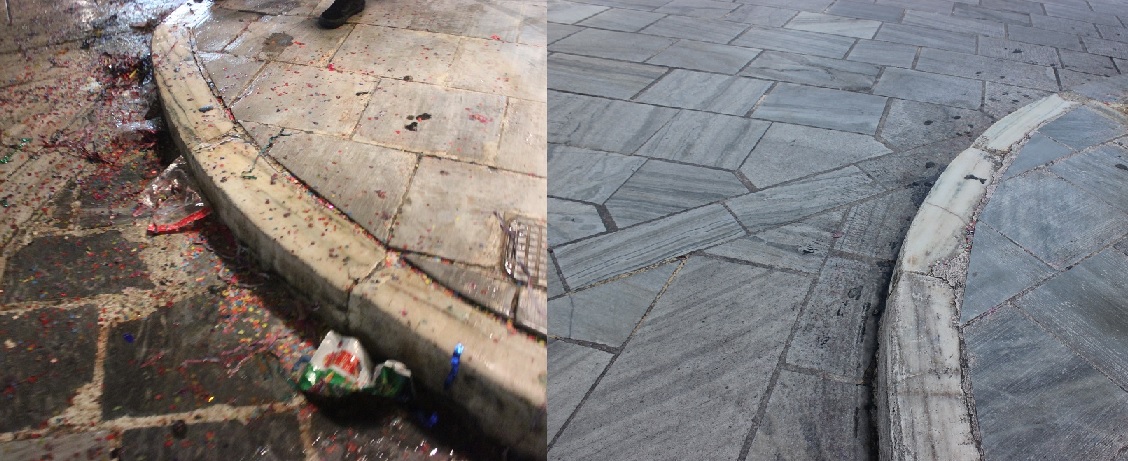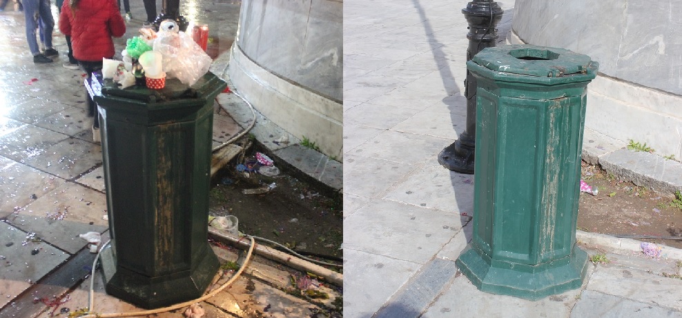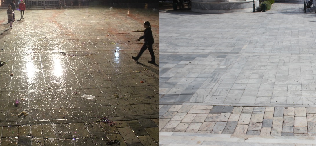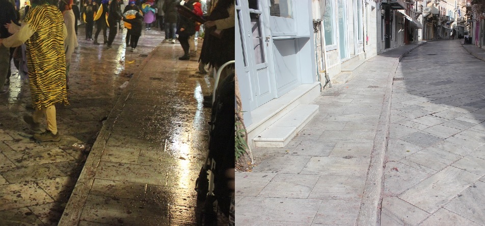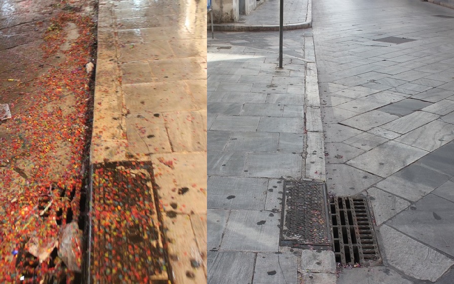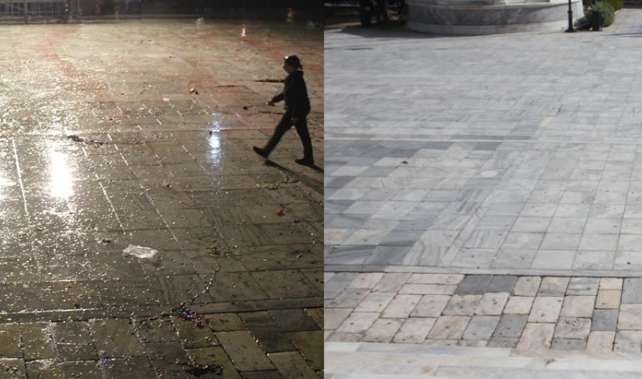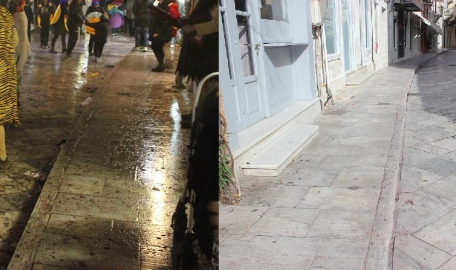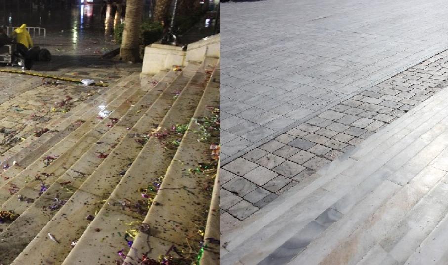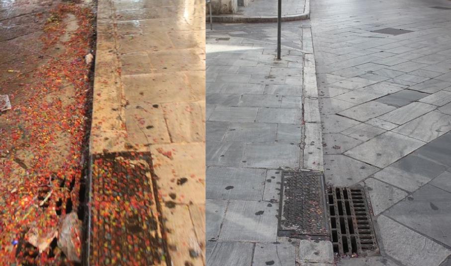 Σερπαντίνες, κονφετί, μπουκάλια από μπύρες και αλκοολούχα ποτά που είχαν πεταχτεί σε αρκετά σημεία, καθώς όμως και συσκευασίες από λιχουδιές και γλυκίσματα δίπλα σε κάδους απορριμμάτων, περιμετρικά της εξέδρας της Φιλαρμονικής Μουσικής αλλά και κοντά σε φρεάτια των δρόμων, απομακρύνθηκαν και συλλέχθηκαν προκειμένου η πόλη να επιστρέψει στην καθημερινή εικόνα της.