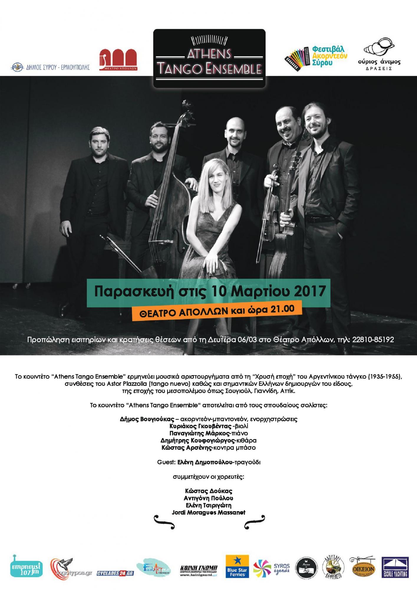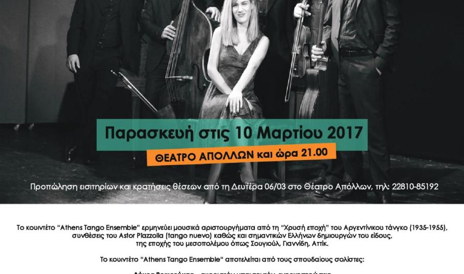 2017, συναυλία στο Θέατρο Απόλλων, με το μουσικό σχήμα «Athens Tango Ensemble», ένα από τα μεγαλύτερα μουσικά σχήματα Τάνγκο στην Ελλάδα, το οποίο θα συνοδεύουν η τραγουδίστρια Ελένη Δημοπούλου και δύο ζευγάρια χορευτών.