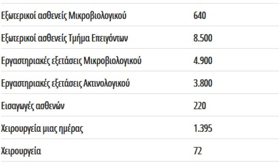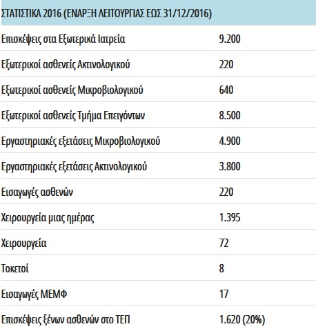 Ιδιαίτερο ενδιαφέρον παρουσιάζουν και τα στοιχεία επισκεψιμότητας της Νοσηλευτικής Μονάδας μέχρι το τέλος του περασμένου έτους. Συγκεκριμένα, καταγράφηκαν 9.200 επισκέψεις στα εξωτερικά ιατρεία, 220 ασθενείς ακτινολογικού, 640 μικροβιολογικού, 8.500 στο τμήμα επειγόντων και 4.900 ασθενείς που θέλησαν και πραγματοποίησαν εργαστηριακές εξετάσεις στο μικροβιολογικό. Επιπλέον, προσήλθαν 3.800 πολίτες για εργαστηριακές εξετάσεις ακτινολογικού, ενώ έγιναν και 220 εισαγωγές ασθενών, 1.395 χειρουργεία μία ημέρας, 72 χειρουργεία, 8 τοκετοί, 17 εισαγωγές ΜΕΜΦ και τέλος, καταμετρήθηκαν 1.620 επισκέψεις ασθενών στο ΤΕΠ.