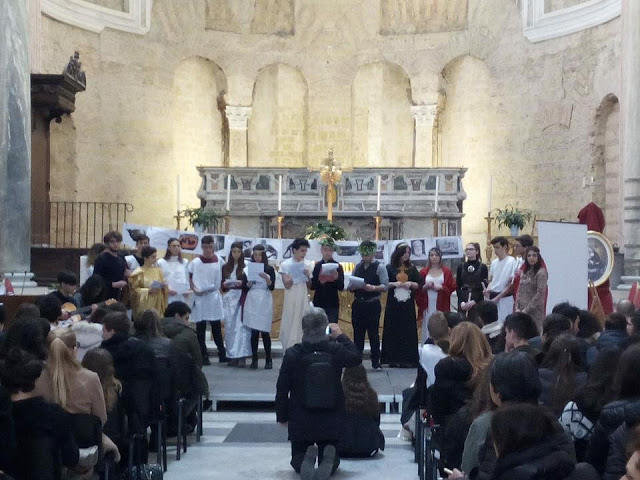 Σε ένα θαυμάσιο νεοκλασικό κτίριο με εξαιρετική διακόσμηση, Ιταλοί μαθητές κλασσικών Λυκείων τίμησαν την ελληνική γλώσσα μ' έναν ιδιαίτερο τρόπο. Όπως φαίνεται και από τις φωτογραφίες, ήταν πάρα πολλοί άνθρωποι παρόντες για να ακούσουν τους νεαρούς μαθητές και τις μαθήτριες να απαγγέλλουν αρχαιοελληνικά κείμενα. Η ομάδες των μαθητών άλλαζαν κάθε λίγο. Ο κάθε μαθητής διάβαζε ένα μέρος κειμένου από αρχαίο Έλληνα φιλόσοφο και ακολουθούσε ο δεύτερος, ο τρίτος κ.α. συνεχίζοντας με κείμενα άλλου αρχαίου φιλοσόφου ή ποιητού. Το σημαντικό είναι ότι αυτές τις αναγνώσεις συνόδευε μια ομάδα νεαρών μουσικών. Οι μεγαλύτεροι σε ηλικία μαθητές είχαν φορέσει αρχαιοελληνικά ενδύματα παρουσιάζοντας κείμενα αρχαίων ποιητών, φιλοσόφων και τραγωδών.