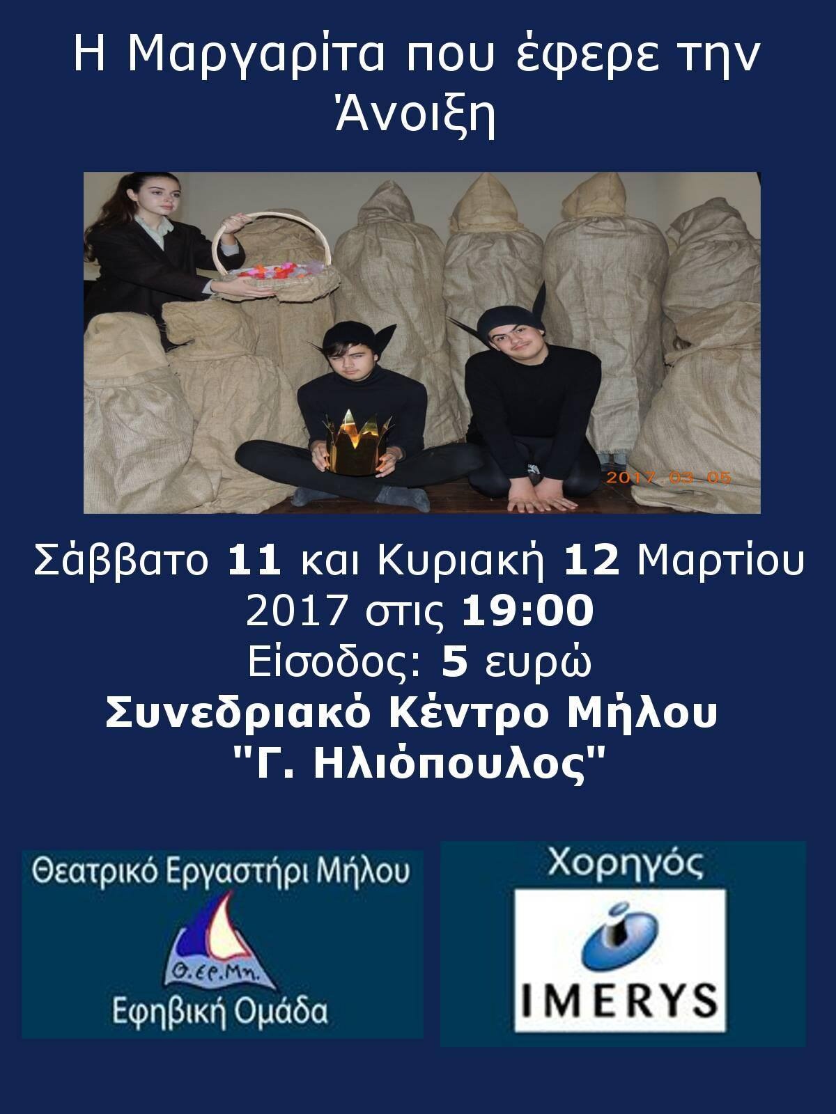 στο Συνεδριακό Κέντρο Μήλου "Γ. Ηλιόπουλος ", στις 7 μμ, το παιδικό θεατρικό έργο "Η Μαργαρίτα που έφερε την άνοιξη".