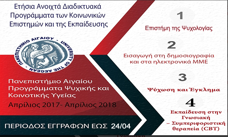 Το Πανεπιστήμιο Αιγαίου με τα Προγράμματα Ψυχικής και Κοινοτικής Υγείας προκηρύσσουν τέσσερα νέα Ετήσια Ανοιχτά Διαδικτυακά Προγράμματα εκπαίδευσης για δεύτερη συνεχή χρονιά στο αντικείμενο των Κοινωνικών Επιστημών.