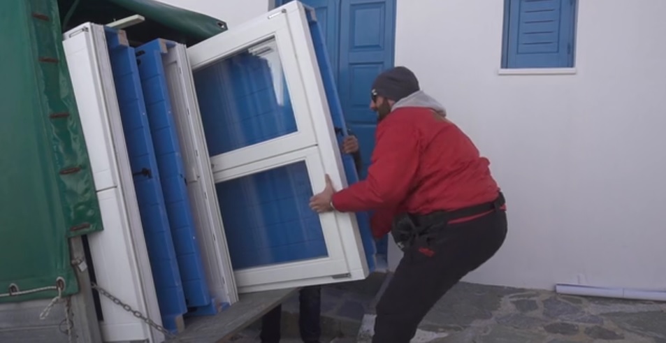 Μέσα σε μία ημέρα, η ομάδα κατάφερε να αντικαταστήσει τα παλιά κουφώματα με καινούρια τα οποία είχαν κατασκευάσει και προσφέρει δωρεάν χορηγοί από τη Σύρο. (Ξυλοτεχνική Σύρου, Στιλβωτήριο Αντώνη Συριανού, χρώματα Vernilac).