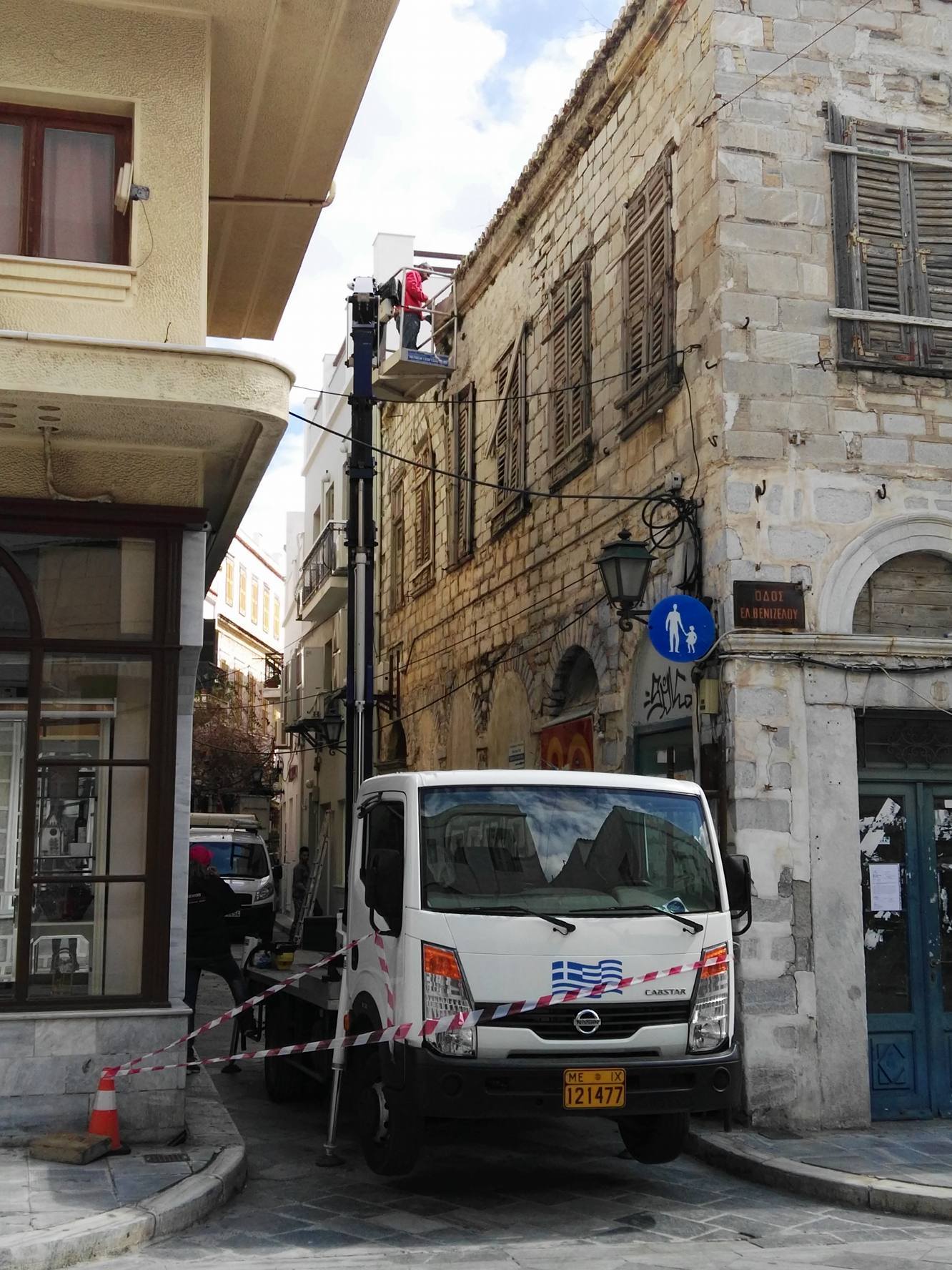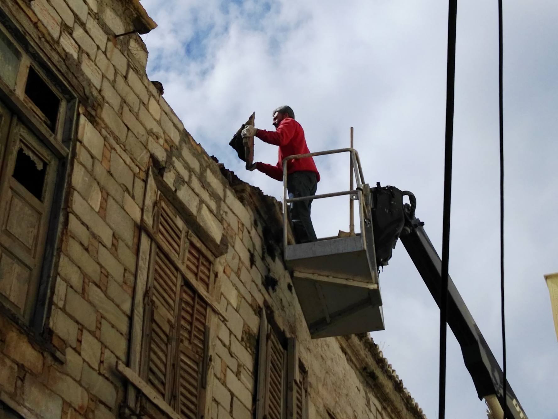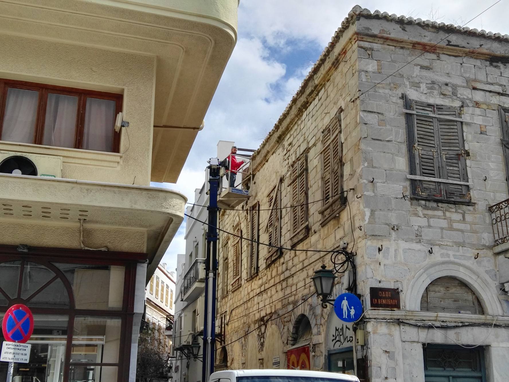 Συγκεκριμένα, από νωρίς το πρωί της Τρίτης, η οδός Κωτσοβίλη αποκλείστηκε με ειδική απαγορευτική – προειδοποιητική ταινία από το ύψος της συμβολής της με την οδό Ελ. Βενιζέλου (πρώην Ερμού), με σκοπό τη μετακίνηση γερανοφόρου οχήματος για την αφαίρεση των επικίνδυνων επιχρισμάτων, πλακών, ξύλινων σημείων και σοβάδων από την επιφάνεια και την οροφή μεγάλου ακινήτου. Εργάτης της αρμόδιας υπηρεσίας, επί αρκετές ώρες επιχείρησε να υλοποιήσει ένα μεγάλο μέρος των προγραμματισμένων εργασιών, με σκοπό την αποφυγή πτώσης παλαιού τμήματος της εξωτερικής επιφάνειας του κτιρίου, προκειμένου να μην προκληθεί ατύχημα σε πεζό συμπολίτη μας.