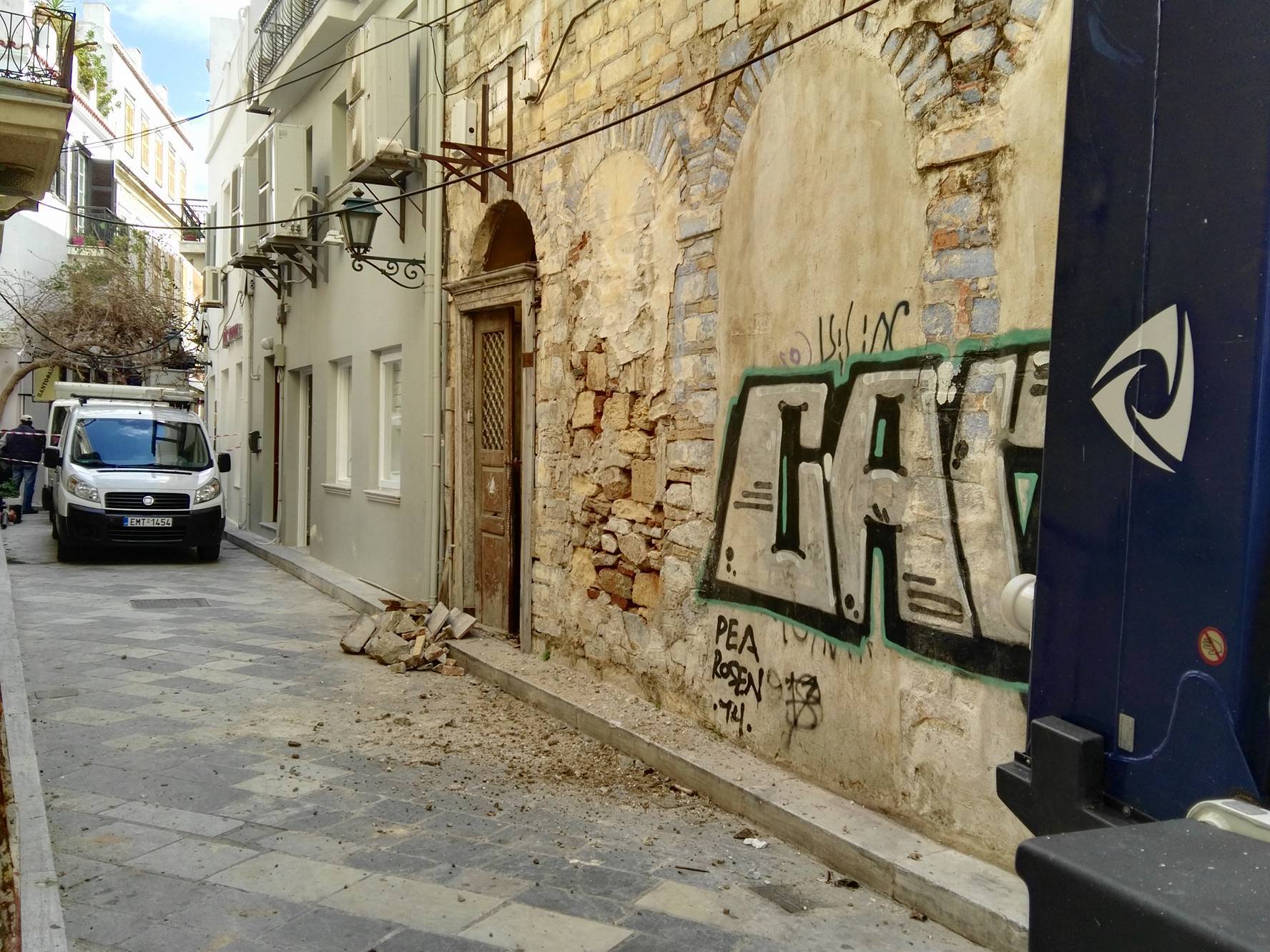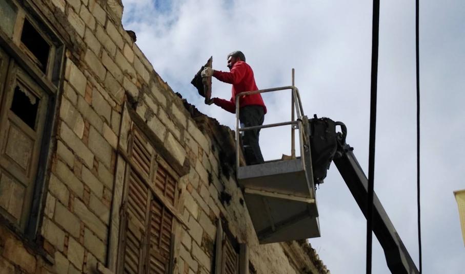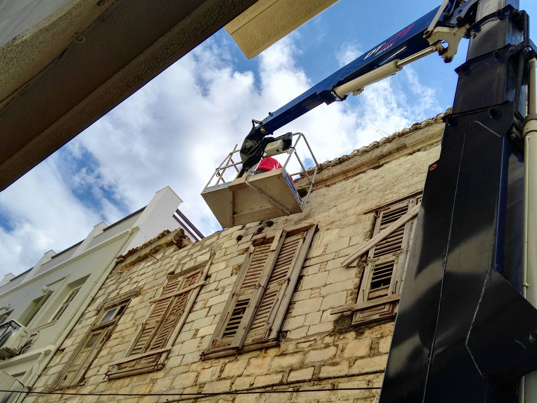 Συγκεκριμένα, από νωρίς το πρωί της Τρίτης, η οδός Κωτσοβίλη αποκλείστηκε με ειδική απαγορευτική – προειδοποιητική ταινία από το ύψος της συμβολής της με την οδό Ελ. Βενιζέλου (πρώην Ερμού), με σκοπό τη μετακίνηση γερανοφόρου οχήματος για την αφαίρεση των επικίνδυνων επιχρισμάτων, πλακών, ξύλινων σημείων και σοβάδων από την επιφάνεια και την οροφή μεγάλου ακινήτου. Εργάτης της αρμόδιας υπηρεσίας, επί αρκετές ώρες επιχείρησε να υλοποιήσει ένα μεγάλο μέρος των προγραμματισμένων εργασιών, με σκοπό την αποφυγή πτώσης παλαιού τμήματος της εξωτερικής επιφάνειας του κτιρίου, προκειμένου να μην προκληθεί ατύχημα σε πεζό συμπολίτη μας.