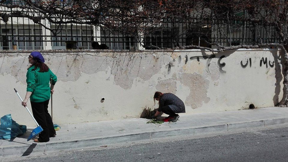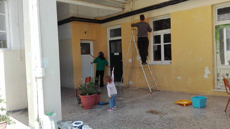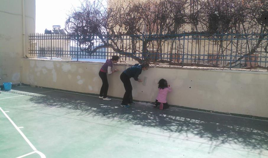 Το εγχείρημα αγκαλιάστηκε από μία μικρή ομάδα δέκα γονέων, οι οποίοι έξυσαν και στόκαραν τους τοίχους, έβαλαν σοβά όπου χρειαζόταν και πέρασαν τα πρώτα χέρια της βάσης, πάνω στην οποία θα ζωγραφίσουν στη συνέχεια με τη βοήθεια των παιδιών. Στις εργασίες βοήθησαν σημαντικά και οι Διευθύντριες του Δημοτικού Σχολείου και του Νηπιαγωγείου.