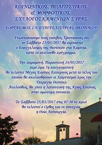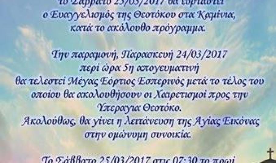 Το Σάββατο 25 Μαρτίου θα εορτασθεί ο Ευαγγελισμός της Θεοτόκου στα Καμίνια κατά το πρόγραμμα, όπως αυτό έχει ανακοινωθεί από τον Κοινωνικό Πολιτιστικό και Μορφωτικό Σύλλογο της περιοχής.