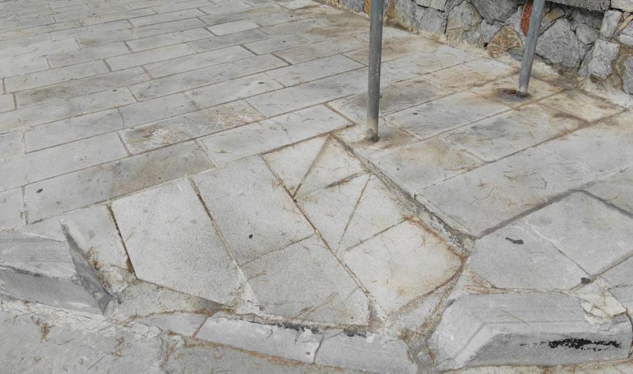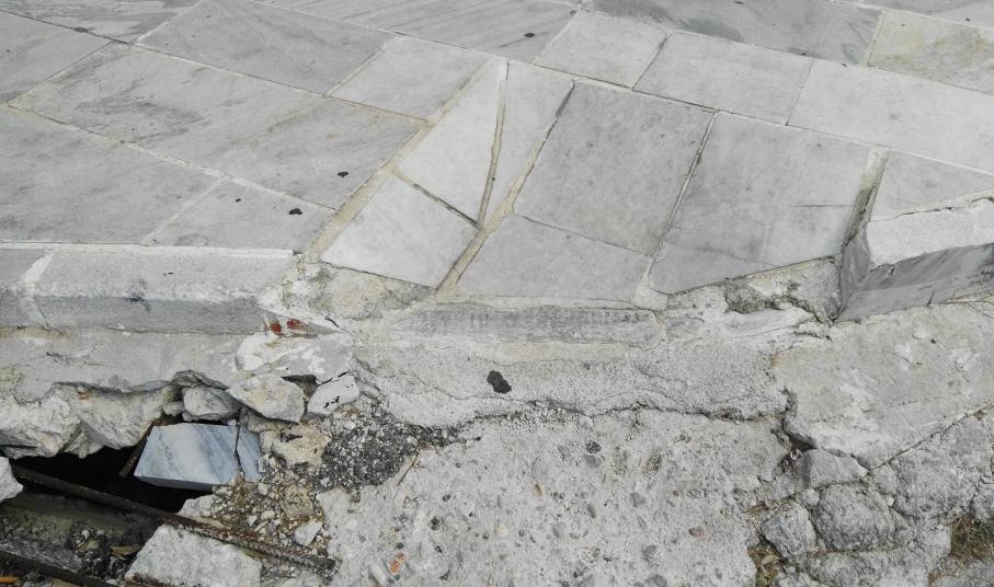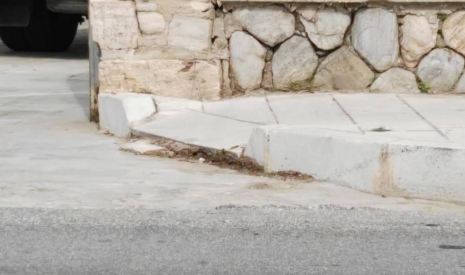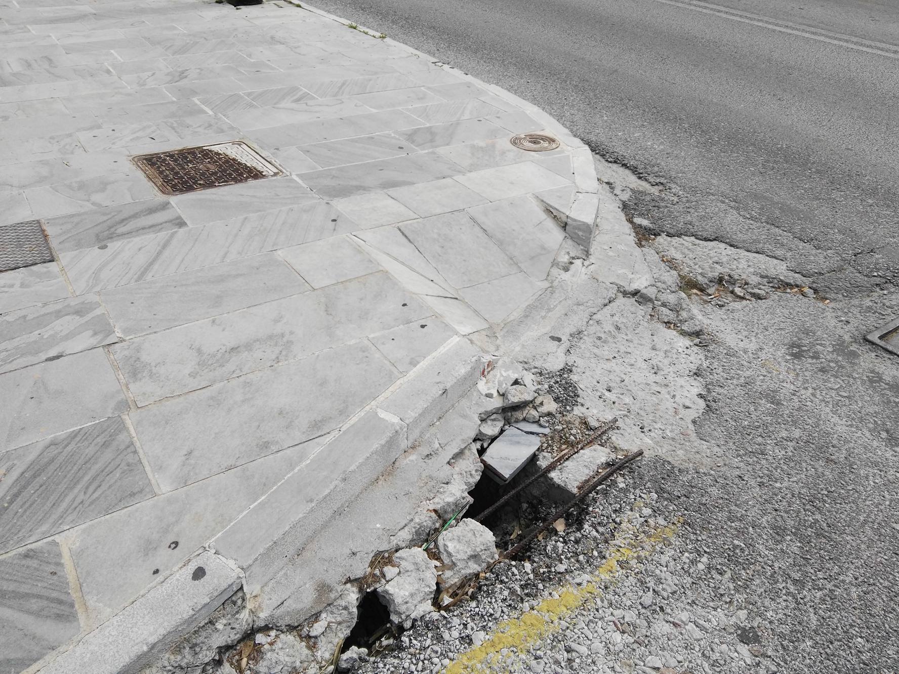 Σοβαρές φθορές στη έναρξη των πεζοδρομίων και συγκεκριμένα στα ταπεινωμένα μαρμάρινα τμήματα, όπως σπάσιμο πλακών, αλλά ακόμη και ξήλωμα της ασφάλτου που αποτελεί συνέχειά τους, με αποτέλεσμα να έχουν έρθει στην επιφάνεια μέχρι και σίδερα (εξοπλισμός) που βρίσκονταν κάτω από την επιφάνεια του οδοστρώματος, “στήνουν” μεγάλους κινδύνους σε όσους συμπολίτες μας που μετακινούνται με αναπηρικά αμαξίδια.