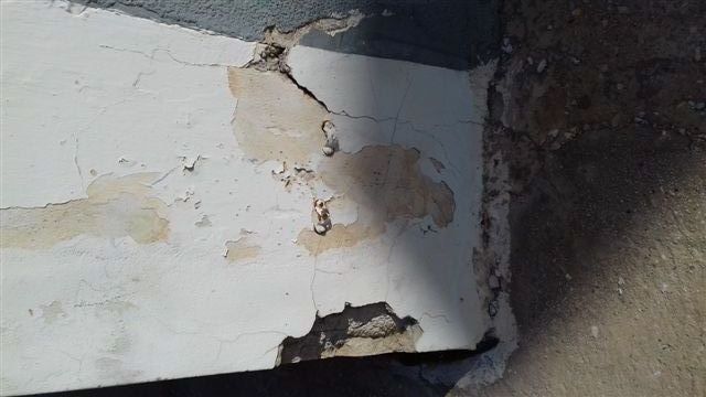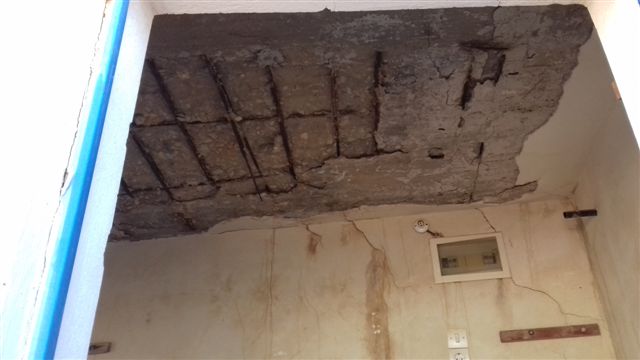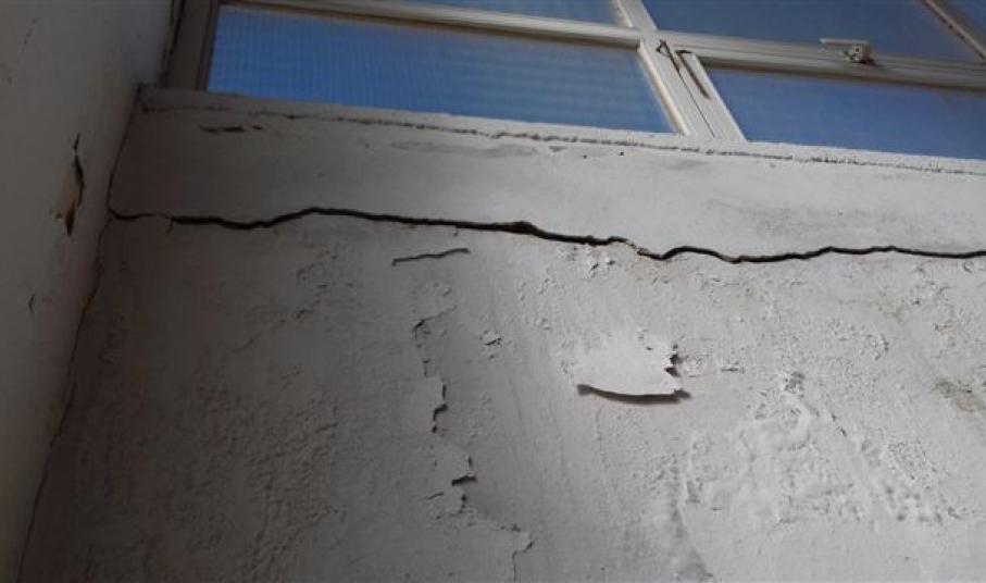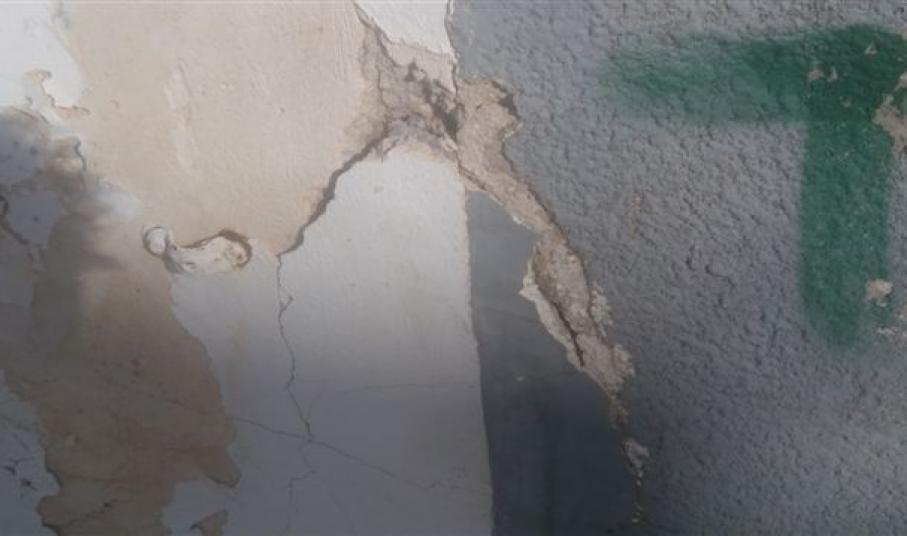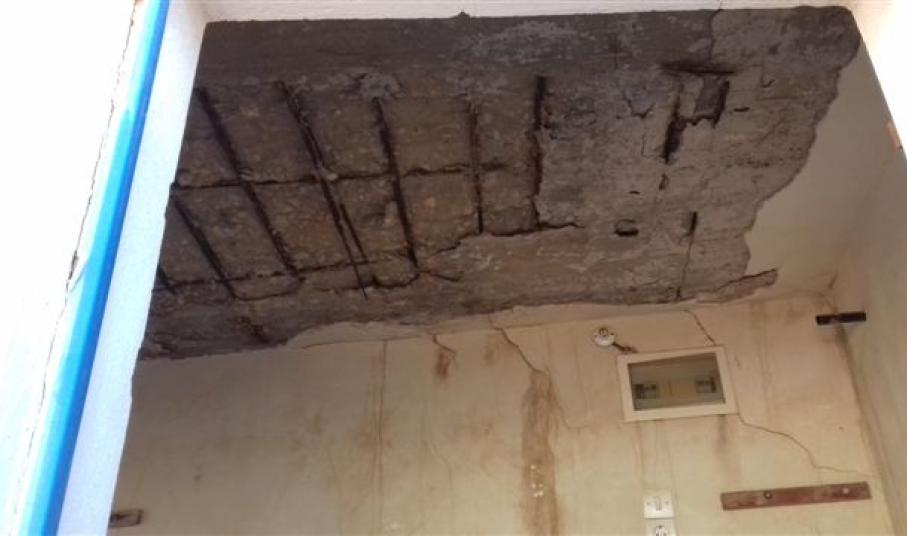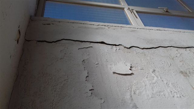 «1. Στην κλειστή αίθουσα γυμναστικής υπάρχουν εκτεταμένες αποκολλήσεις του επιχρίσματος και τμημάτων της επικάλυψης από σκυρόδεμα του οπλισμού (οξείδωση), με κίνδυνο την επιπλέον αποκόλληση τμημάτων και πτώση αυτών σε ανύποπτο χρόνο και πρόκλησης ατυχήματος σε χρήστες του χώρου. Διαπιστώθηκαν εκτεταμένες υγρασίες τόσο στην οροφή του κτιρίου όσο και περιμετρικά της αίθουσας, με αποτέλεσμα την αποσάθρωση του επιχρίσματος και σημειακή αποκόλληση αυτού. Επιπλέον, παρατηρήθηκαν ρωγμές σε όλα τα υποστυλώματα της αίθουσας, εσωτερικά και εξωτερικά του κτίσματος. Στα παράθυρα διαπιστώθηκαν εκτεταμένες οξειδώσεις στα σημεία στήριξης με την τοιχοποιία, με ένδειξη σοβαρής πιθανότητας πτώσης τους και κίνδυνο πρόκλησης ατυχήματος (εσωτερικά και εξωτερικά του κτιρίου). Τα διαφώτιστα πάνελ τους είναι ραγισμένα και κατά τόπους κατεστραμμένα και λόγω κακής στήριξης μετακινούνται από τις ριπές του αέρα. Δεν έγινε έλεγχος του δώματος της αίθουσας, όμως από τα εμφανή σημάδια υπό μορφή καμπυλών, από σταδιακή εξάτμιση νερού, διαπιστώνεται εισροή υδάτων λόγω έλλειψης υγρομόνωσης στο κτίριο.