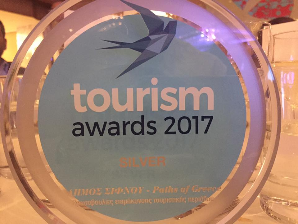 Στους πρωταθλητές του ελληνικού τουρισμού για το 2017 συγκαταλέγεται ο Δήμος Σίφνου, ο οποίος απέσπασε από κοινού με την Κοιν.Σ.Επ. “Paths of Greece” το ασημένιο μετάλλιο (SILVER) στα φετινά βραβεία «Tourism Awards», υπό την αιγίδα του Υπουργείου Τουρισμού και του ΕΟΤ.