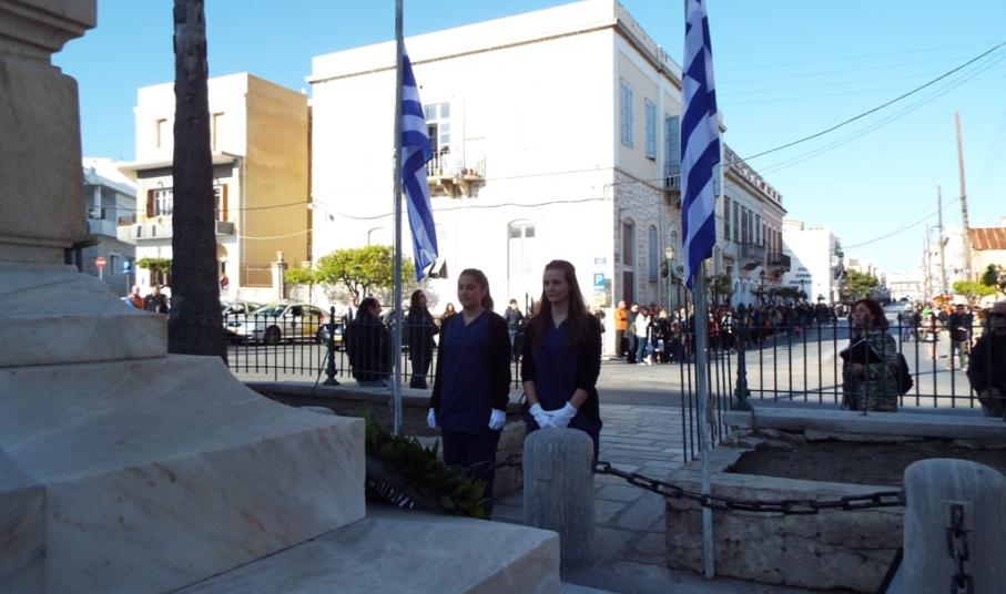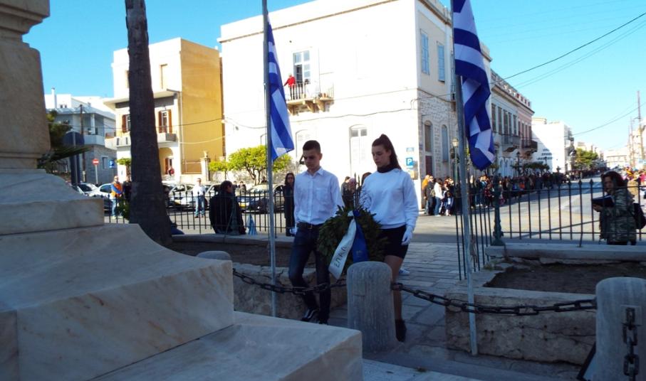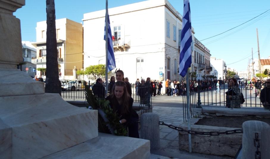 Ευθύς αμέσως, οι μαθητές αναχώρησαν για το Ηρώο των Πεσόντων στην πλ. Ηρώων, όπου και κατέθεσαν στεφάνι οι μαθητές του ΕΠΑΛ Σύρου, του 3ου Γυμνασίου Σύρου, του 5ου Δημοτικού Σχολείου Ερμούπολης, του Εσπερινού ΕΠΑΛ Σύρου και οι σπουδαστές και σπουδάστριες του Δημόσιου Ινστιτούτου Επαγγελματικής Κατάρτισης (ΔΙΕΚ) του Γενικού Νοσοκομείου Σύρου.