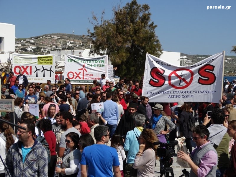Από το βήμα, που είχε στηθεί στην πλατεία Μαντώ Μαυρογένους, μίλησαν ο Δήμαρχος Πάρου, κ. Μάρκος Κωβαίος, ο Έπαρχος της Περιφερειακής Ενότητας Πάρου, κ. Κωνσταντίνος Μπιζάς, εκπρόσωποι της Εκκλησίας, οι επικεφαλής των δημοτικών παρατάξεων, καθώς επίσης εκπρόσωποι τοπικών φορέων και συλλογικοτήτων, εμφανίζοντας εικόνα πλήρους ομοψυχίας, ενάντια στην απόφαση του Υπουργείου Περιβάλλοντος (18 Δεκέμβριου 2014), σύμφωνα με την οποία πρόκειται να εγκατασταθούν Βιομηχανικά Αιολικά Πάρκα τα οποία θα εκτείνονται σε οκτώ διαφορετικές τοποθεσίες σε όλο το νησί και θα περιλαμβάνουν σε πρώτη φάση 22 ανεμογεννήτριες ύψους 100 μέτρων και ισχύος 2,3 ΜW έκαστη.