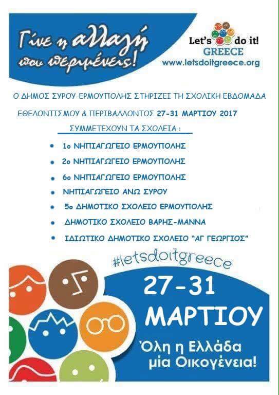 Σε ρυθμούς “Let’s do it Greece” κινείται η Σύρος, συμμετέχοντας και φέτος στο μεγάλο πανελλαδικό, εθελοντικό - περιβαλλοντικό πρόγραμμα, και φιλοδοξεί να κάνει δυναμική την παρουσία της, μιας και έχουν προγραμματιστεί πολλές και ποικίλες δράσεις σε διάφορες περιοχές του νησιού. Λόγω του μεγάλου αριθμού τους, οι δράσεις ξεκίνησαν από την Κυριακή 26 Μαρτίου και θα διαρκέσουν καθ’ όλη τη διάρκεια της τρέχουσας εβδομάδας, για να κορυφωθούν και να ολοκληρωθούν, την Κυριακή 2 Απριλίου που είναι και η βασικότερη ημέρα του προγράμματος σε πανελλαδικό επίπεδο.