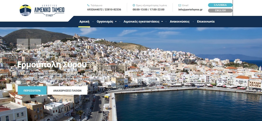Απόφαση που ήρθε να αγκαλιάσει τις ανάγκες ενημέρωσης των επισκεπτών που προσεγγίζουν τη Σύρο, την Κέα, την Κύθνο και τη Σέριφο αποτελεί και η δημιουργία του σύγχρονου portal (portofsyros), το οποίο και δημιουργήθηκε με απόφαση του ΔΣ, με σκοπό την παροχή πληροφοριών προς τους χρήστες τόσο των λιμένων, όσο και των αλιευτικών και τουριστικών καταφυγίων. Ειδικότερα, με δαπάνη που ανήλθε στο ποσό των 9.280 ευρώ εντός ενός μήνα, προέκυψε η πληρέστατη ιστοσελίδα του Λιμενικού Ταμείου Σύρου, η οποία και παραδόθηκε στο ΔΣ, λίγο πριν την επίσημη παρουσίασή του στις 29 Ιουνίου του 2016. Το συγκεκριμένο εργαλείο, η διαδικτυακή πύλη, παρέχει τη δυνατότητα ενημέρωσης στους ενδιαφερόμενους πολίτες σε επίπεδο παροχών προς τα σκάφη, τα ιστιοπλοϊκά και τα κότερα, καθώς επίσης περιλαμβάνει, τα προγράμματα της κρουαζιέρας και τις προγραμματισμένες προσεγγίσεις, ενώ παρέχει ενημέρωση για τα βασικά και απαραίτητα χαρακτηριστικά των λιμενικών εγκαταστάσεων στο σύνολο των νησιών. Επιπλέον, σε ειδική κατηγορία γίνεται αναφορά σε μεγάλα έργα και παρεμβάσεις αναβάθμισης των χερσαίων ζωνών, ενώ περιλαμβάνεται και ξεχωριστή μνεία για θέματα πολιτιστικής κληρονομιάς που συνδέονται με τις ζώνες ευθύνης του Λιμενικού Ταμείου Σύρου. Αξίζει να επισημανθεί πως, βασικό χαρακτηριστικό του portal είναι η ανάδειξη των τεσσάρων νησιών μέσω αξιόλογου φωτογραφικού υλικού, ενώ πρέπει να καταστεί σαφές ότι, το περιεχόμενό του επικαιροποιείται συστηματικά.