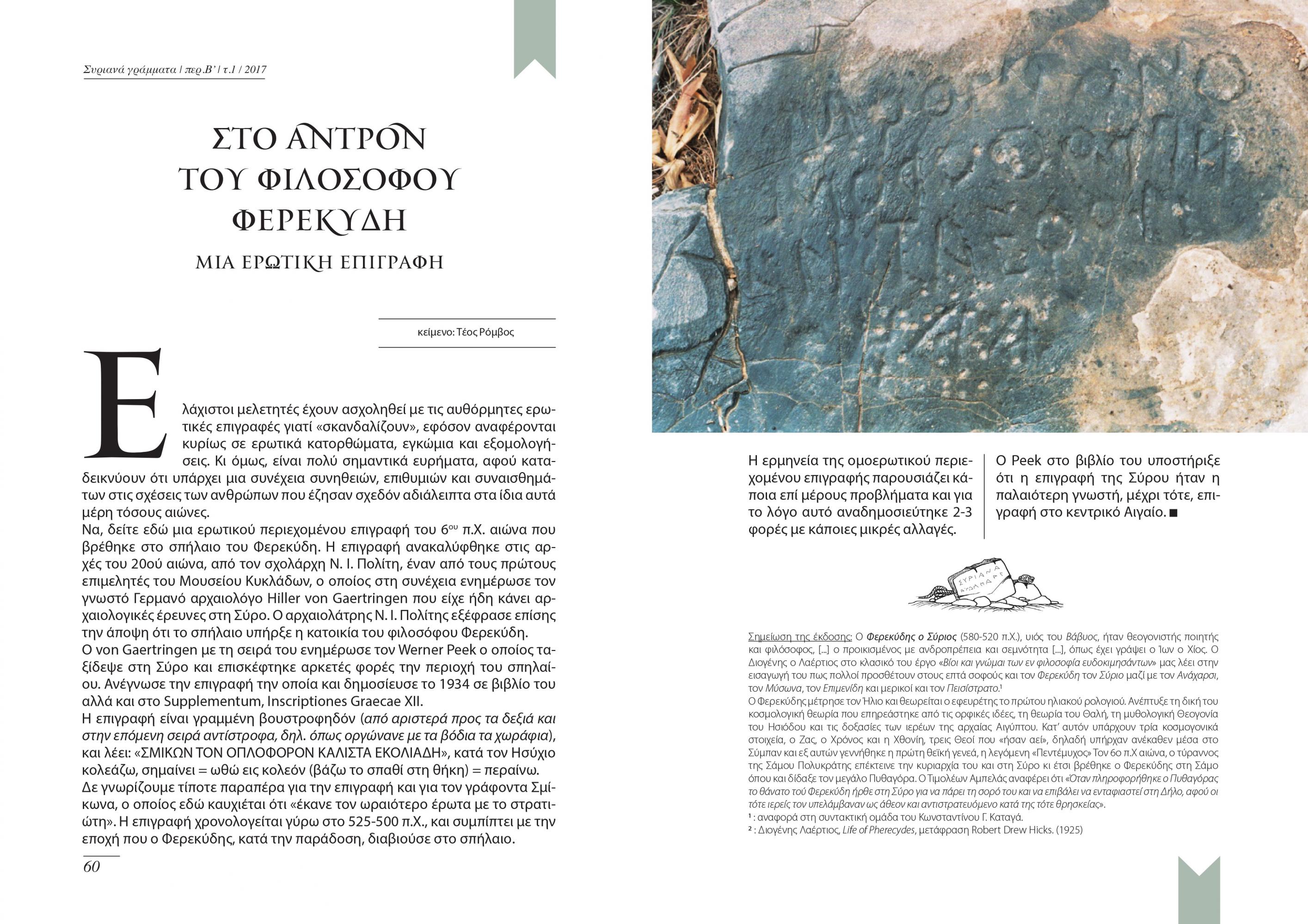 Η επανέκδοση του αγαπημένου περιοδικού εκατοντάδων Συριανών και όχι μόνον, οι οποίοι είχαν την ευκαιρία και την τύχη να διαβάσουν παλαιές εκδόσεις από τα τεύχη της Α΄ περιόδου των Συριανών Γραμμάτων, έρχεται να εμπνεύσει και τις νεότερες γενιές, στην κατεύθυνση της ουσιαστικής γνωριμίας με το νησί και τον ιδιαίτερο χαρακτήρα του, μέσα από εμπεριστατωμένες, αλλά κι επιστημονικές αναφορές.