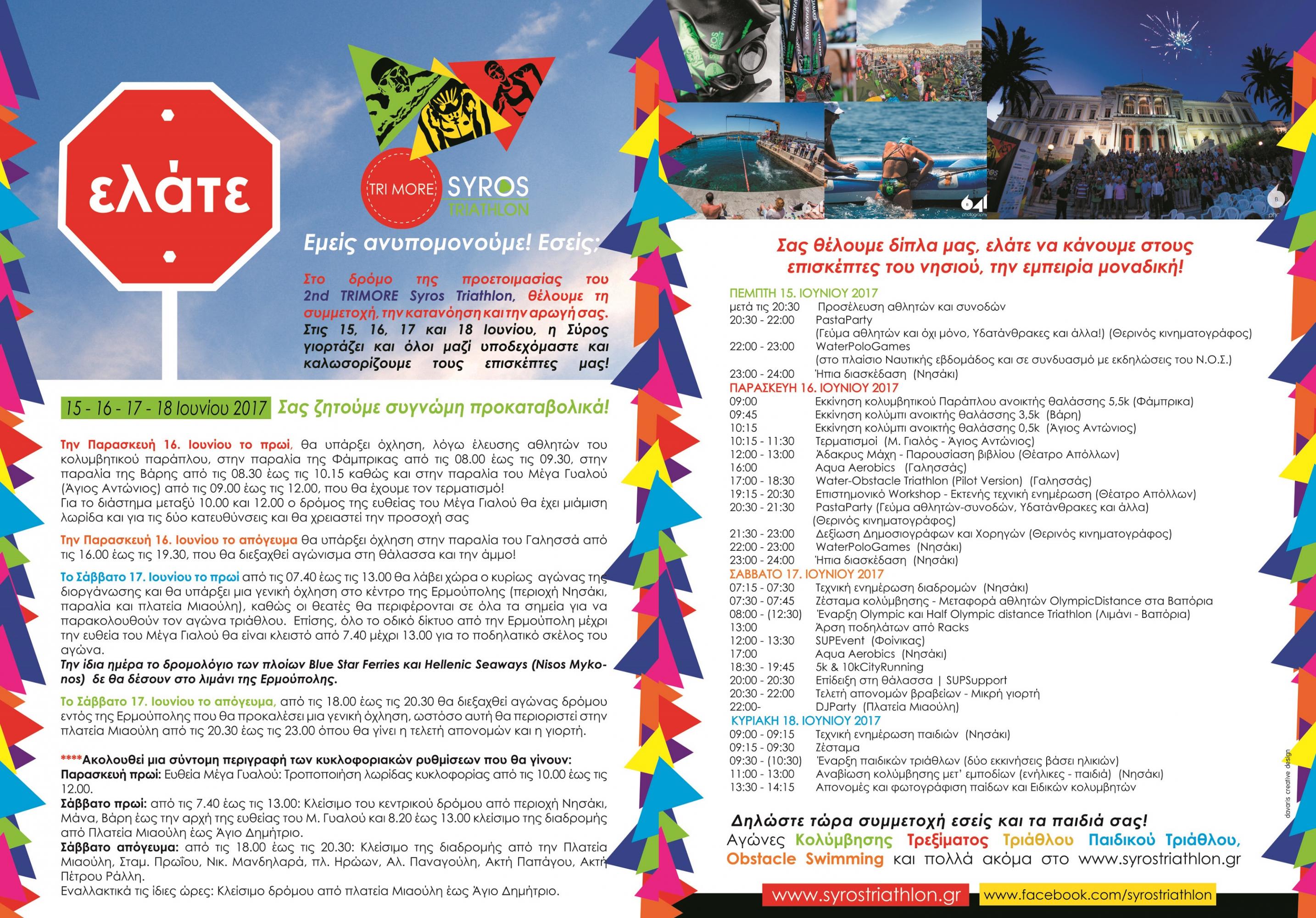 Λόγω της διεξαγωγής της διοργάνωσης Trimore Syros Triathlon το πρωί του Σαββάτου της 17ης Ιουνίου στην Ερμούπολη της Σύρου και ειδικότερα της πραγματοποίησης του βασικού αγώνα στο λιμάνι της πόλης, δεν θα καταπλεύσουν τα πλοία της Blue Star Ferries και της Hellenic Seaways (Βlue Star Naxos, Nissos Mykonos) που εκτελούν τα πρωινά δρομολόγια.