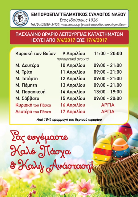 Τις μέρες και ώρες που θα λειτουργήσουν τα εμπορικά καταστήματα κατά την περίοδο του Πάσχα ανακοινώνει ο Εμποροεπαγγελματικός Σύλλογος Νάξου.