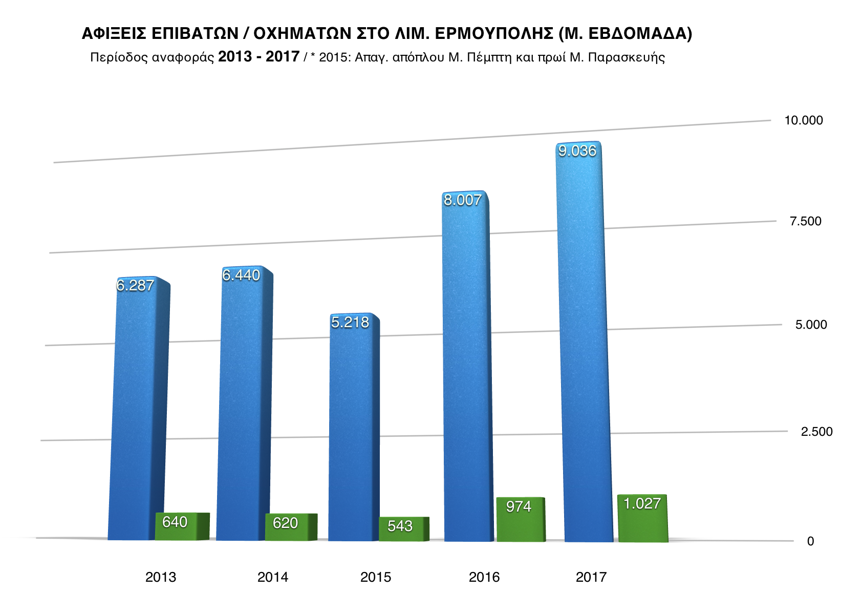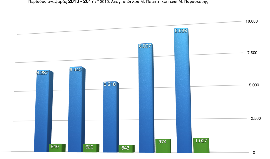 Την ικανοποίησή του για την τουριστική κίνηση που καταγράφηκε στη Σύρο τις ημέρες του Πάσχα (9.036 αφίξεις), εξέφρασε στην «Κοινή Γνώμη» ο Δήμαρχος κ. Γιώργος Μαραγκός, κάνοντας λόγο για αύξηση 12,9% από το 2016 (8.007 αφίξεις), 73,3% από το 2015 (5.218 αφίξεις) και 40,3% από το 2014 (6.440 αφίξεις). Σημειώνεται ότι το χαμηλό ποσοστό του 2015 οφείλεται σε μεγάλο βαθμό στο απαγορευτικό απόπλου που ήταν σε ισχύ τη Μεγάλη Πέμπτη και το πρωί της Μεγάλης Παρασκευής. Οι αφίξεις επιβατών και οχημάτων αποτυπώνονται αναλυτικά στο παρακάτω γράφημα.