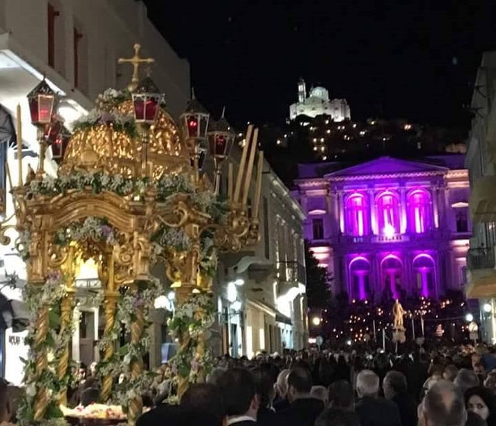 Αξίζει να σημειωθεί ότι, προηγήθηκε η περιφορά του Επιταφίου του Ιερού Ναού Ευαγγελιστρίας Ερμουπόλεως της Καθολικής Εκκλησίας.