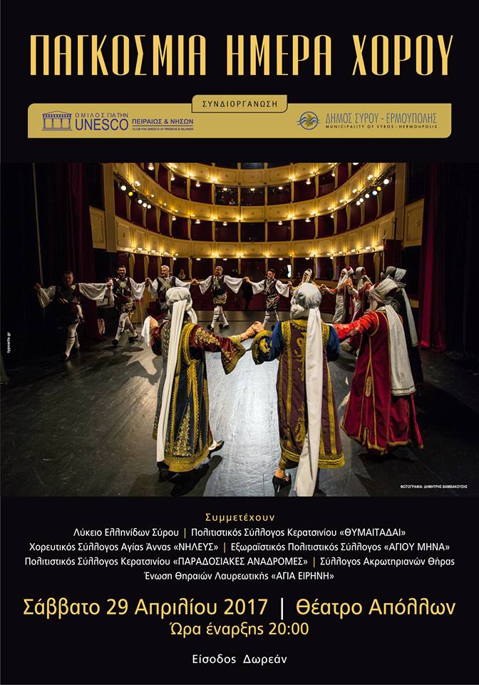 Στο πλαίσιο της Παγκόσμιας Ημέρας Χορού, το Σάββατο 29 Απριλίου 2017 και ώρα 20:00, στο Θέατρο Απόλλων, θα πραγματοποιηθεί εκδήλωση από τον Δήμο Σύρου – Ερμούπολης, σε συνδιοργάνωση με τον Όμιλο για την UNESCO Πειραιώς & Νήσων.