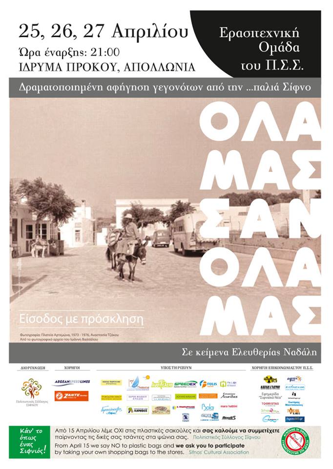 Ο Πολιτιστικός Σύλλογος Σίφνου, παρουσιάζει την εκδήλωση "Όλα μας... σαν όλα μας”, μια δραματοποιημένη αφήγηση γεγονότων από την ...παλιά Σίφνο, από την ερασιτεχνική ομάδα του Π.Σ.Σ., σε κείμενα Ελευθερίας Ναδάλη.