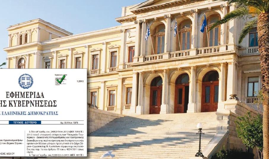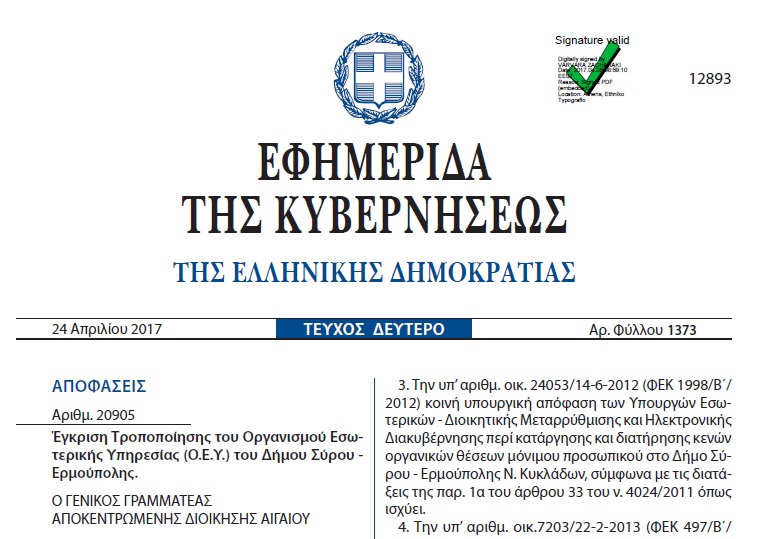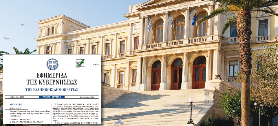 Εγκεκριμένος και δημοσιευμένος σε ΦΕΚ είναι πλέον ο νέος Οργανισμός Εσωτερικής Υπηρεσίας (ΟΕΥ) του Δήμου Σύρου – Ερμούπολης, με τη σχετική έκδοση του φύλλου της Εφημερίδας της Κυβερνήσεως στις 24 Απριλίου του 2017, να ανάβει το “πράσινο φως” για την εφαρμογή του από την πλευρά της Δημοτικής Αρχής.