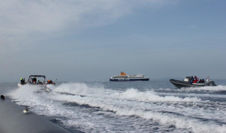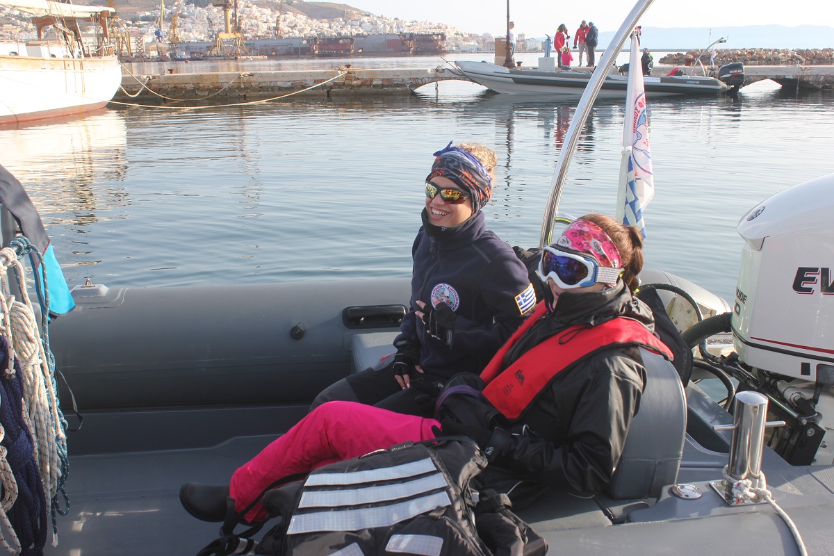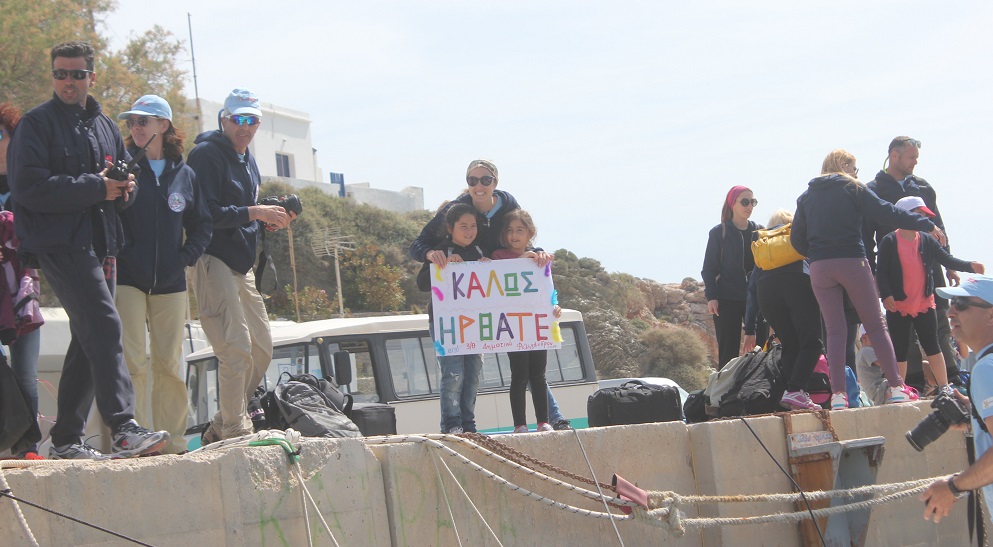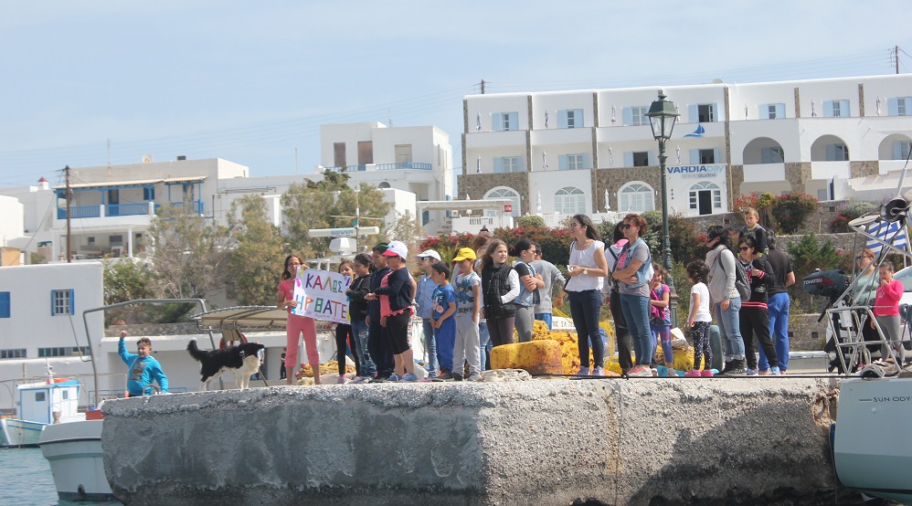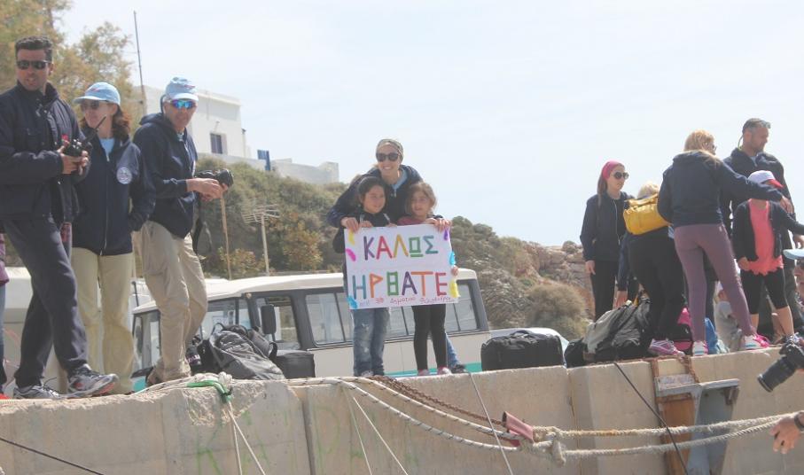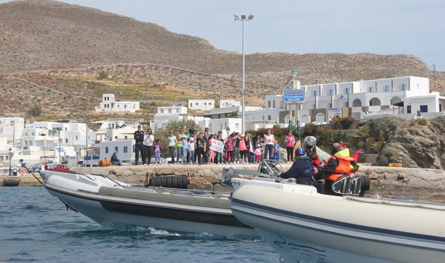 Πέντε φουσκωτά το Ομίλου και ένα της WWF ξεκίνησαν το ταξίδι τους νωρίς το πρωί από τη Μαρίνα της Σύρου. Λίγο πριν τις 11, μαθητές του τριθέσιου Δημοτικού Σχολείου Φολεγάνδρου καλωσόρισαν τα πληρώματα στο λιμάνι του νησιού, χαρίζοντας τους απλόχερα χαμόγελα, αγκαλιές και ένα όμορφο πανό, με το οποίο εκδήλωσαν τη χαρά τους.