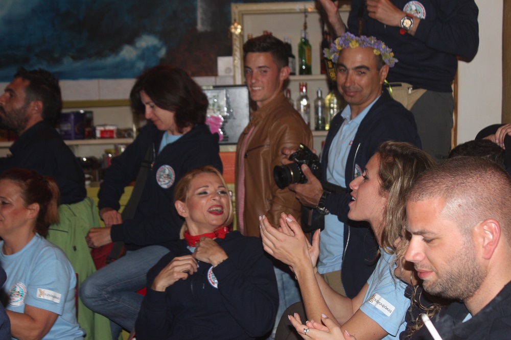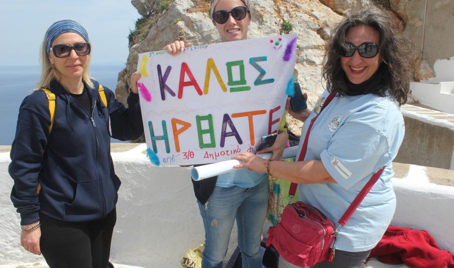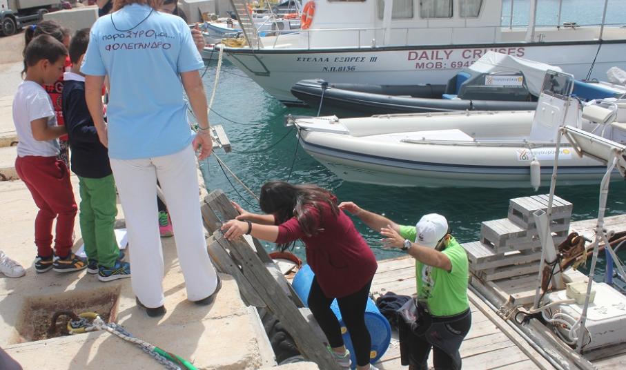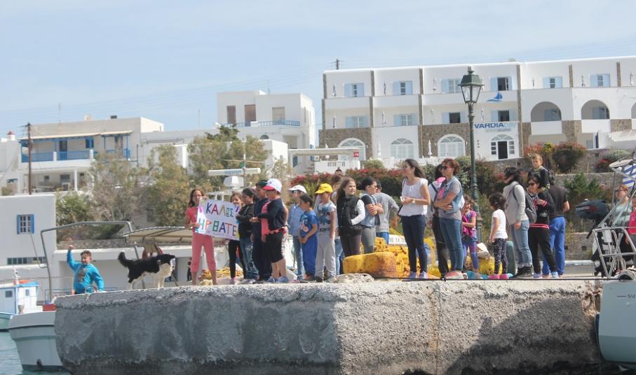 Λίγο πριν τις 11, μαθητές του τριθέσιου Δημοτικού Σχολείου Φολεγάνδρου, συνοδευόμενοι από εκπαιδευτικούς και γονείς, καλωσόρισαν τα πληρώματα στο λιμάνι του νησιού, χαρίζοντας τους απλόχερα χαμόγελα, αγκαλιές και ένα όμορφο πανό, το οποίο παρέλαβε η υπεύθυνη των παιδαγωγικών δράσεων, Χριστίνα Πρίντεζη.
