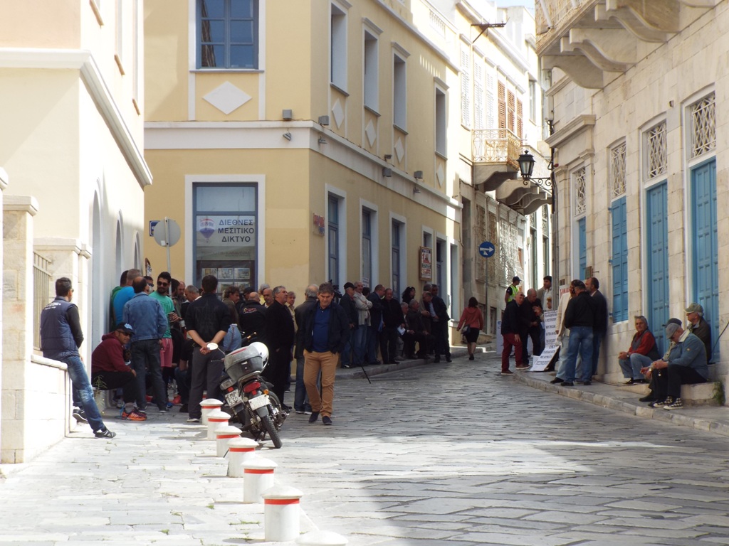Οι εργαζόμενοι μετά την ολοκλήρωση της συγκέντρωσης, κατευθύνθηκαν με πορεία στο λιμάνι και συγκεκριμένα στο ύψος της Αποκεντρωμένης Διοίκησης Αιγαίου, όπου και συνενώθηκαν με τους εργαζόμενους από το Σύλλογο Υπαλλήλων Αιρετής Περιφέρειας Νοτίου Αιγαίου, την Πρωτοβουλία Εργαζομένων Ανέργων Σύρου Μυκόνου, την ΕΛΜΕ Α’ Κυκλάδων, το Σύλλογο Δασκάλων και Νηπιαγωγών Σύρου – Τήνου – Μυκόνου, το παράρτημα του Πανελλαδικού Σωματείου Εργατών Μετάλλου, το Σωματείο Εργαζομένων της Αποκεντρωμένης Διοίκησης Αιγαίου, το Σωματείο Εργαζομένων Σούπερ Μάρκετ Νεωρίου, το Σωματείο Ιδιωτικών Υπαλλήλων Κυκλάδων και η τοπική διοικούσα της Πανελλήνιας Ένωσης Τεχνικών ΟΤΕ.