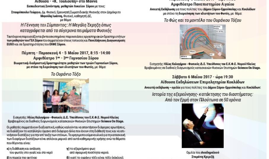 με σκοπό την ανάδειξη της σημασίας και του ρόλου των Φυσικών Επιστημών στην εκπαίδευση και την κοινωνία. Οι εκδηλώσεις θα πραγματοποιηθούν στη Σύρο από την Τετάρτη 03/05/2017 έως και το Σάββατο 06/05/2017, σύμφωνα με το παρακάτω πρόγραμμα: