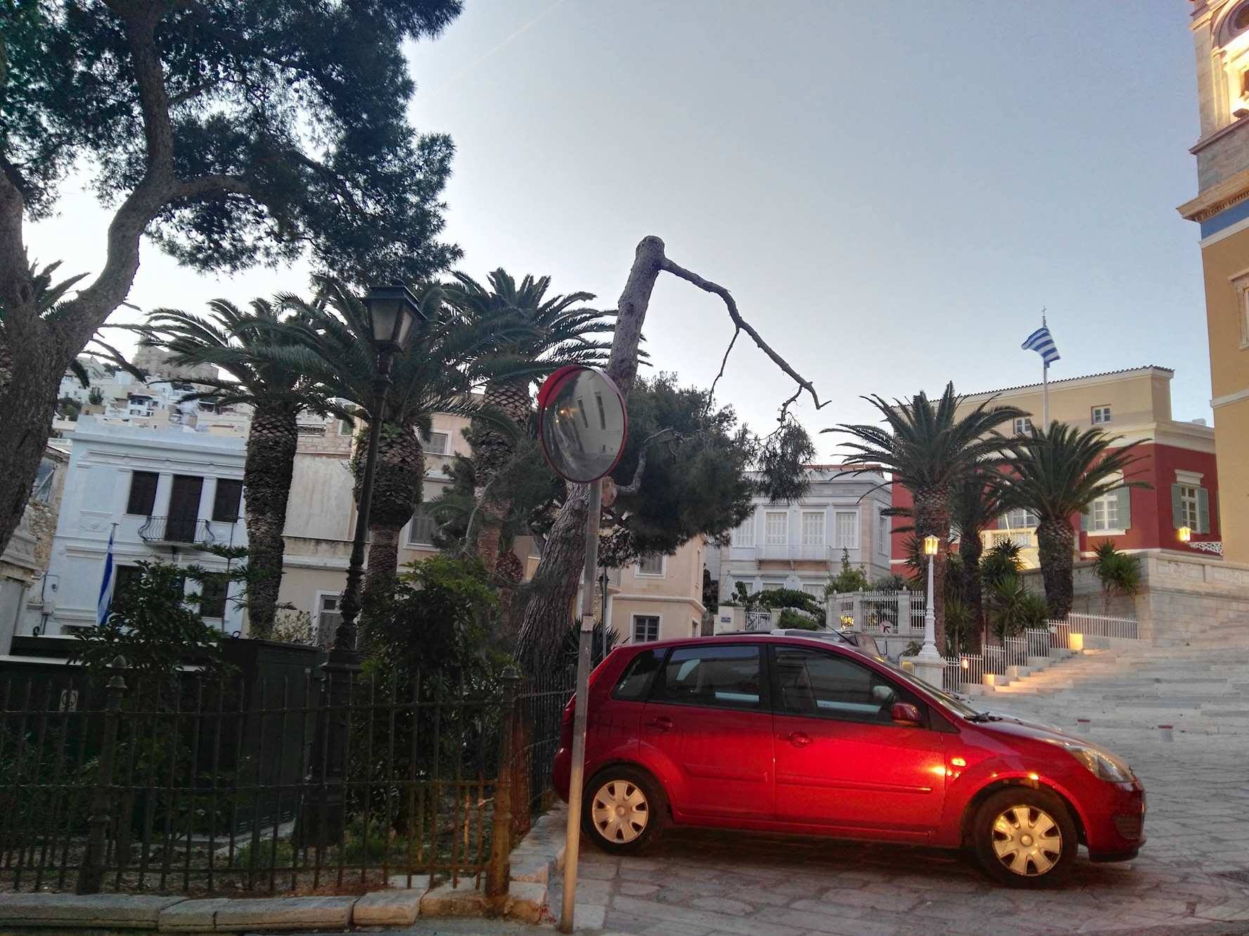Φωτιστικά ανενεργά καθ΄ όλη τη διάρκεια της νύχτας, όχι μόνον δεν αναδεικνύουν τον εσωτερικό κήπο με το αξιόλογο πρώτο μνημείο της πόλης, αλλά ταυτόχρονα, υποβαθμίζουν την εικόνα που συναντά κανείς διερχόμενος από την περιοχή όπου δεσπόζει ο επιβλητικός ναός της Ερμούπολης.
