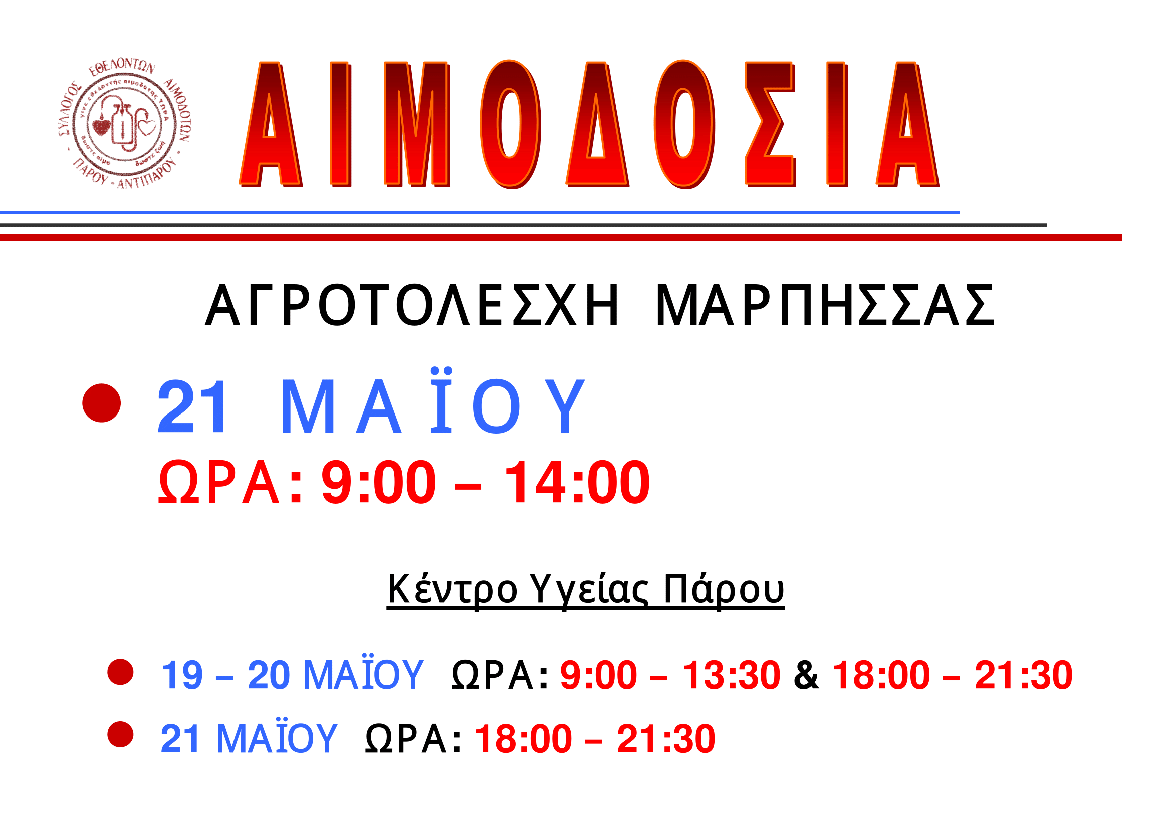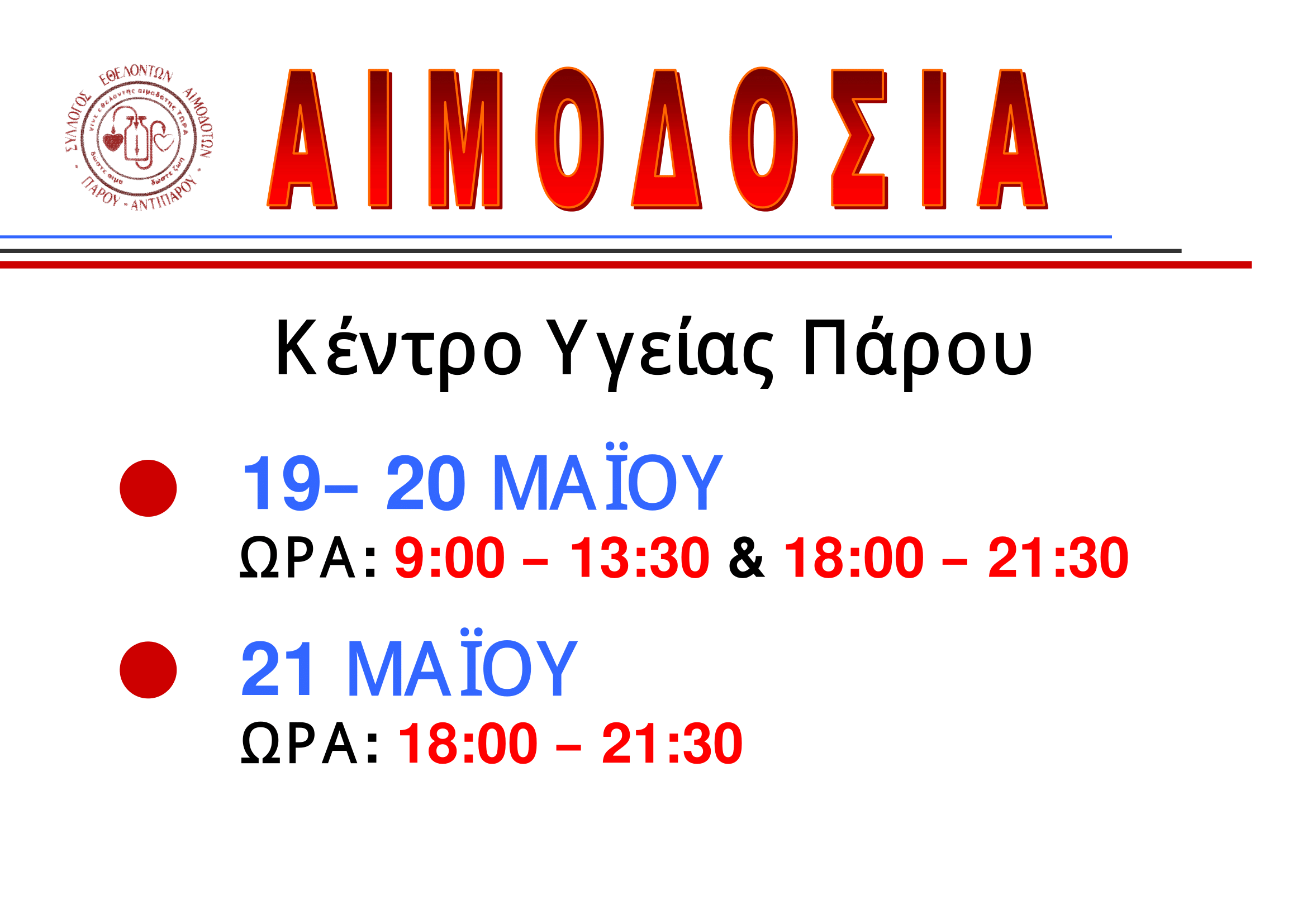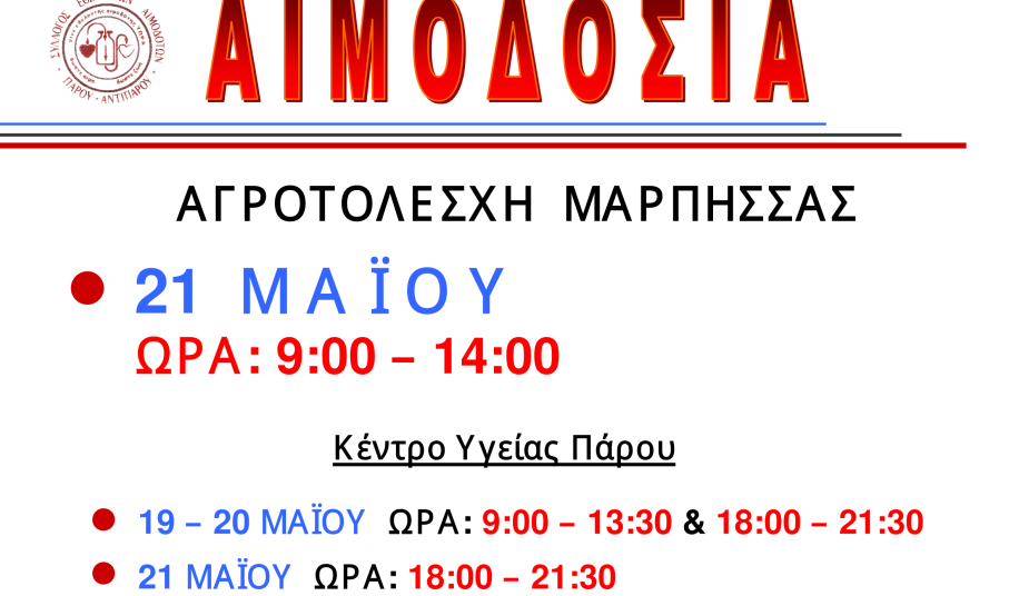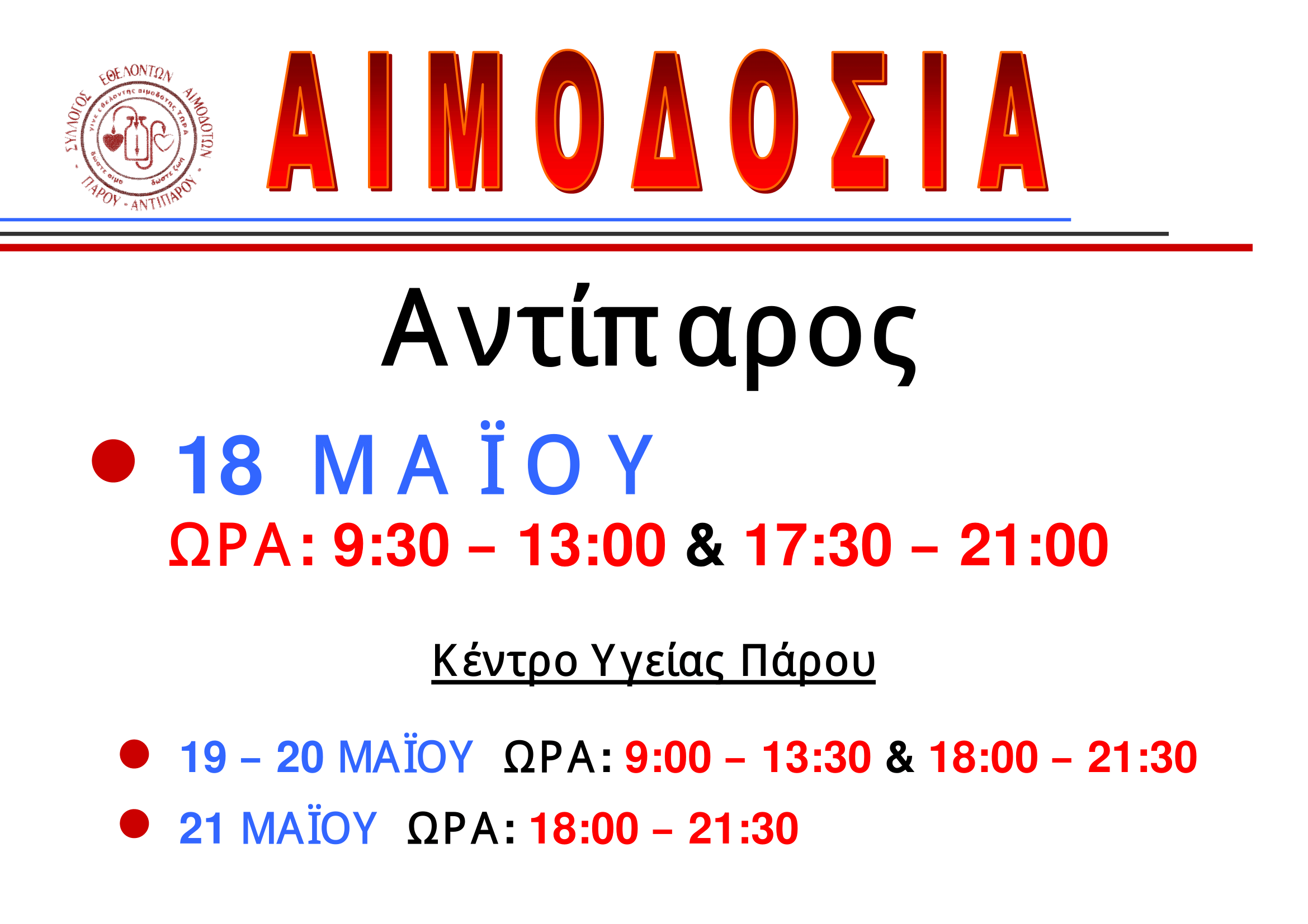 Ο Σύλλογος Εθελοντών Αιμοδοτών Πάρου-Αντιπάρου προσκαλεί όλα τα μέλη του στην εαρινή αιμοδοσία που θα πραγματοποιηθεί από το συνεργείο αιμοληψίας του Νοσοκομείου Παίδων « Αγία Σοφία».
