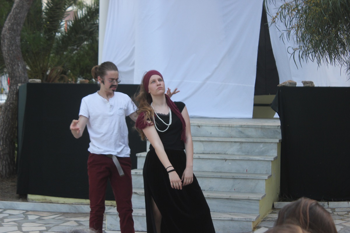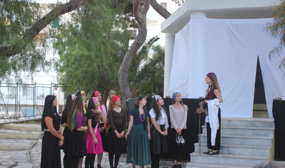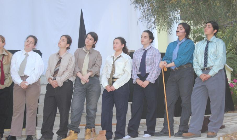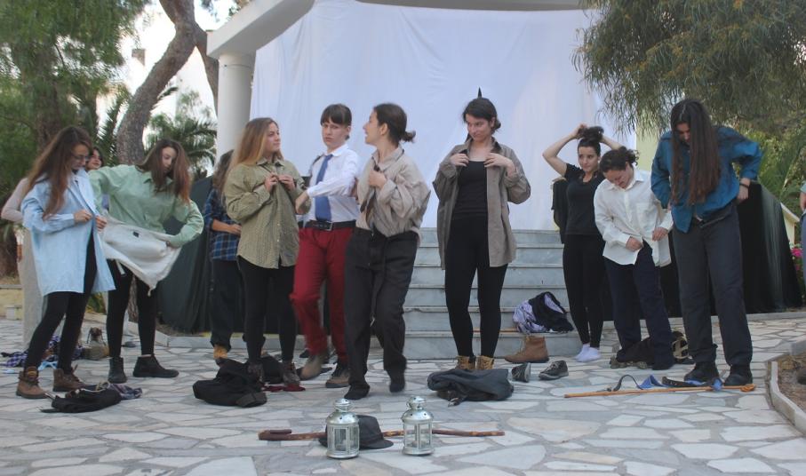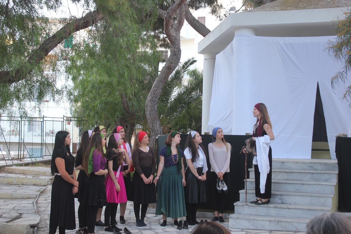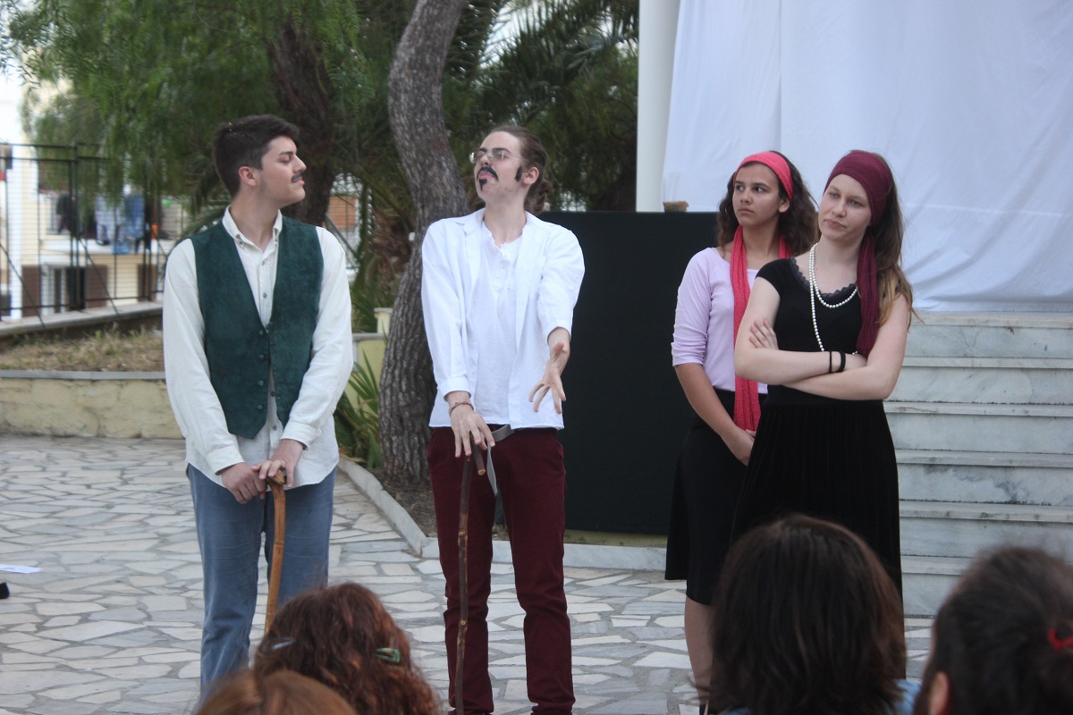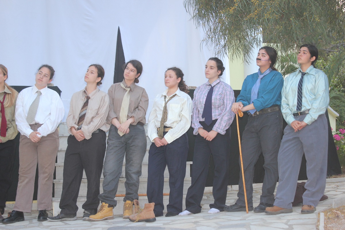 Στην παράσταση έπαιξαν οι μαθητές: Σελεστίνη Συνοδινού, Μαριαλένα Τσαντήλα, Αντώνης Κουβαλάκης, Νικήτας Χρήστου, Άννα Κορωναίου, Μαριαλένα Τσαντήλα, Αντωνία Χαλαβαζή, Ναυσικά Γκοτζαμάνη, Αντωνία Ρηγούτσου, Μαρία Στεφάνου, Μίνα Κατσάβη, Κατερίνα Μπούρα, Μυρσίνη Τζαβάρα, Ελπίδα Ξαγοράρη, Κατερίνα Μπούρα, Έλενα Μπραζόλα – Μπαχαράκη & Ελίζα Καζόλη. Κορυφαίες στον χορό η Μυρσίνη Τζαβάρα και η Ελπίδα Κόνταρη. Το έργο παρουσιάστηκε με δύο διαφορετικές διανομές.