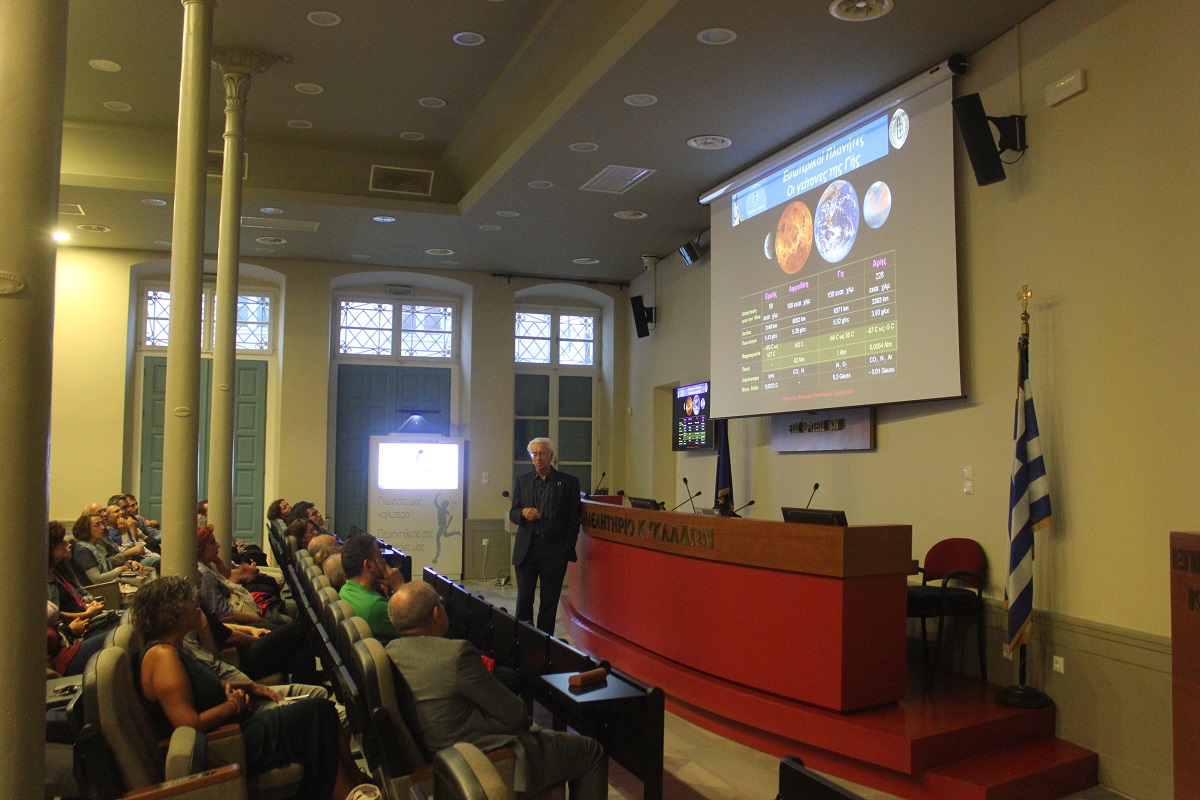 Στην ανοιχτή εκδήλωση, όπου παρέστησαν εκπρόσωποι της εκπαίδευσης, επιστήμονες και πολίτες του νησιού, ο Επόπτης του Γραφείου Διαστημικής Έρευνας και Τεχνολογίας της Ακαδημίας Αθηνών και Ομότιμος Διευθυντής του Κέντρου Διαστημικής Έρευνας του Πανεπιστημίου Johns Hopkins, κ. Κριμιζής, εστίασε στην «Ιστορία της εξερεύνησης – κατάκτησης του διαστήματος: Από τον Ερμή στον Πλούτωνα σε 50 χρόνια».