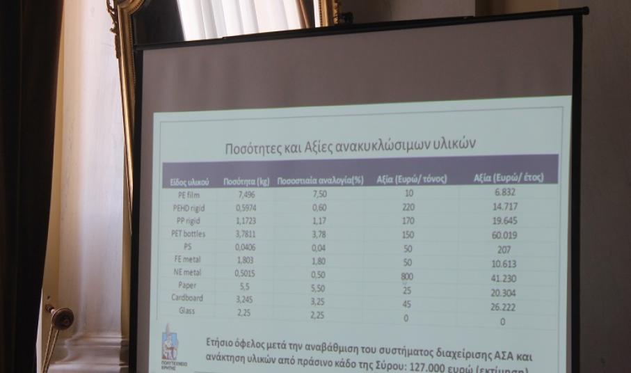 Επικεντρώνοντας την αναφορά του στα ανακυκλώσιμα υλικά που ανακτήθηκαν από τη διαδικασία που προαναφέρθηκε, ο κ. Γκίκας τόνισε μεταξύ άλλων, πως διαπιστώθηκε ότι αυτά αφορούσαν σε 25% χαρτί, 3% αλουμίνιο, 11% σίδηρο, διάφορα films 27% (κυρίως πλαστικές σακούλες), γυαλί 8%, πλαστικά μπουκάλια 13% κ.α.. Εξήγησε δε, πως τα δεδομένα είναι διαφορετικά ανάμεσα σε χωριά και πόλη, αφού στους κάδους των χωρικών ορίων της, ενδεικτικά ανέφερε πως η διαπίστωση χαρτοκιβωτίων και χαρτιού είναι πολύ υψηλότερη, αφού σαφώς συνδέεται και με τη δραστηριότητα εμπορικών κι επιχειρήσεων. “Έχουμε ένα αρκετά μεγάλο ποσοστό χαρτί και χαρτόνια, δηλαδή ένα 11% στην Ερμούπολη, ενώ εκτός πόλης ένα ποσοστό 5%” ανέφερε σχετικά, παραπέμποντας στη συνέχεια στον πίνακα που συμπεριλαμβάνεται στο άρθρο και αποτυπώνει το συνολικό όφελος για τη Σύρο και τον Δήμο, από την αξιοποίηση των ποσοτήτων ανακυκλώσιμων υλικών που κρύβεται στους κάδους απορριμμάτων, μετά την αναβάθμιση του συστήματος διαχείρισης ΑΣΑ, καθώς συμπεριλαμβάνεται και η αξία τους. Γίνεται σαφής λόγος για δυνατότητα οικονομικού οφέλους του Δήμου κατά 127.000 ευρώ.