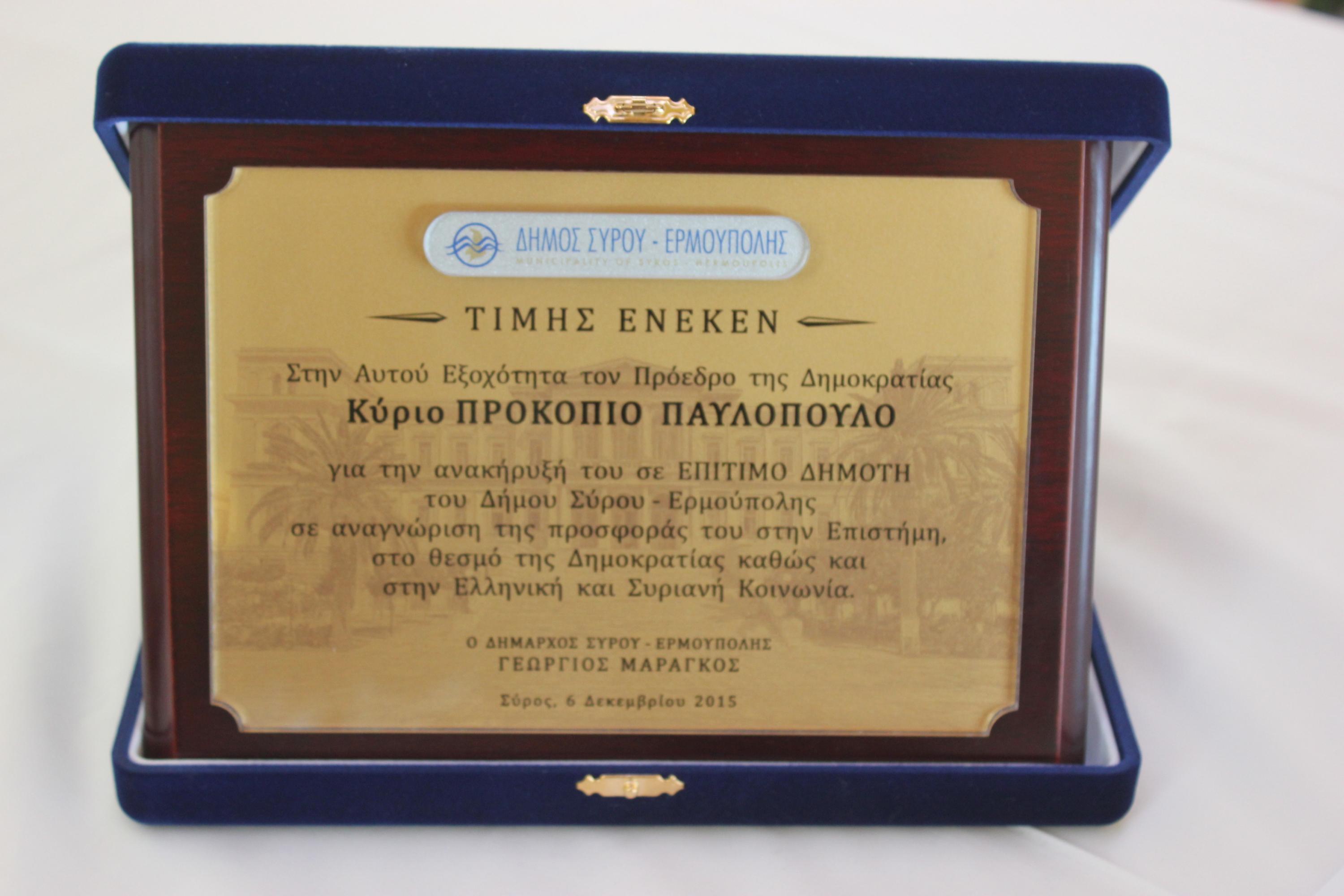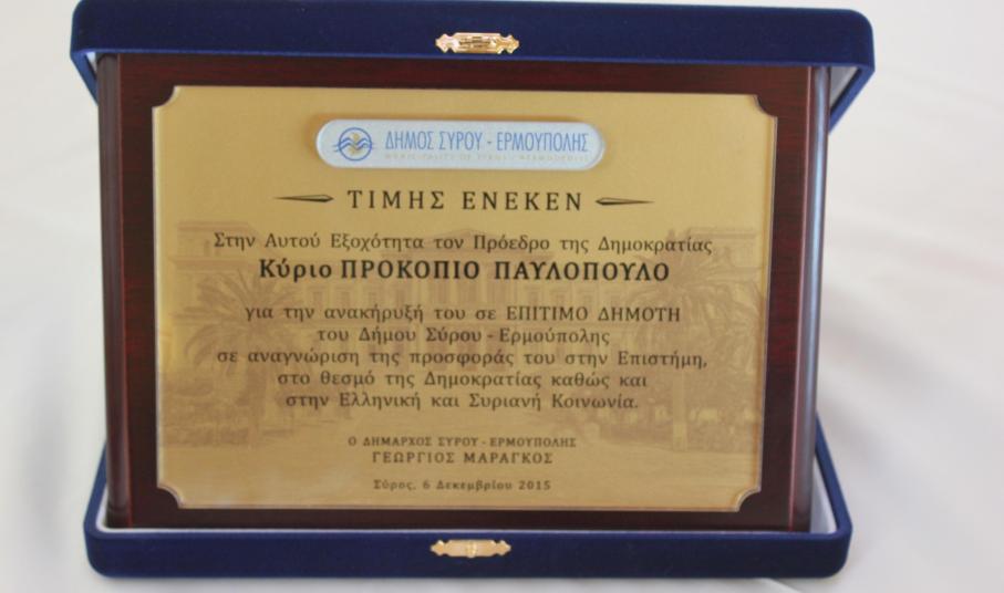 Με πάσα επισημότητα όπως αρμόζει στο θεσμό του Προέδρου της Δημοκρατίας ανακηρύχθηκε σε επίτιμο δημότη Σύρου – Ερμούπολης ο κ. Προκοπής Παυλόπουλος με ομόφωνη απόφαση των μελών του δημοτικού συμβουλίου παρουσία εκπροσώπων των Αρχών του τόπου και της Περιφέρειας Νοτίου Αιγαίου.