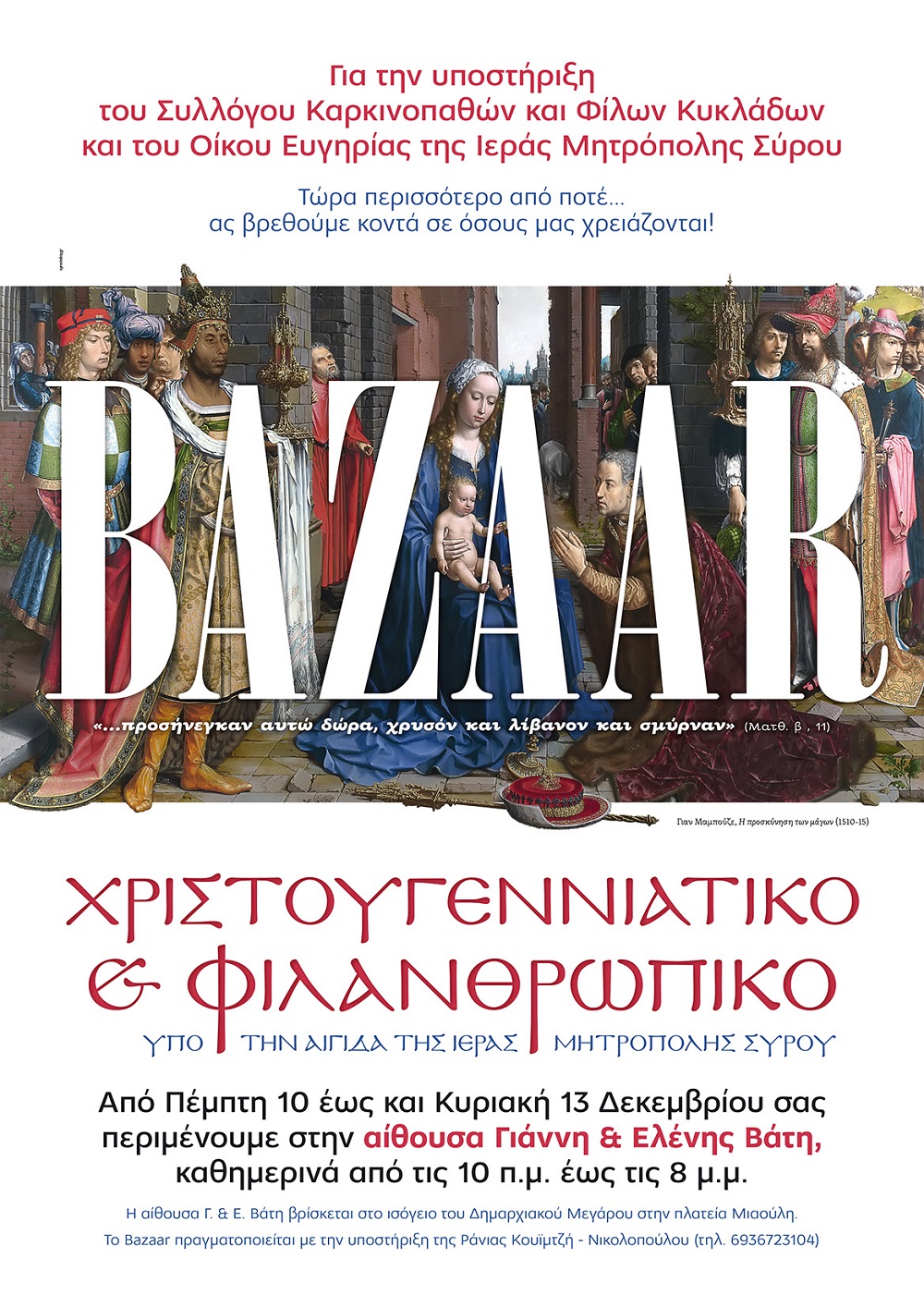 Όσοι επιθυμούν να επισκεφθούν το bazaar μπορούν να μεταβαίνουν στον χώρο καθημερινά από τις 10 το πρωί έως τις 8 το απόγευμα. Φέτος τα έσοδα που θα συγκεντρωθούν θα αποδοθούν προς οικονομική ενίσχυση του Συλλόγου Καρκινοπαθών και Φίλων Κυκλάδων αλλά και του Οίκου Ευγηρίας της Ιεράς Μητρόπολης Σύρου.